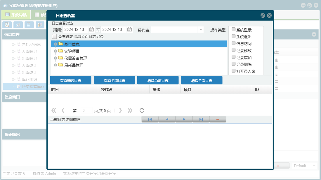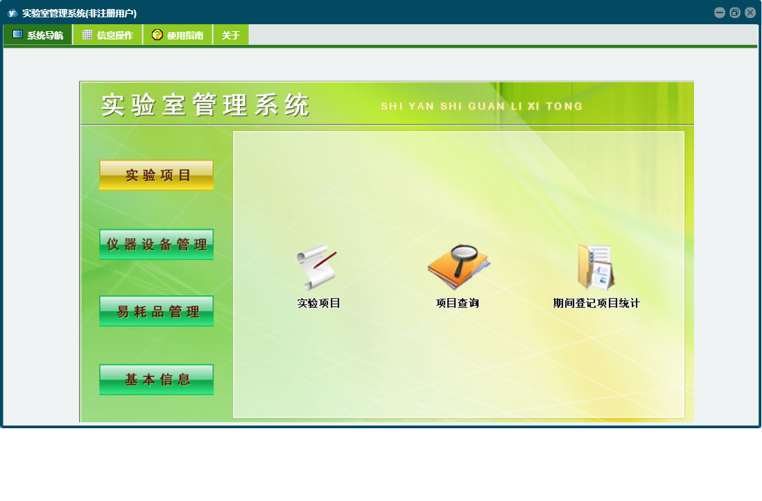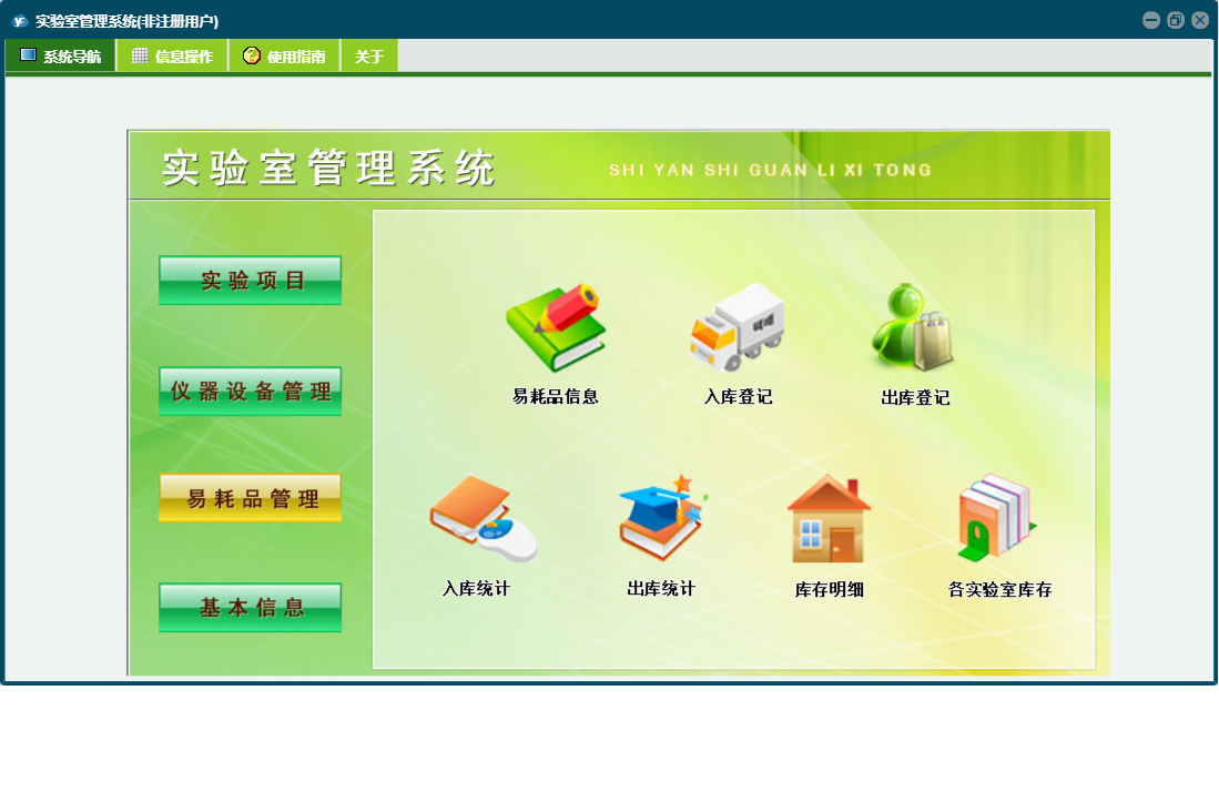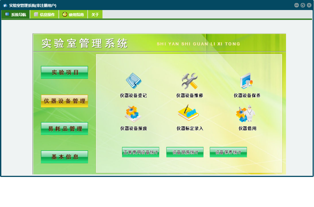实验室管理系统包含以下功能:实验项目、仪器设备登记、入库登记、出库登记、仪器标定录入、日志、仪器设备维修、仪器借用、仪器设备管理、关于、权限设置、基本信息、易耗品管理、仪器设备报废、易耗品信息、仪器设备保养、人员信息等