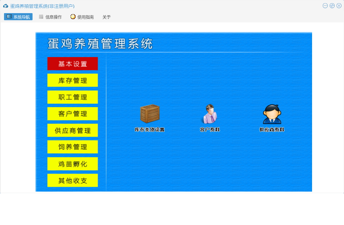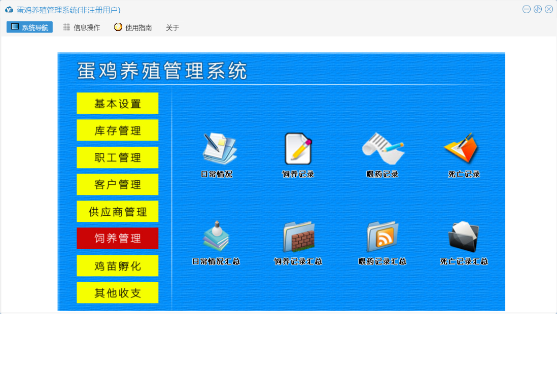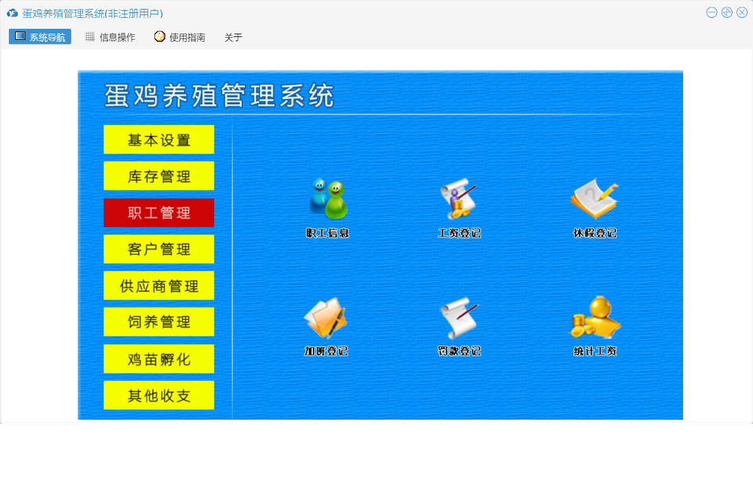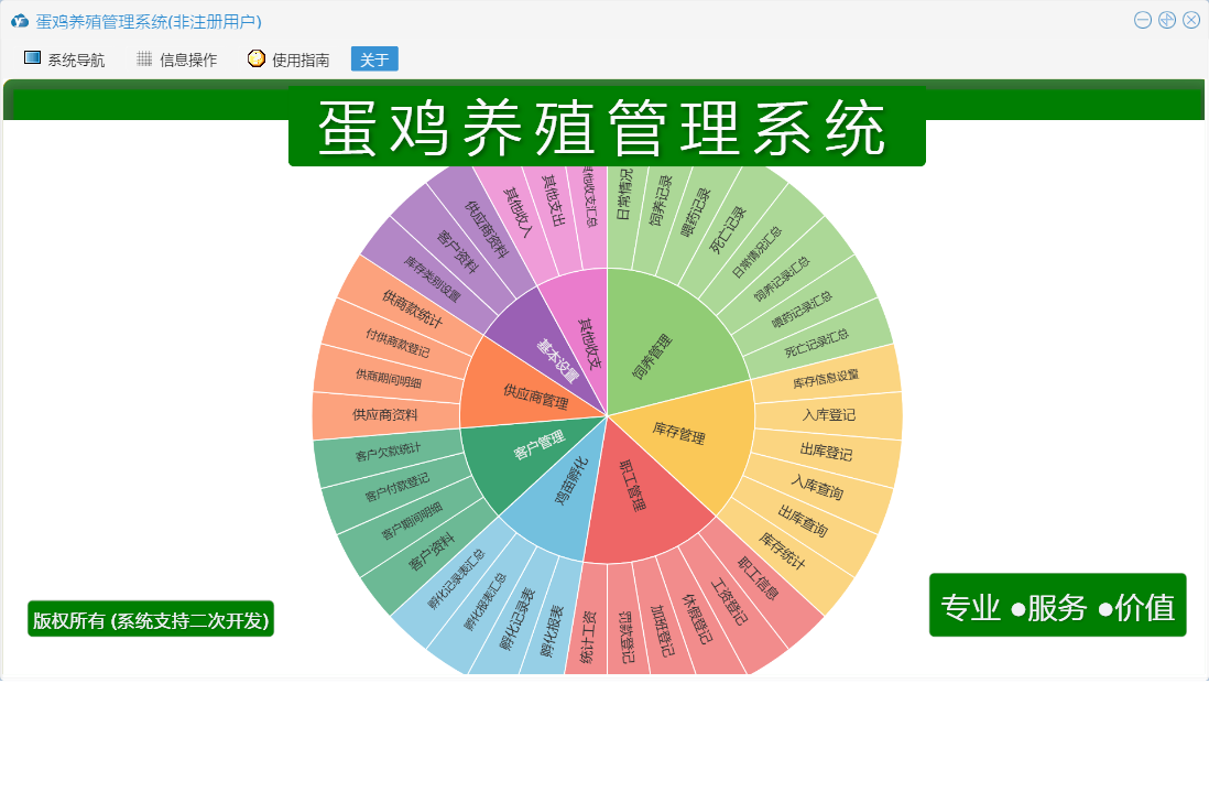 蛋鸡养殖管理系统包含以下功能:职工信息、供应商资料、日常情况、基本设置、孵化、罚款登记、出库登记、其他收入、职工管理、死亡记录、喂药记录、工资登记、其他支出、入库登记、客户管理、休假登记、饲养记录、权限设置、孵化记录表、鸡苗孵化、客户付款登记、库存信息设置、库存管理、关于、饲养管理、客户资料、供应商管理、加班登记、其他收支、日志、付供商款登记等
