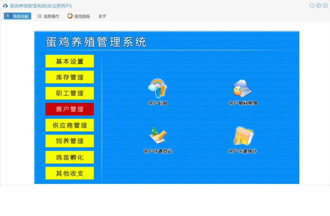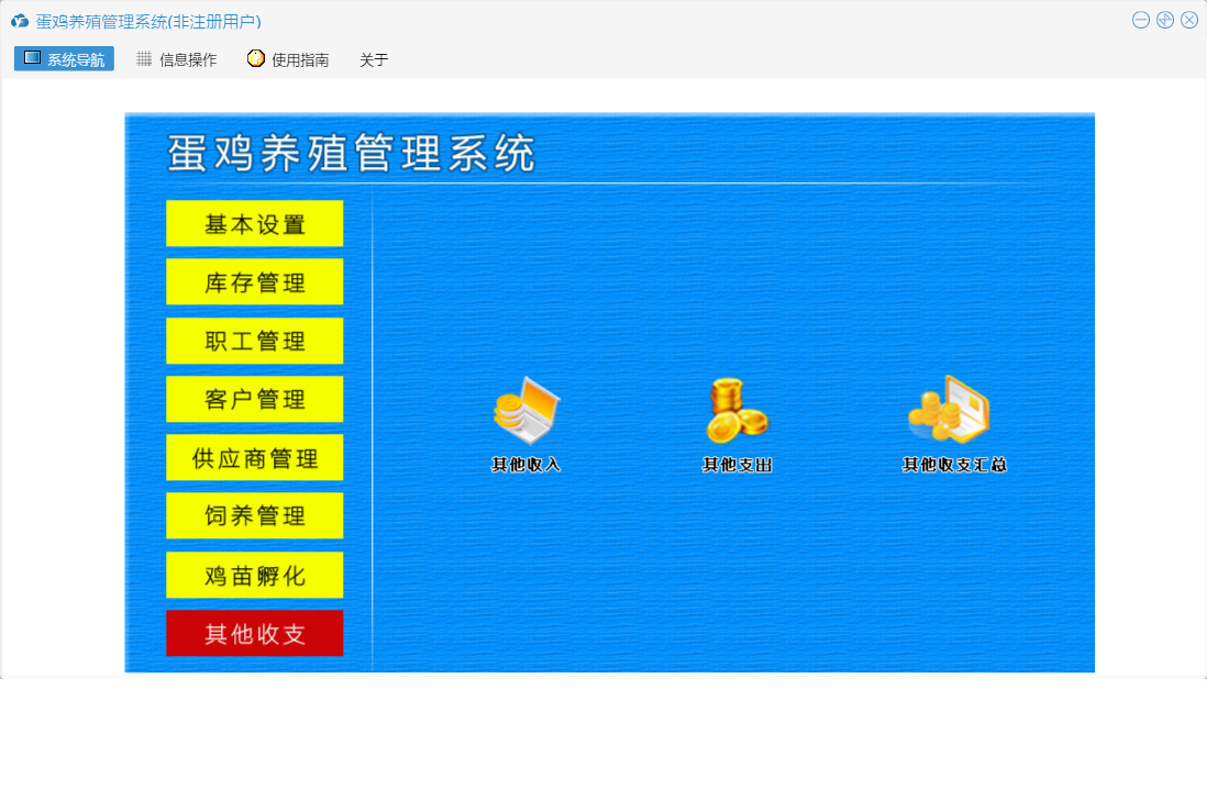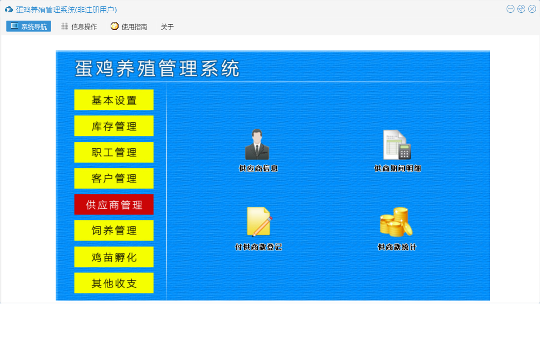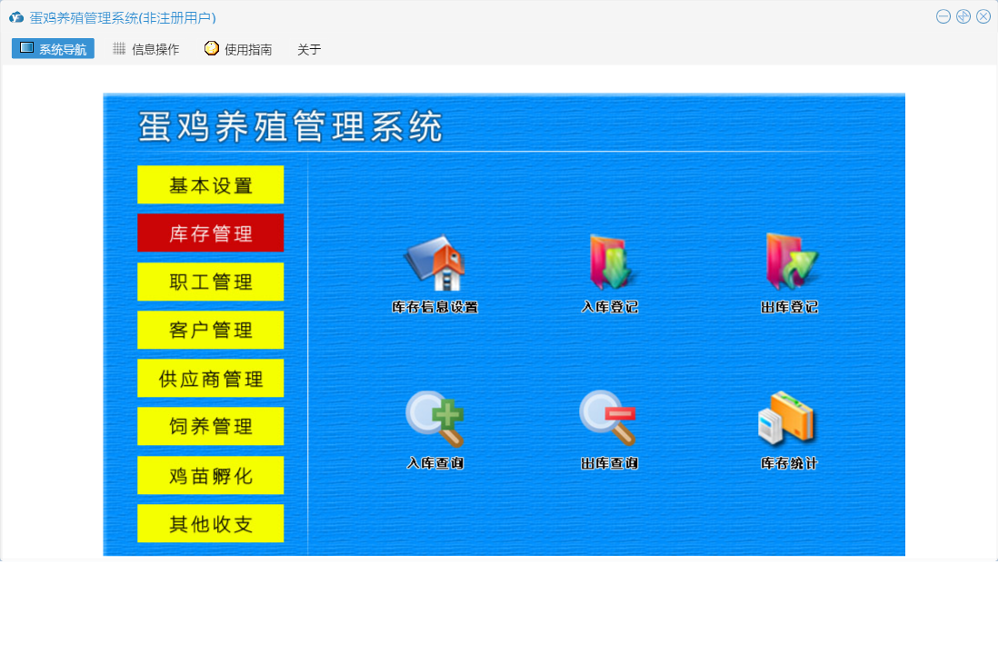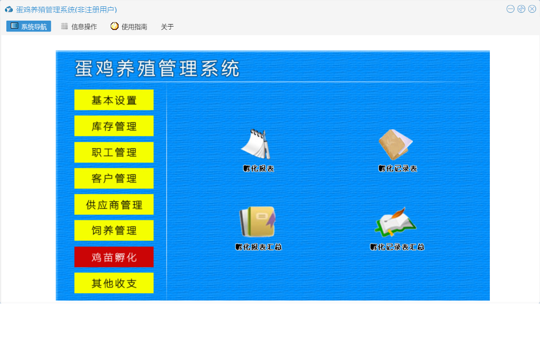 蛋鸡养殖管理系统包含以下功能:职工信息、供应商资料、日常情况、基本设置、孵化、罚款登记、出库登记、其他收入、职工管理、死亡记录、喂药记录、工资登记、其他支出、入库登记、客户管理、休假登记、饲养记录、权限设置、孵化记录表、鸡苗孵化、客户付款登记、库存信息设置、库存管理、关于、饲养管理、客户资料、供应商管理、加班登记、其他收支、日志、付供商款登记等