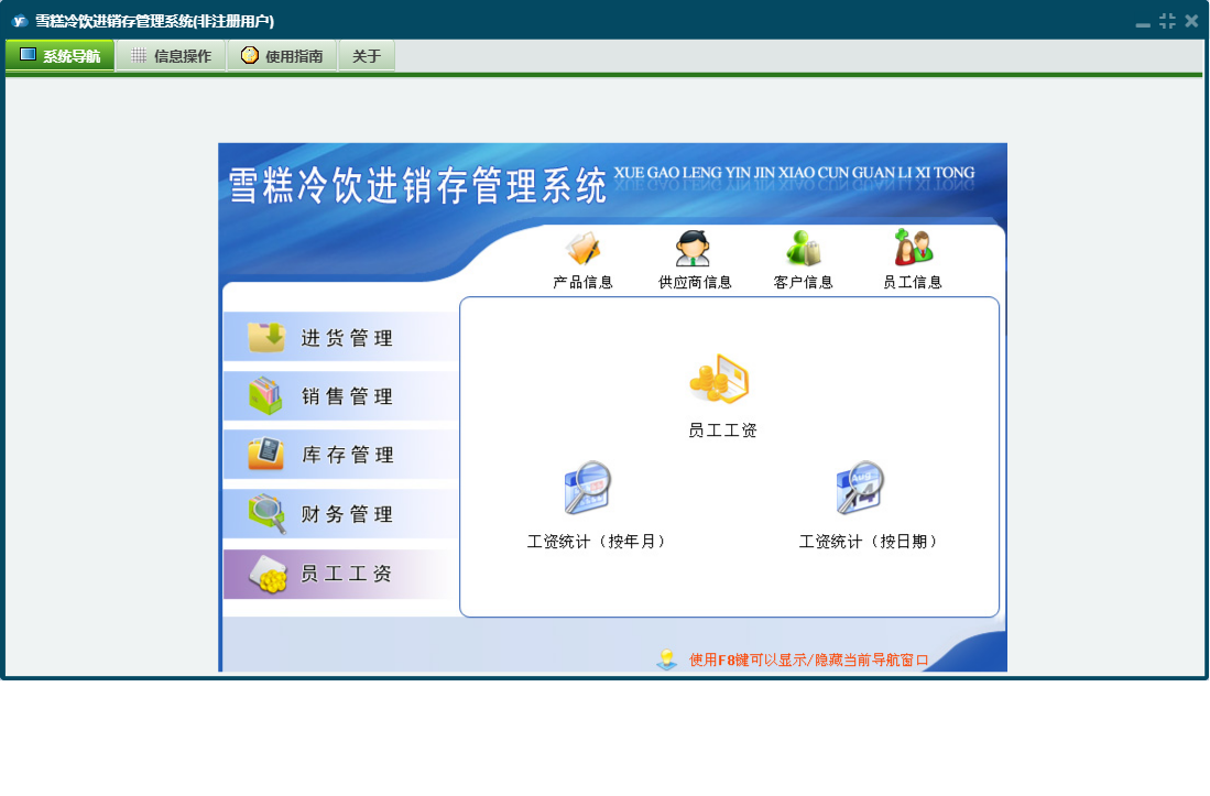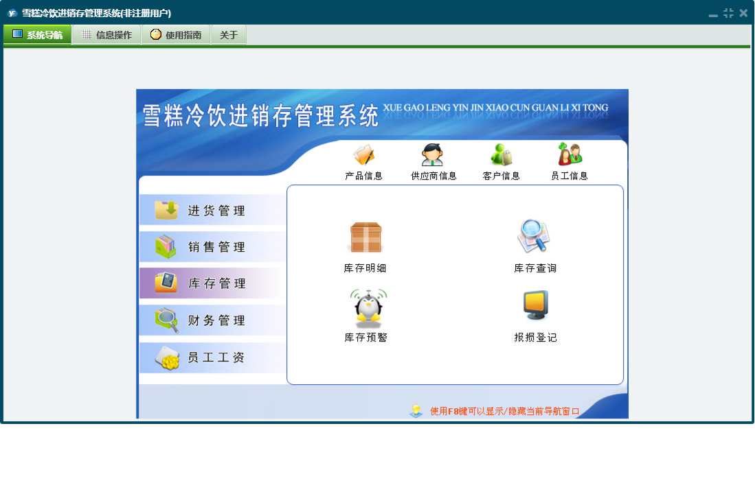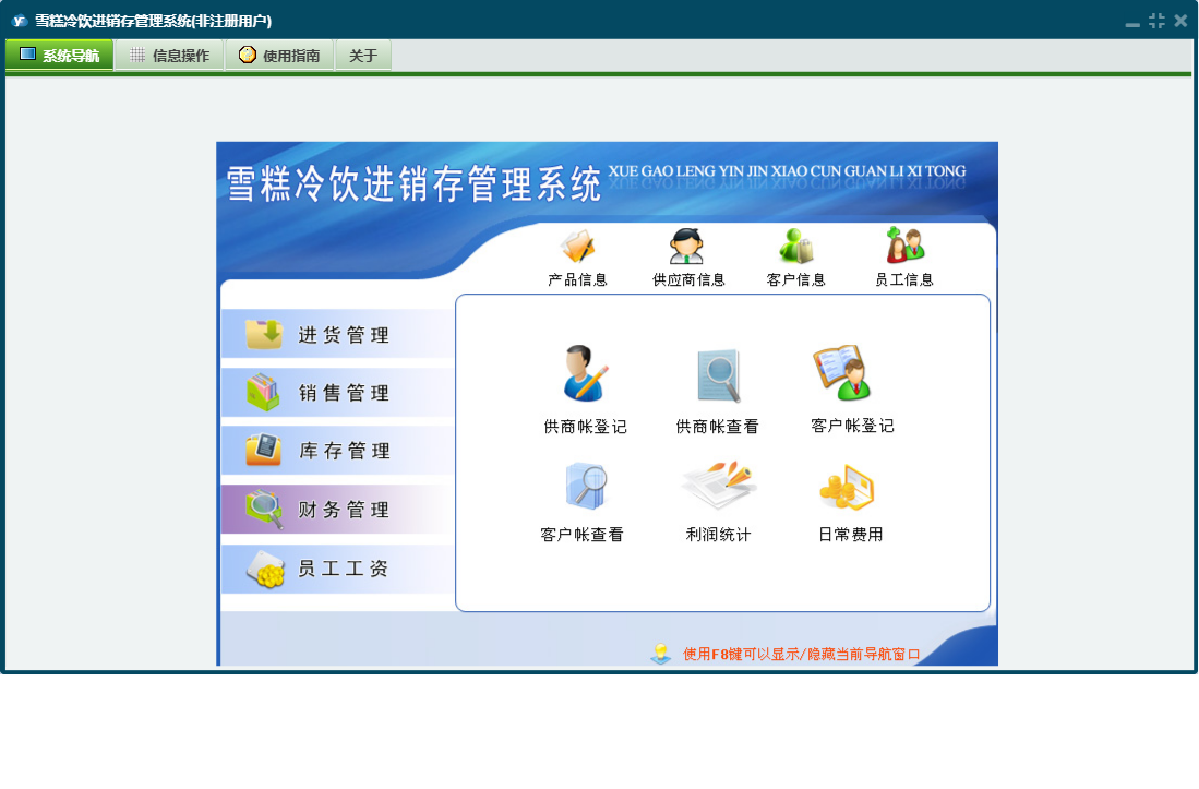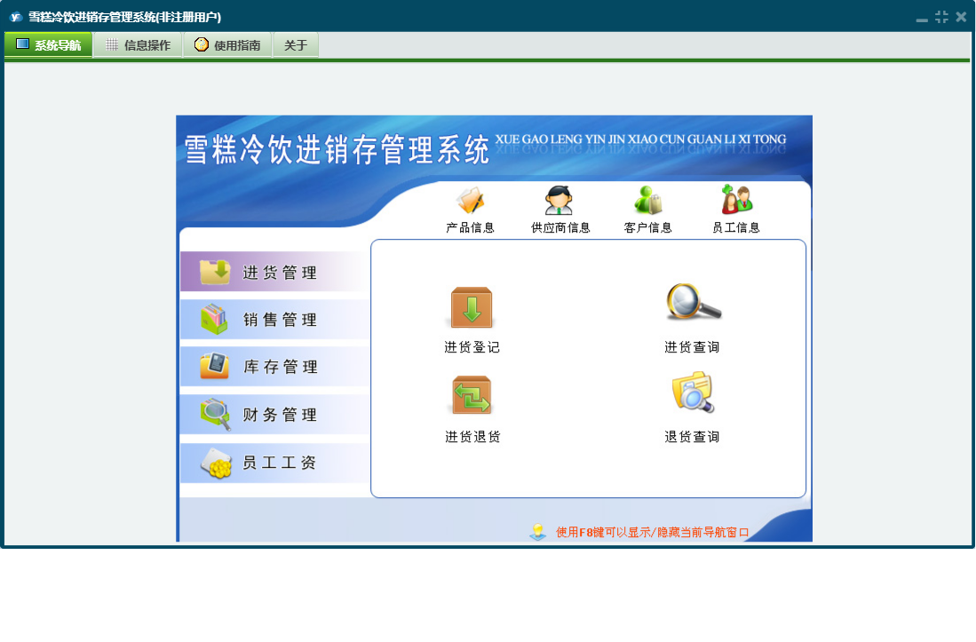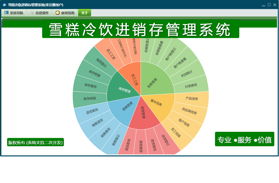 雪糕冷饮进销存管理系统包含以下功能:进货退货、1、产品信息、2、客户账登记、报损登记、销售退货、权限设置、进货登记、3、供应商信息、员工工资、5、关于、销售登记、客户信息、供商账登记、员工信息、日常费用、日志、4等