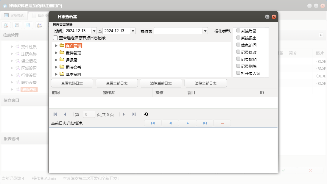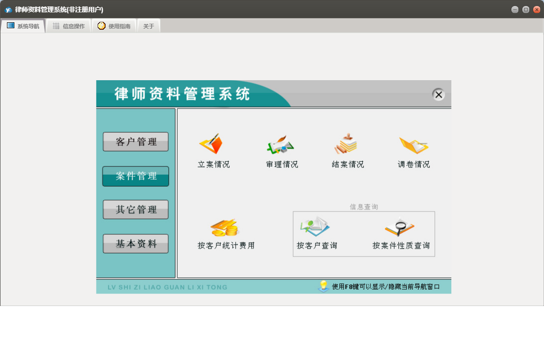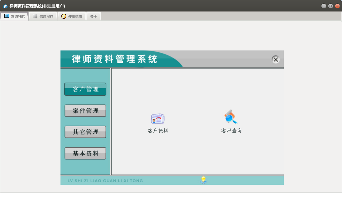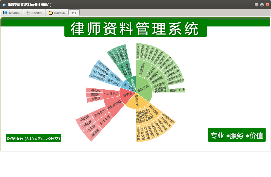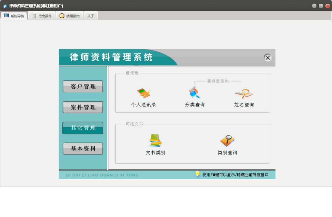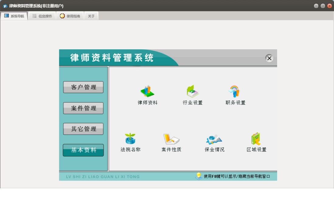 律师资料管理系统包含以下功能:案件管理、行业设置、审理情况、文书类别、职务设置、分类查询、客户管理、区域设置、权限设置、法院名称、结案情况、姓名查询、律师资料、客户查询、案件性质、关于、基本信息、其他管理、客户资料、保全情况、立案情况、日志、调卷情况、个人通讯录、类别查询等