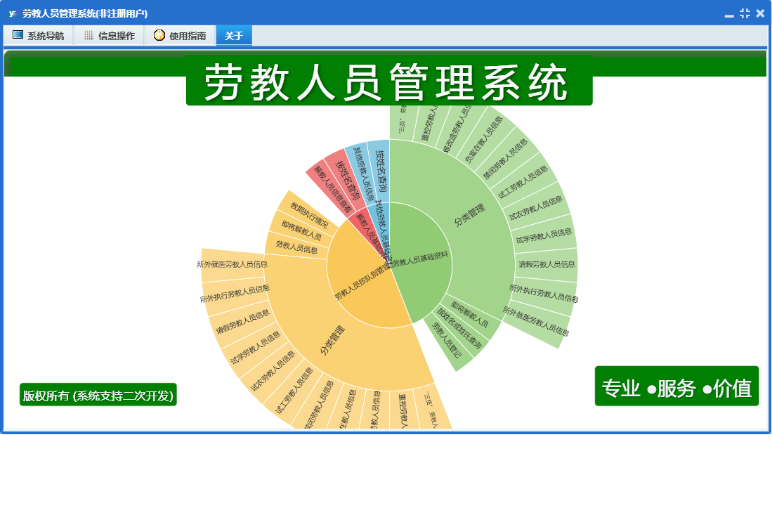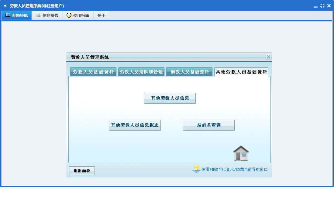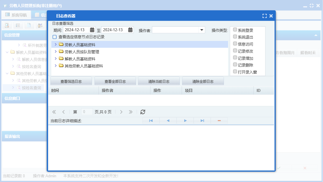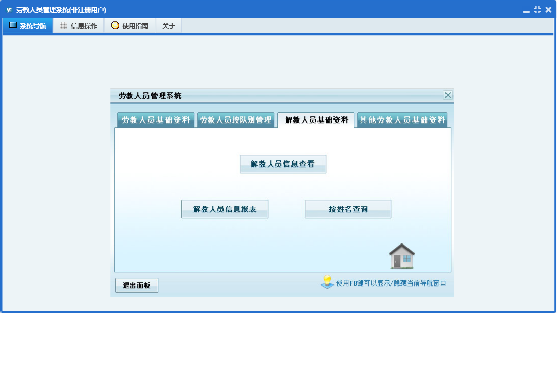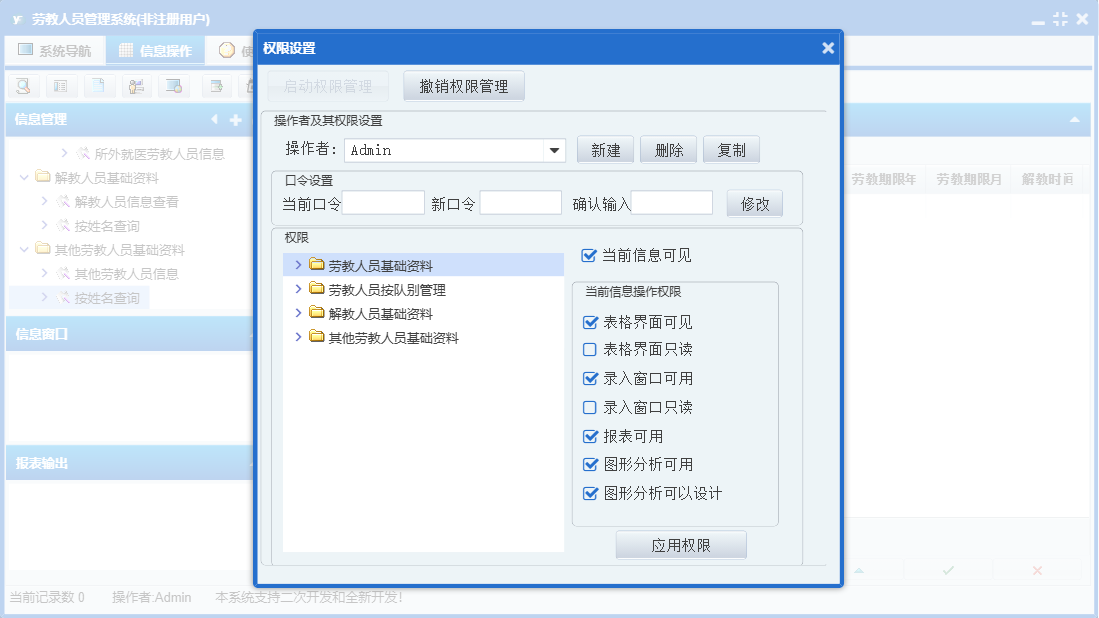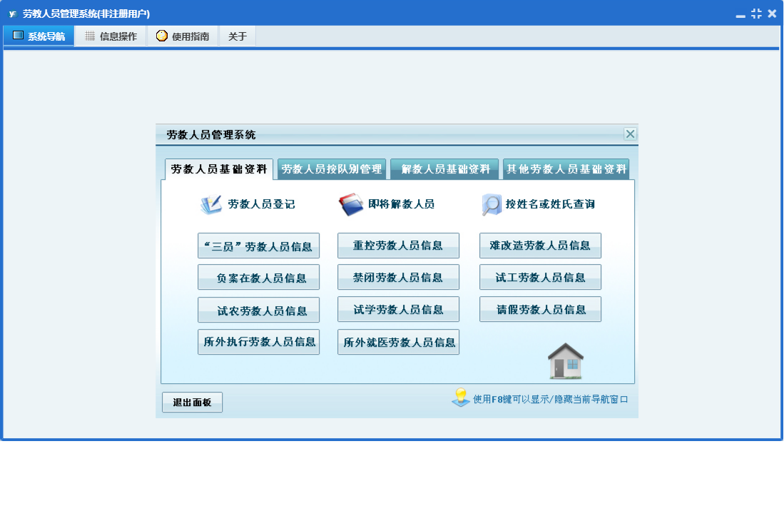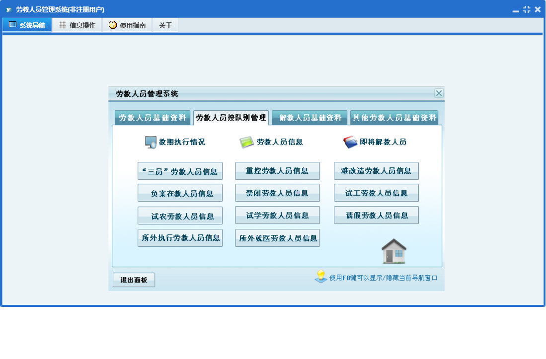 劳教人员管理系统包含以下功能:队别、解教、其他、劳教人员登记、其他劳教人员信息、劳教人员信息、解教人员信息查看、日志、关于、权限设置、主面板等