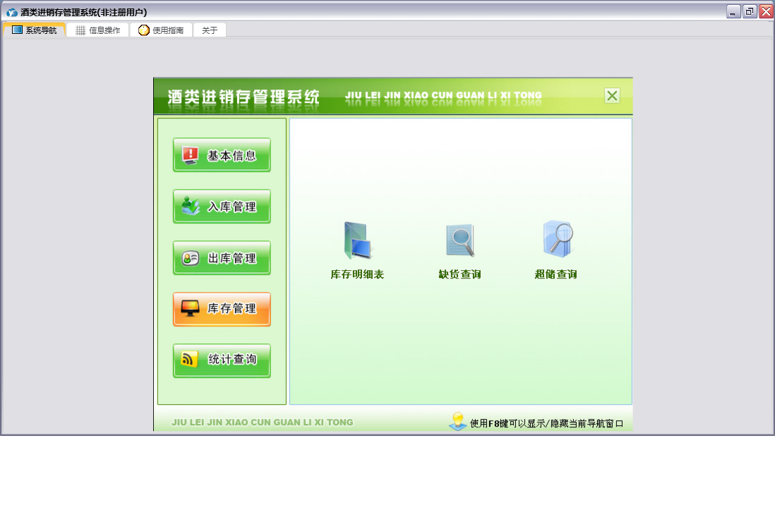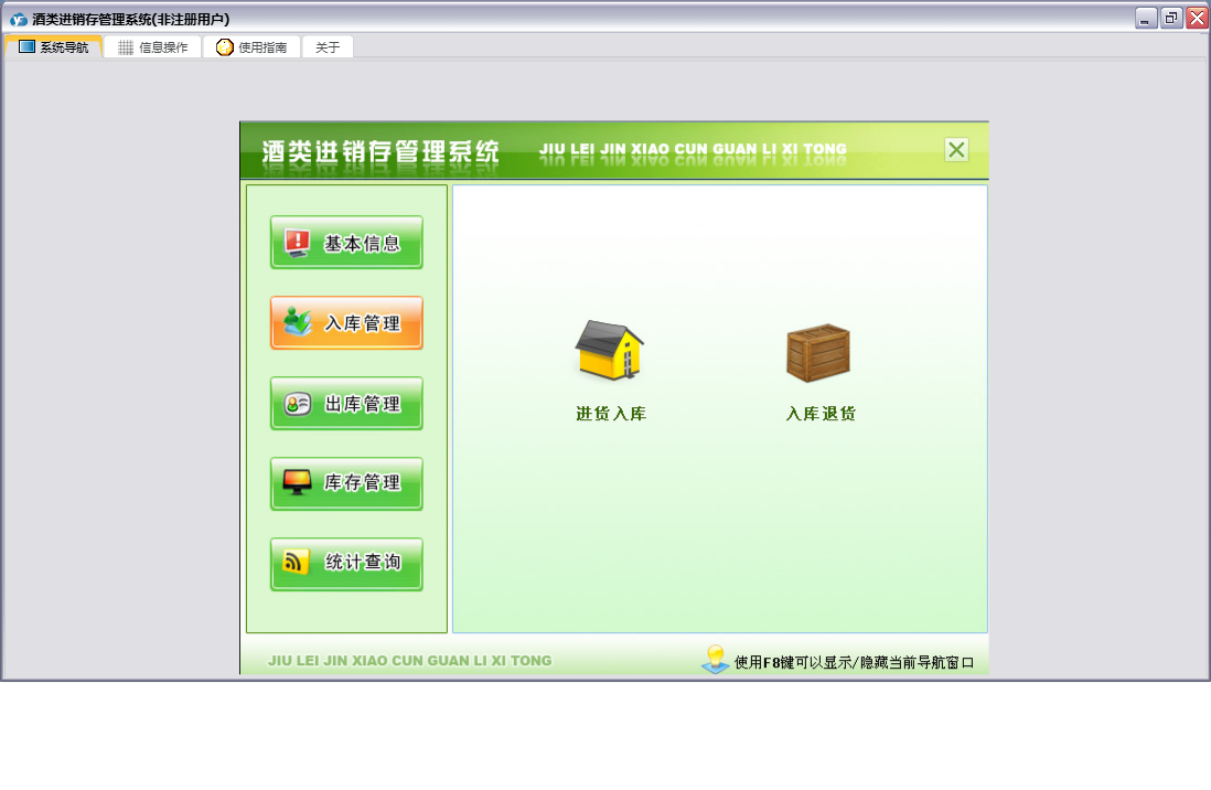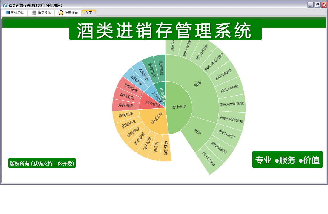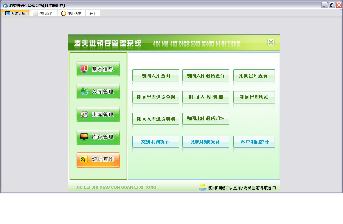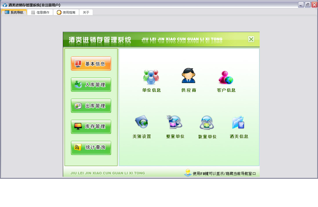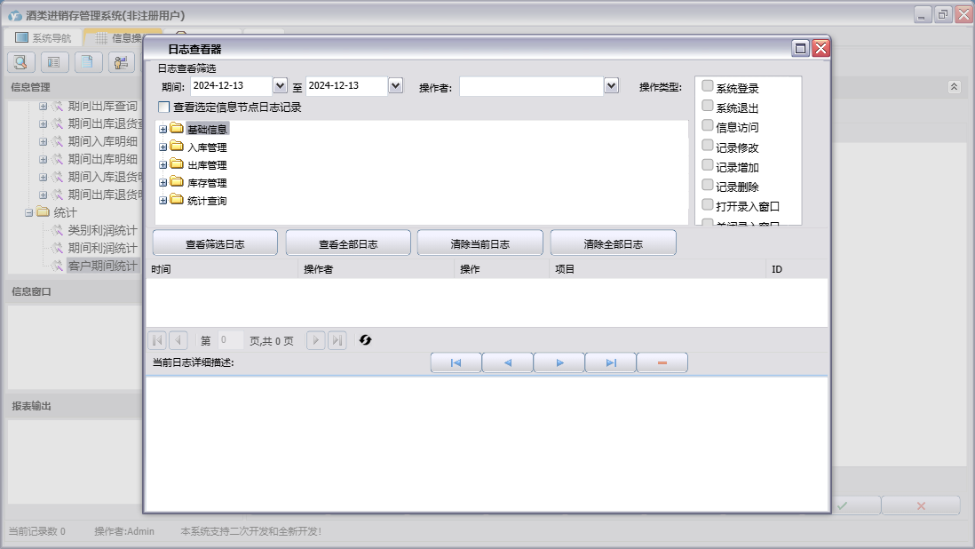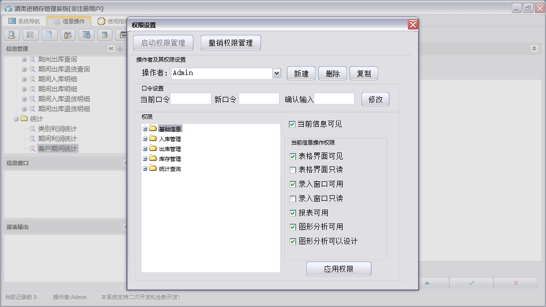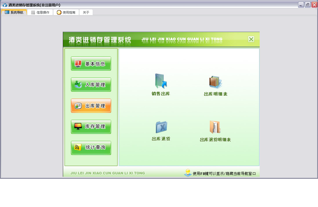 酒类进销存管理系统包含以下功能:出库管理、类别设置、入库退货、基础信息、入库管理、单位信息、酒类信息、日志、库存管理、关于、权限设置、出库退货、销售出库、统计查询、客户信息、供应商、进货入库等