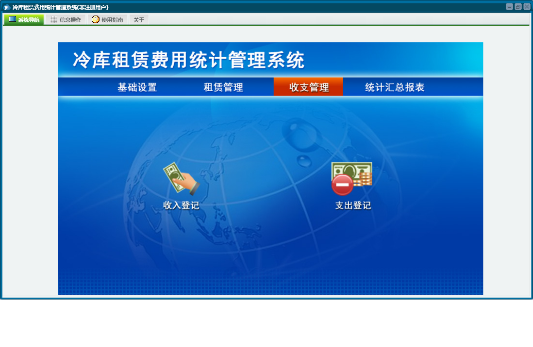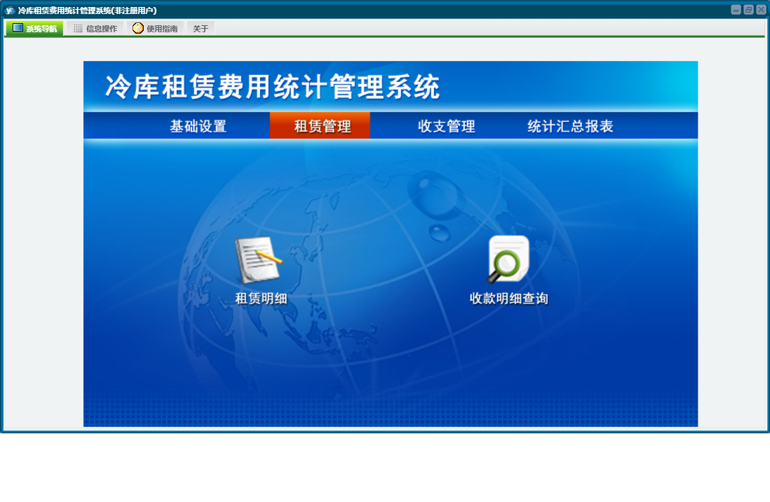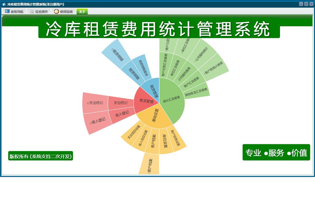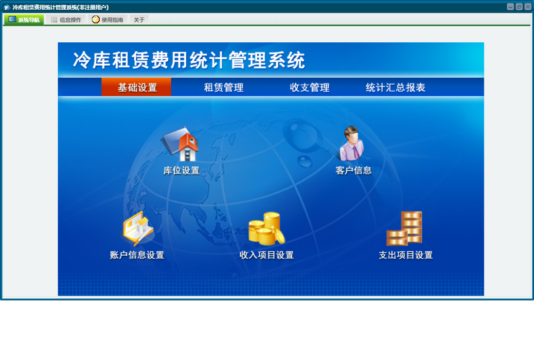冷库租赁费用统计管理系统包含以下功能:基础设置、客户档案、租赁明细、支出登记、收入登记、日志、租赁管理、关于、权限设置、收支管理、统计汇总等