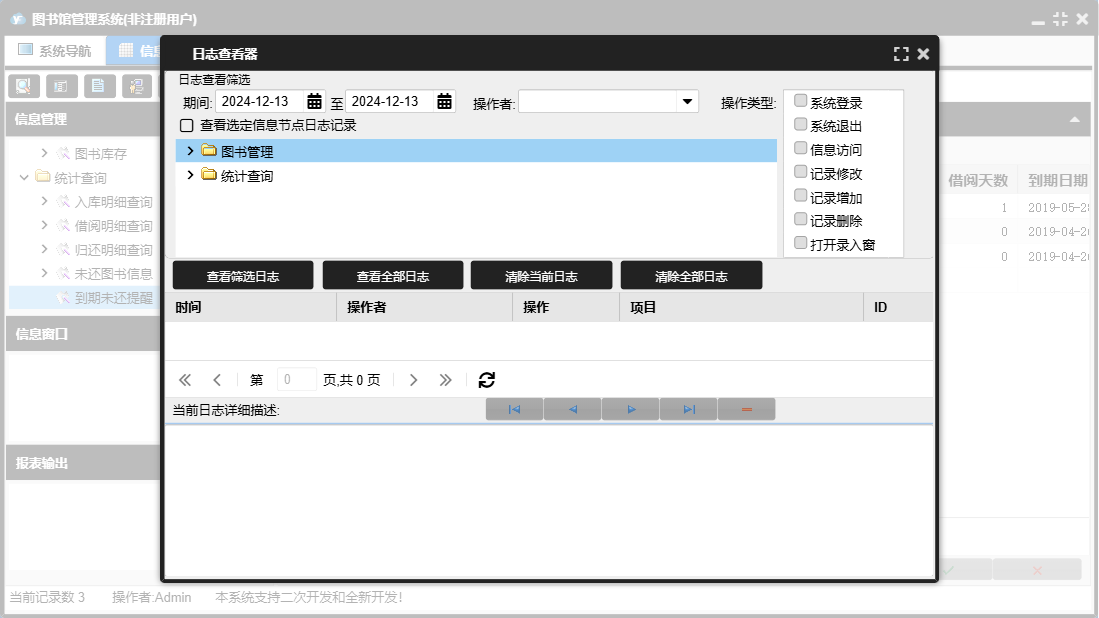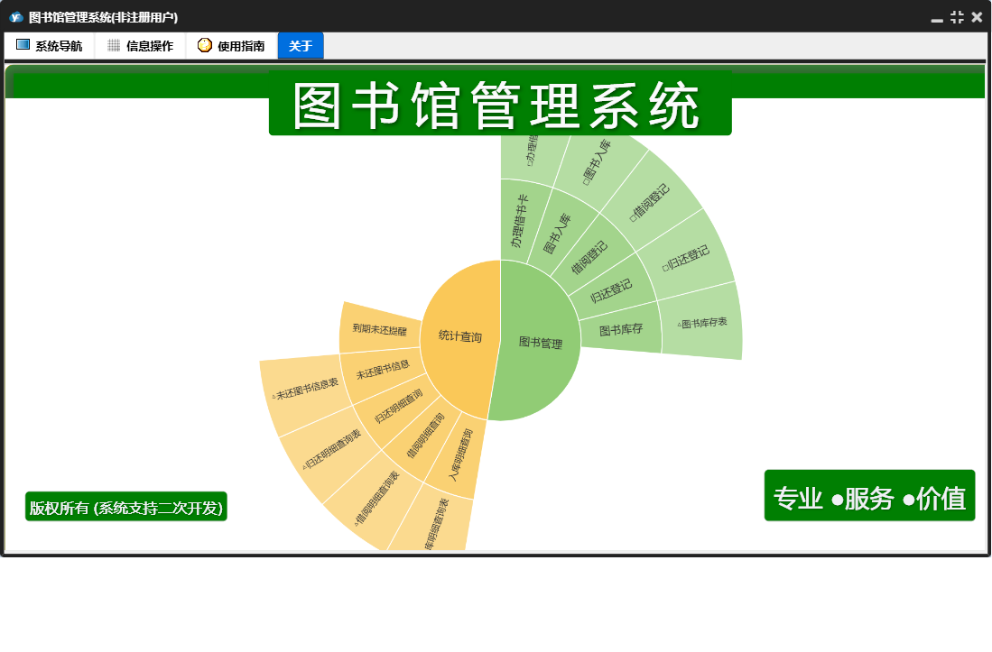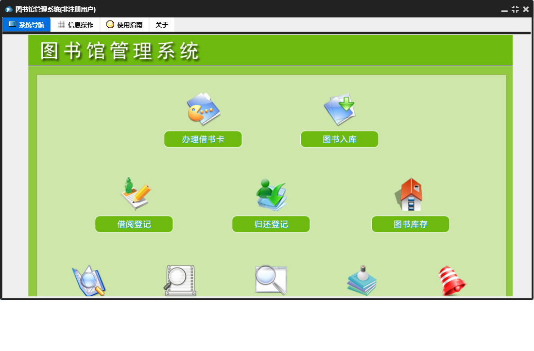 图书馆管理系统包含以下功能:图书入库、借阅登记、归还登记、日志、关于、权限设置、办理借书卡、业务管理等