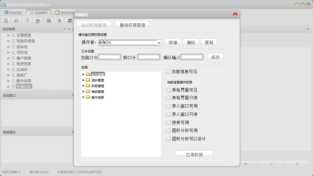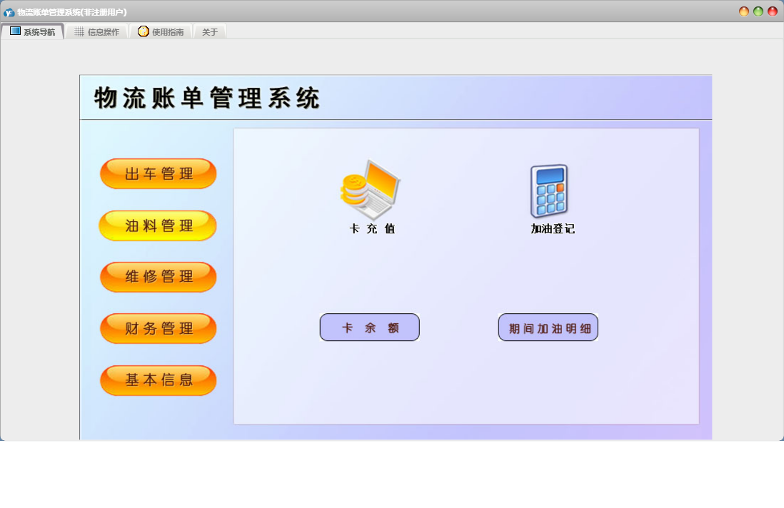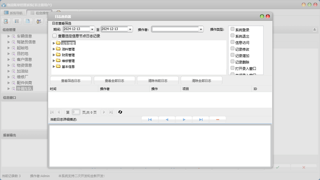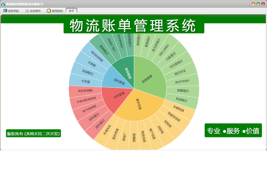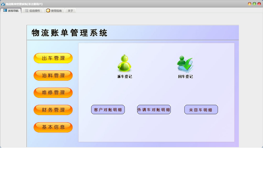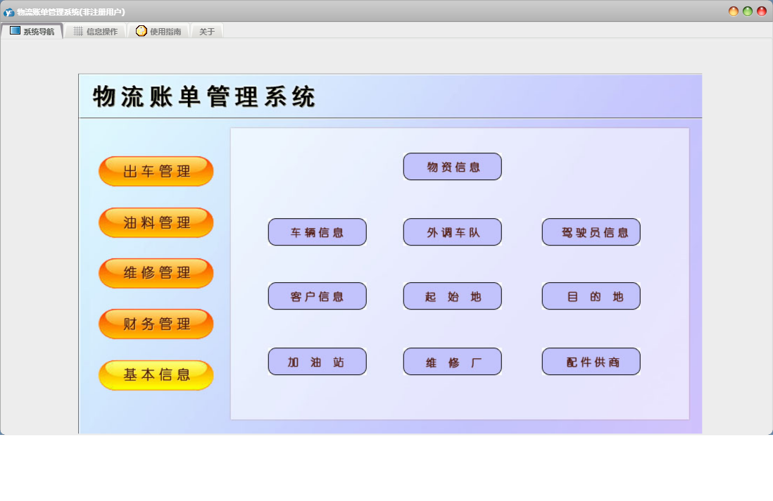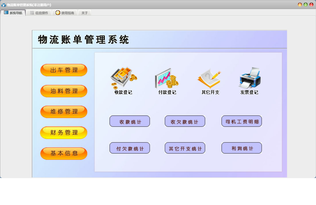 物流账单管理系统包含以下功能:维修登记、配件供商、其它开支、目的地、财务管理、加油登记、物资信息、出车登记、付款登记、维修厂、权限设置、收款登记、回车登记、维修管理、派车登记、关于、基本信息、卡充值、加油站、客户信息、车辆信息、外调车队、油料管理、日志、发票登记、驾驶员信息、起始地等