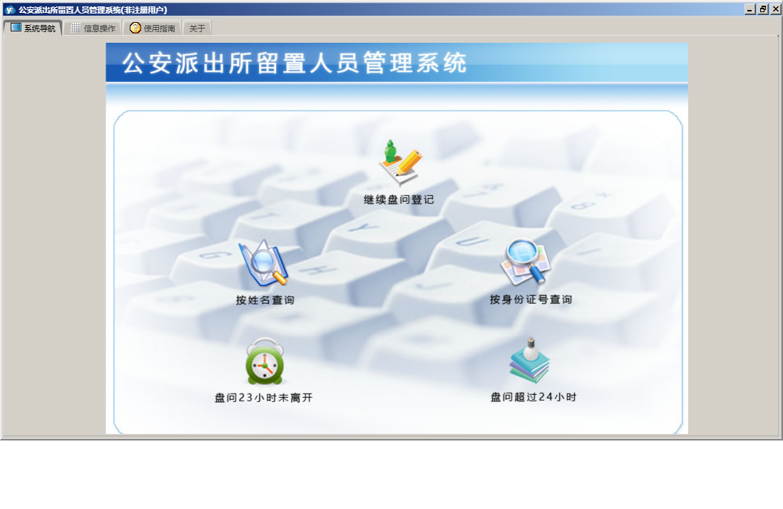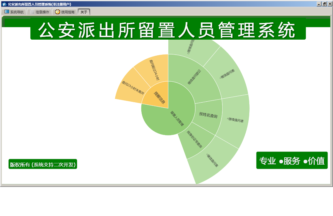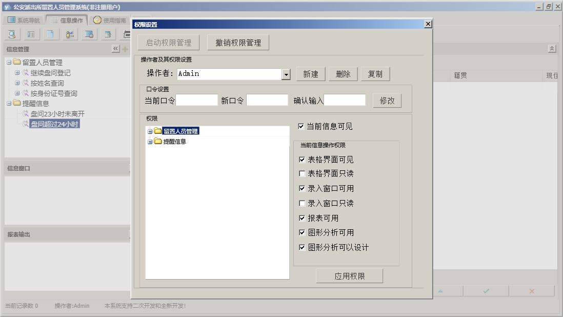 公安派出所留置人员管理系统包含以下功能:关于、权限设置、面板、日志等