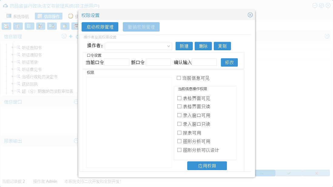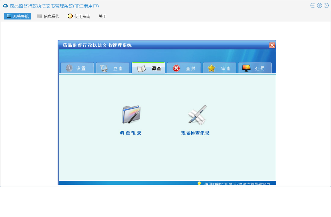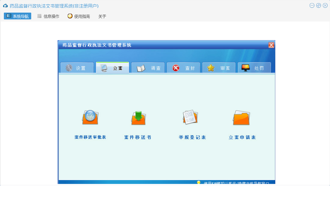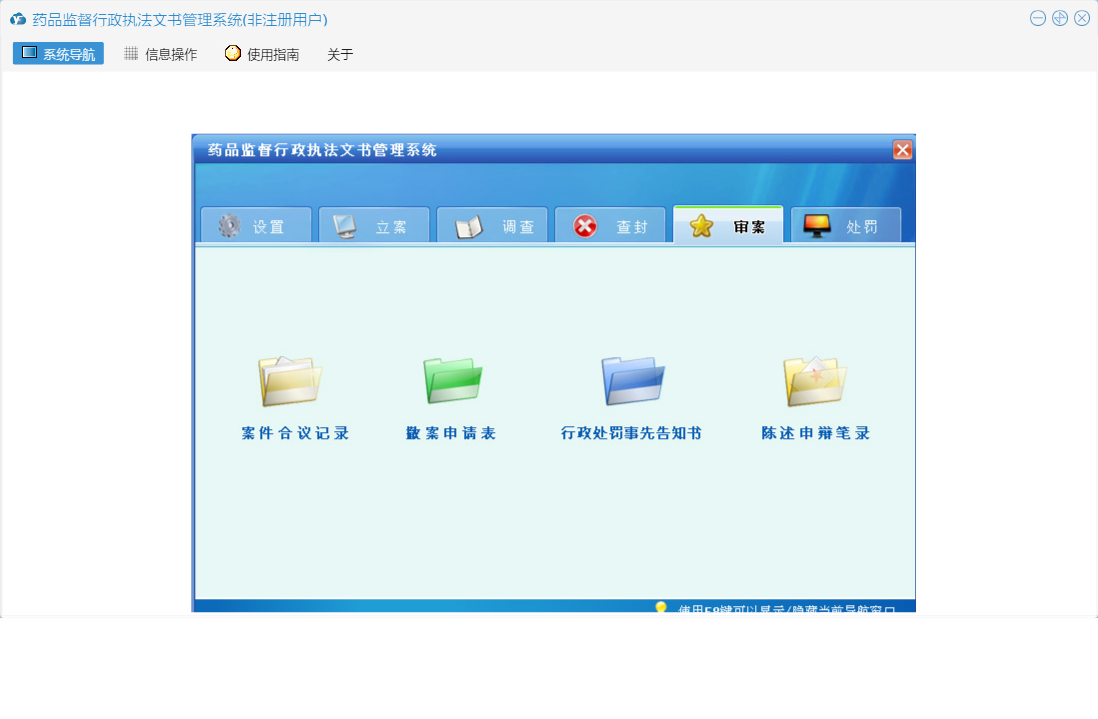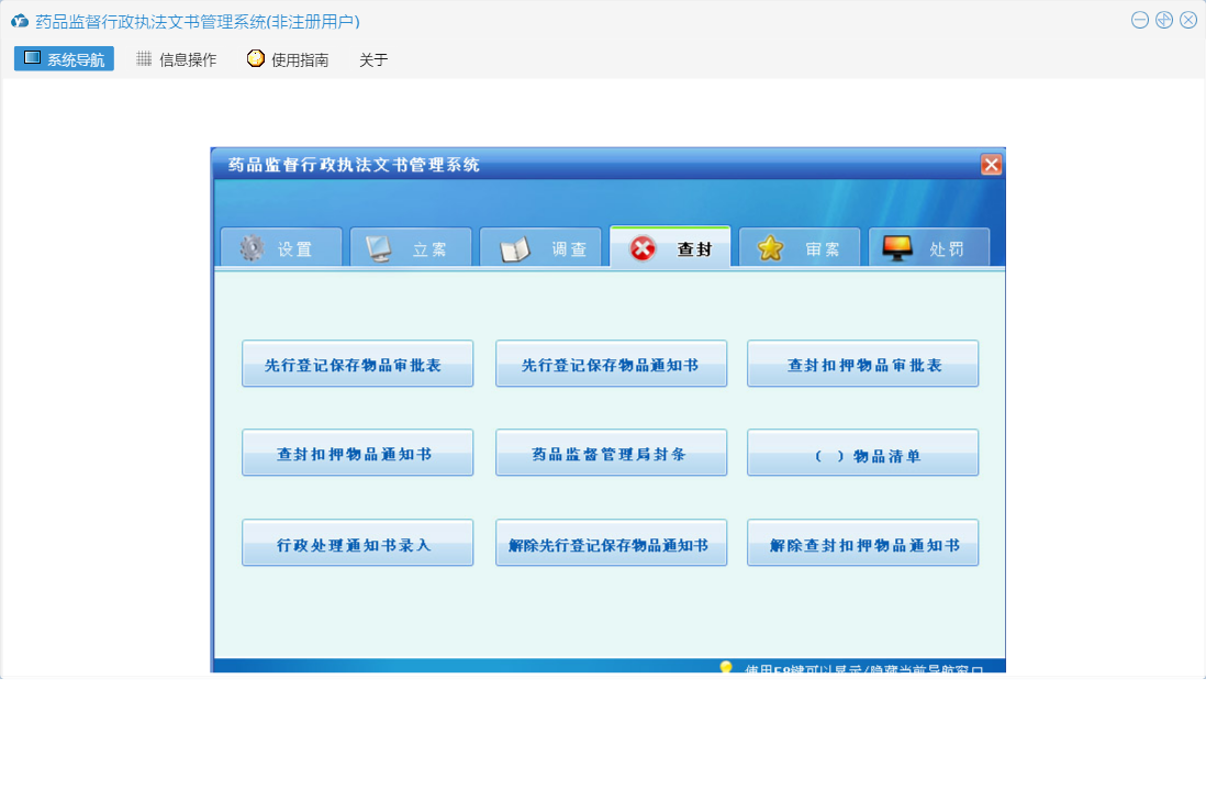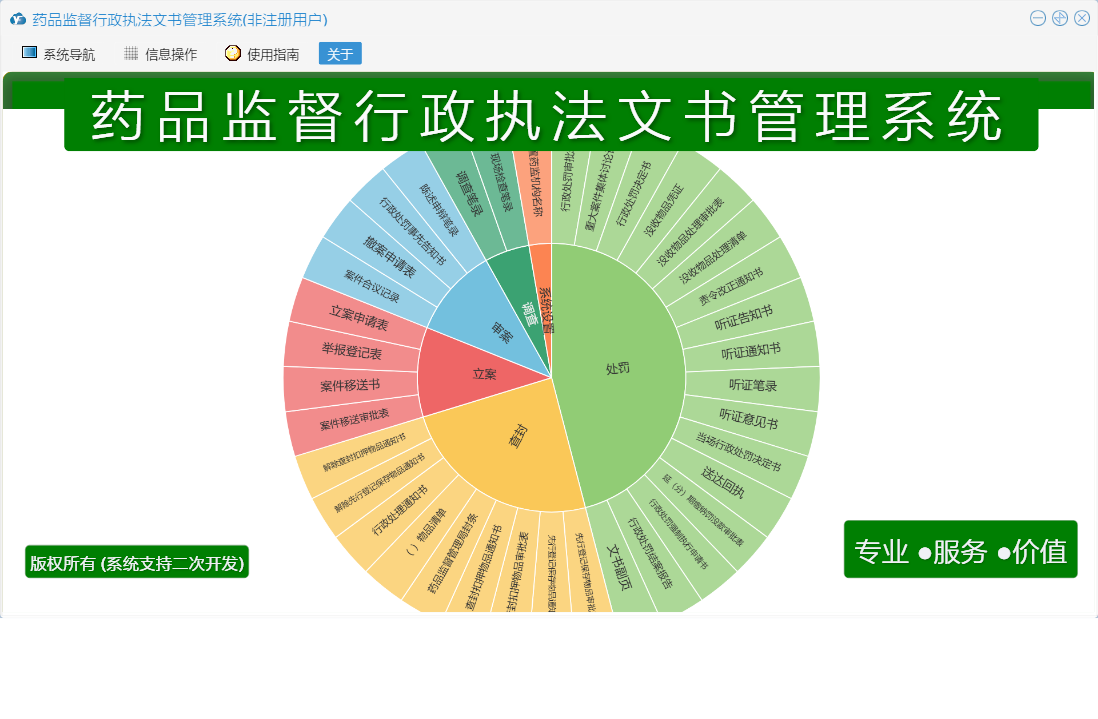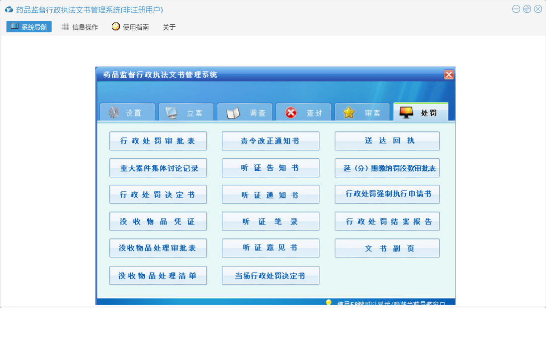 药品监督行政执法文书管理系统包含以下功能:送达回执、陈述申辩笔录、行政处罚结案报告、行政处理通知书、审案、查封、没收物品处理清单、听证意见书、行政处罚审批表、听证告知书、药品监督管理局封条、解除先行登记保存物品通知书、调查、当场行政处罚决定书、权限设置、调查笔录、查封扣押物品审批表、举报登记表、延(分)期缴纳罚没款审批表、撤案申请表、行政处罚强制执行申请书、责令改正通知书、文书副页、先行登记保存物品审批表、行政处罚决定书、解除查封扣押物品通知书、听证通知书、( )物品清单、案件移送书、先行登记保存物品通知书、现场检查笔录、关于、系统设置、没收物品凭证、立案、听证笔录、查封扣押物品通知书、行政处罚事先告知书、案件合议记录、案件移送审批表、日志、处罚、重大案件集体讨论记录、没收物品处理审批表、立案申请表等