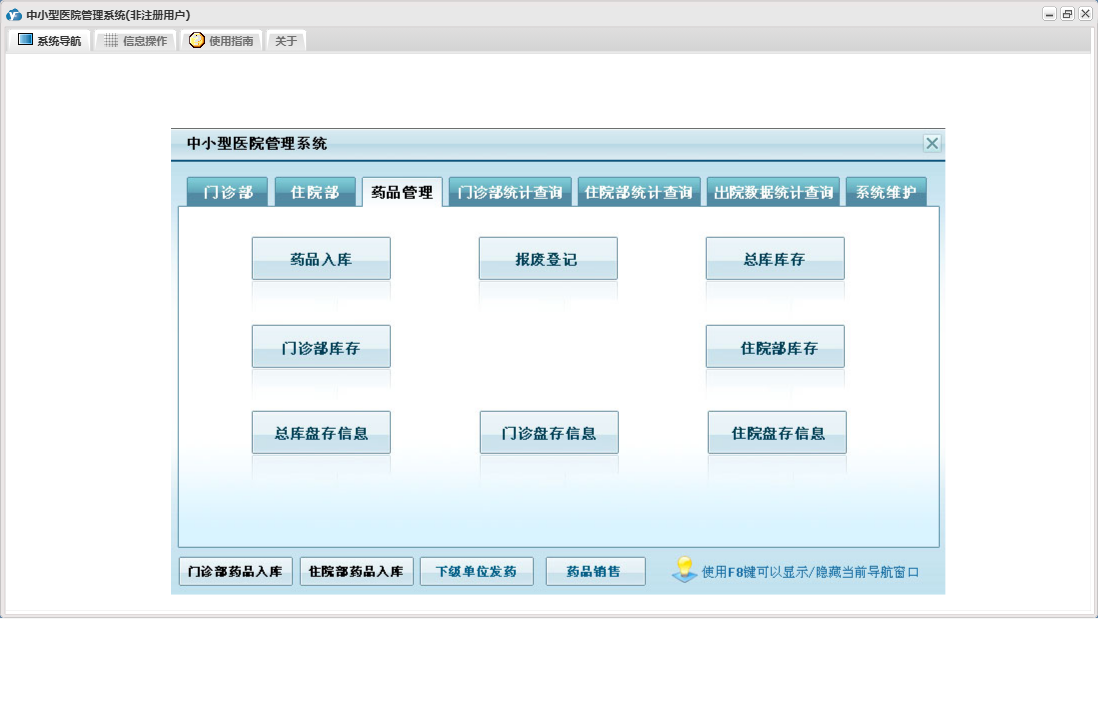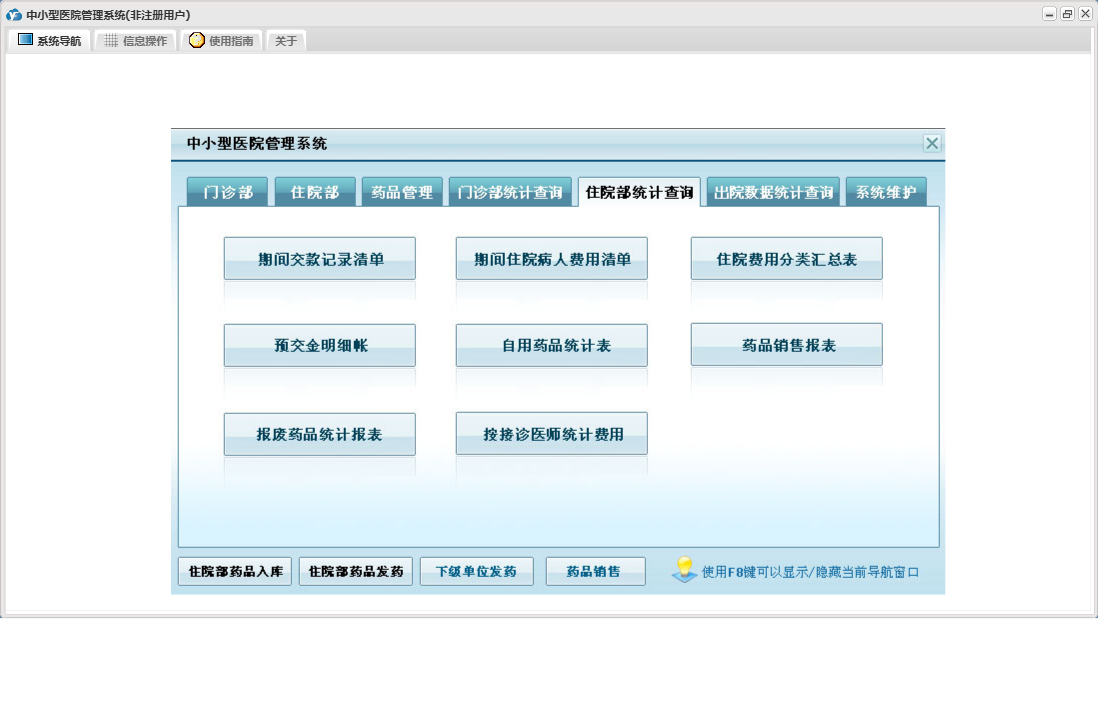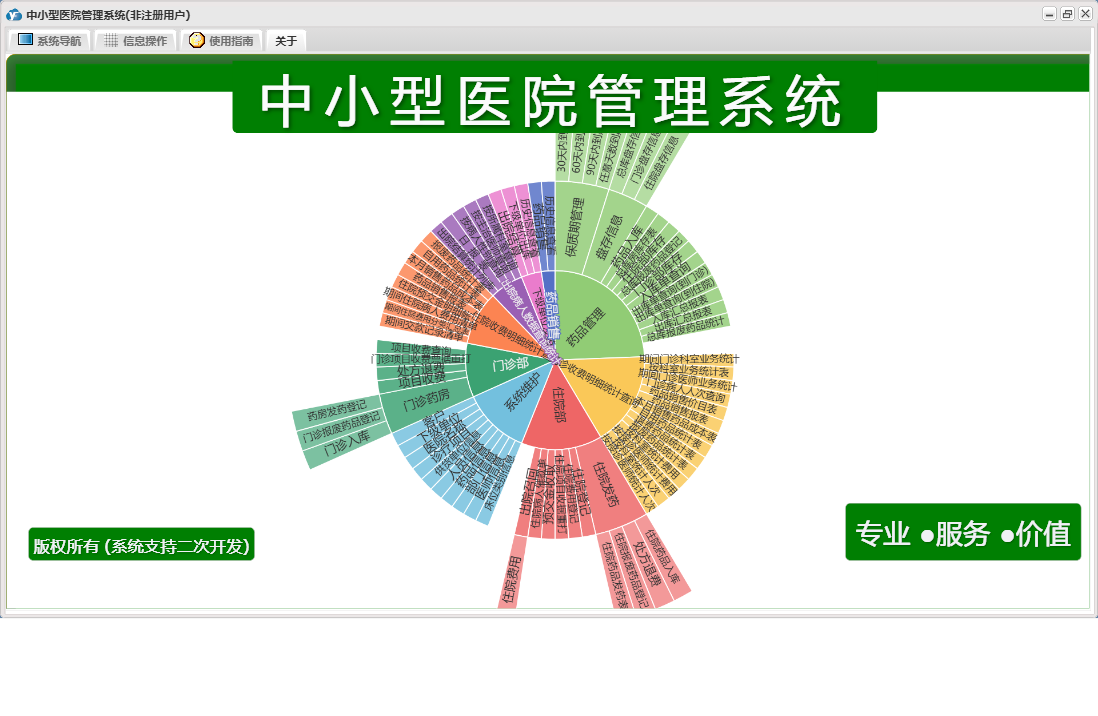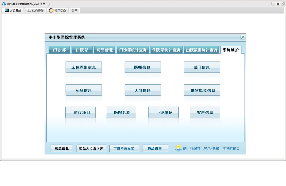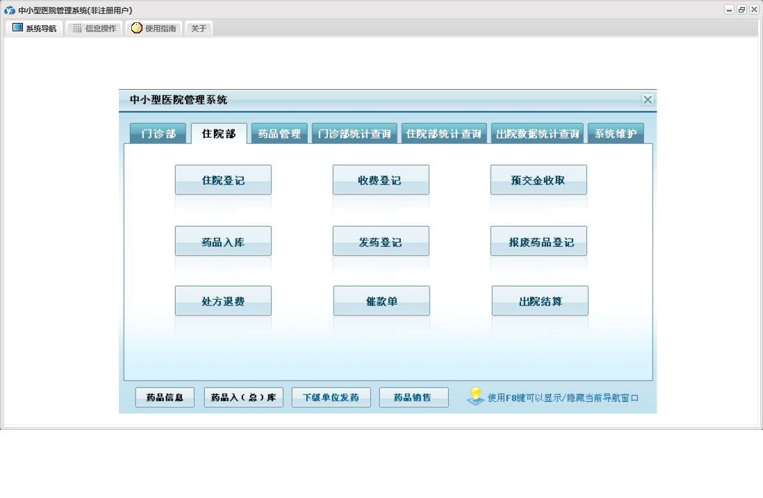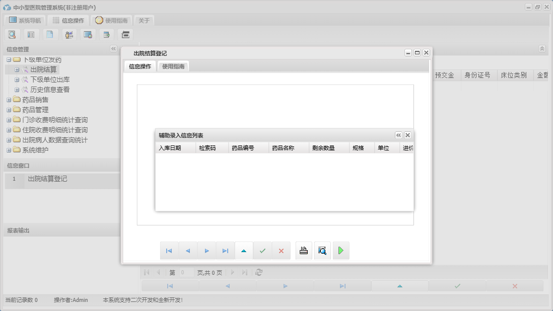中小型医院管理系统包含以下功能:住院部、处方退费、药品销售、住院药品发药表、药品管理、住院收费明细、床位类别信息、住院登记、门诊收费明细、预交金收取、历史信息查看、客户、住院药品入库、药品入库、项目收费、权限设置、出院病人数据查询统计、部门信息、门诊入库、总库报废药品登记、药品信息、下级单位发药、住院报废药品登记、下级单位出库、医师信息、供货单位信息、诊疗项目、下级单位、关于、门诊部、住院费用登记、出院结算、日志、门诊报废药品登记、系统维护、药房发药登记、人员信息等