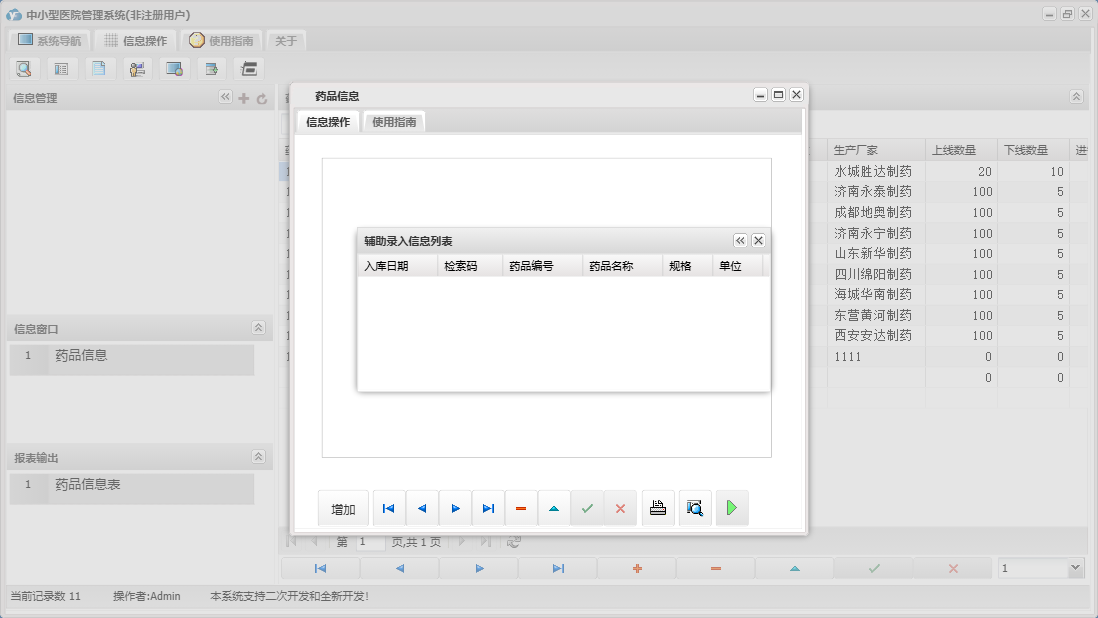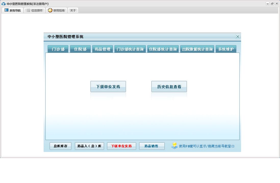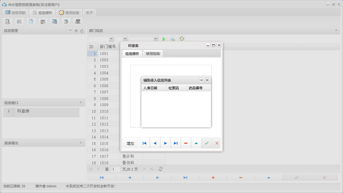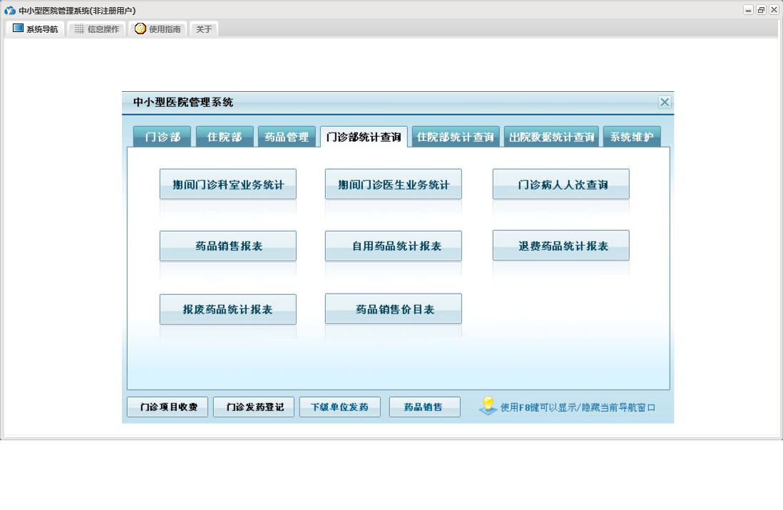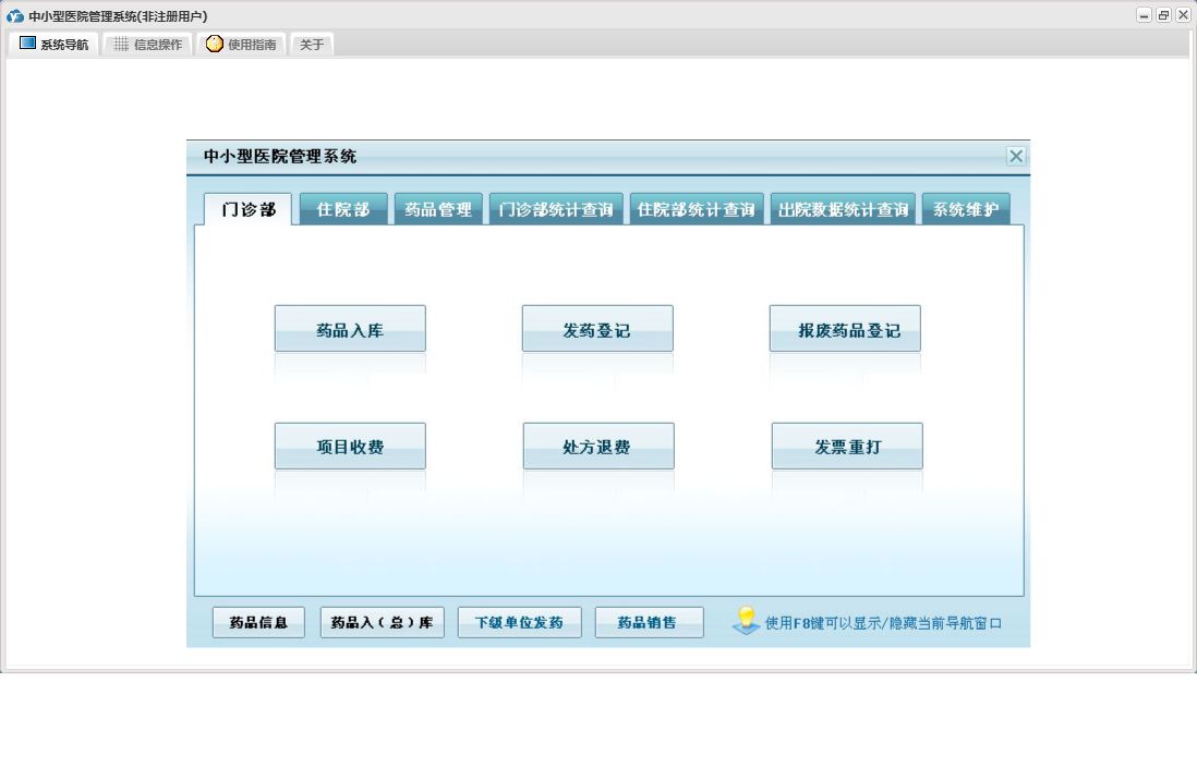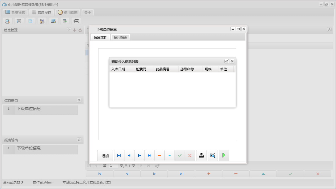 中小型医院管理系统包含以下功能:住院部、处方退费、药品销售、住院药品发药表、药品管理、住院收费明细、床位类别信息、住院登记、门诊收费明细、预交金收取、历史信息查看、客户、住院药品入库、药品入库、项目收费、权限设置、出院病人数据查询统计、部门信息、门诊入库、总库报废药品登记、药品信息、下级单位发药、住院报废药品登记、下级单位出库、医师信息、供货单位信息、诊疗项目、下级单位、关于、门诊部、住院费用登记、出院结算、日志、门诊报废药品登记、系统维护、药房发药登记、人员信息等