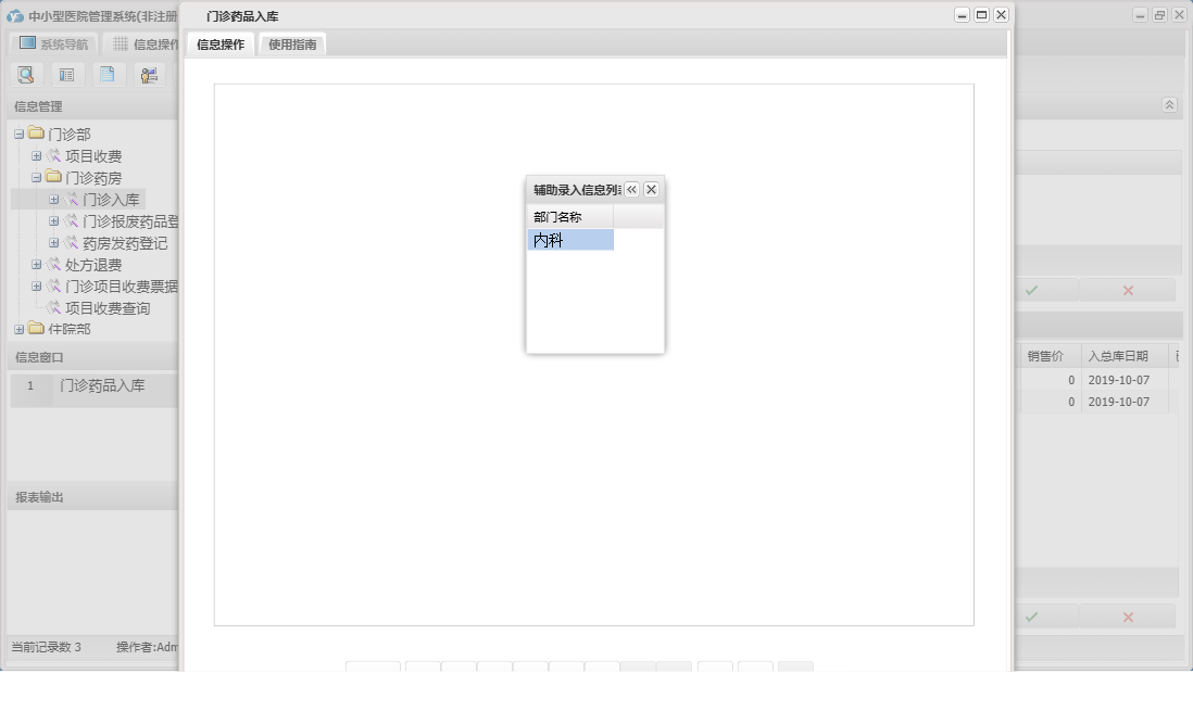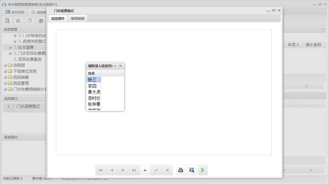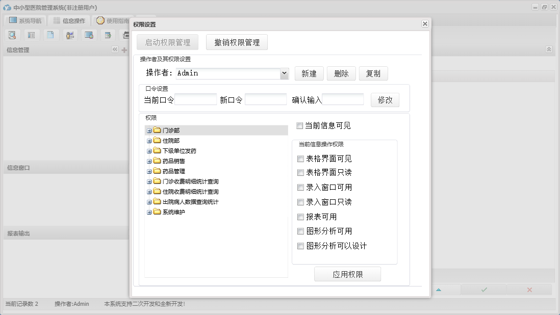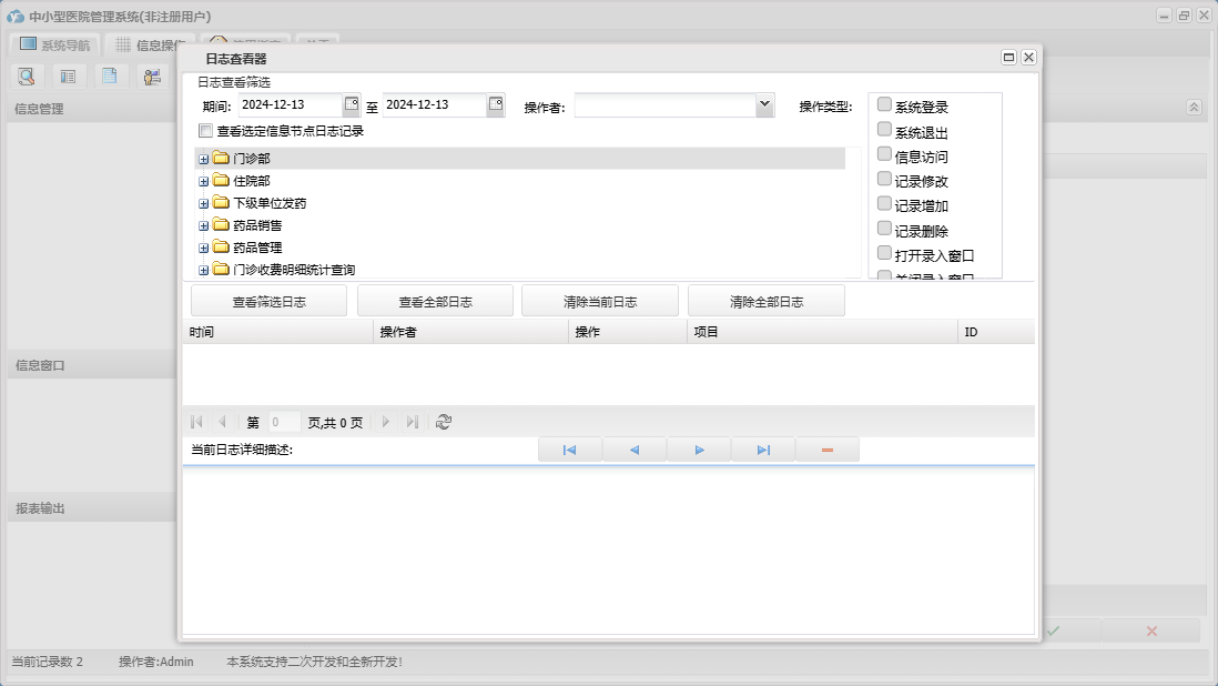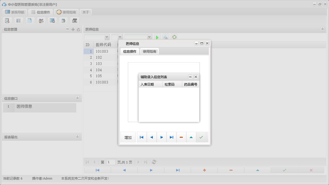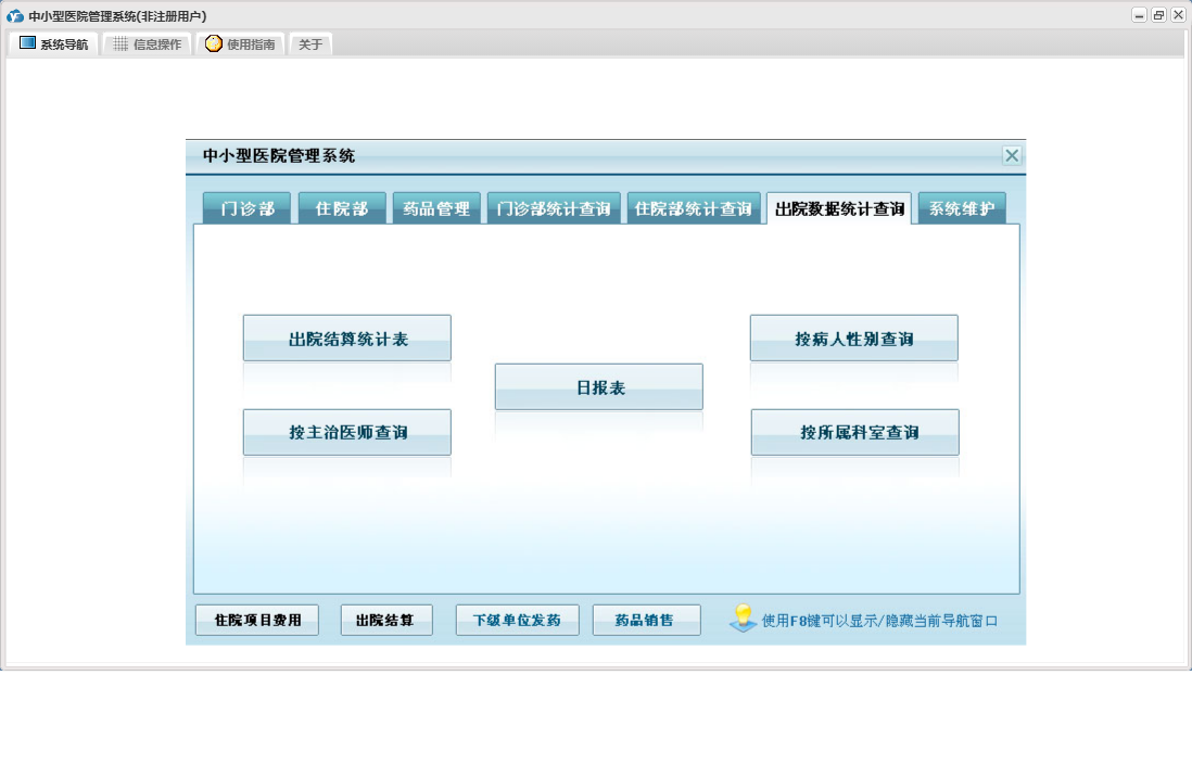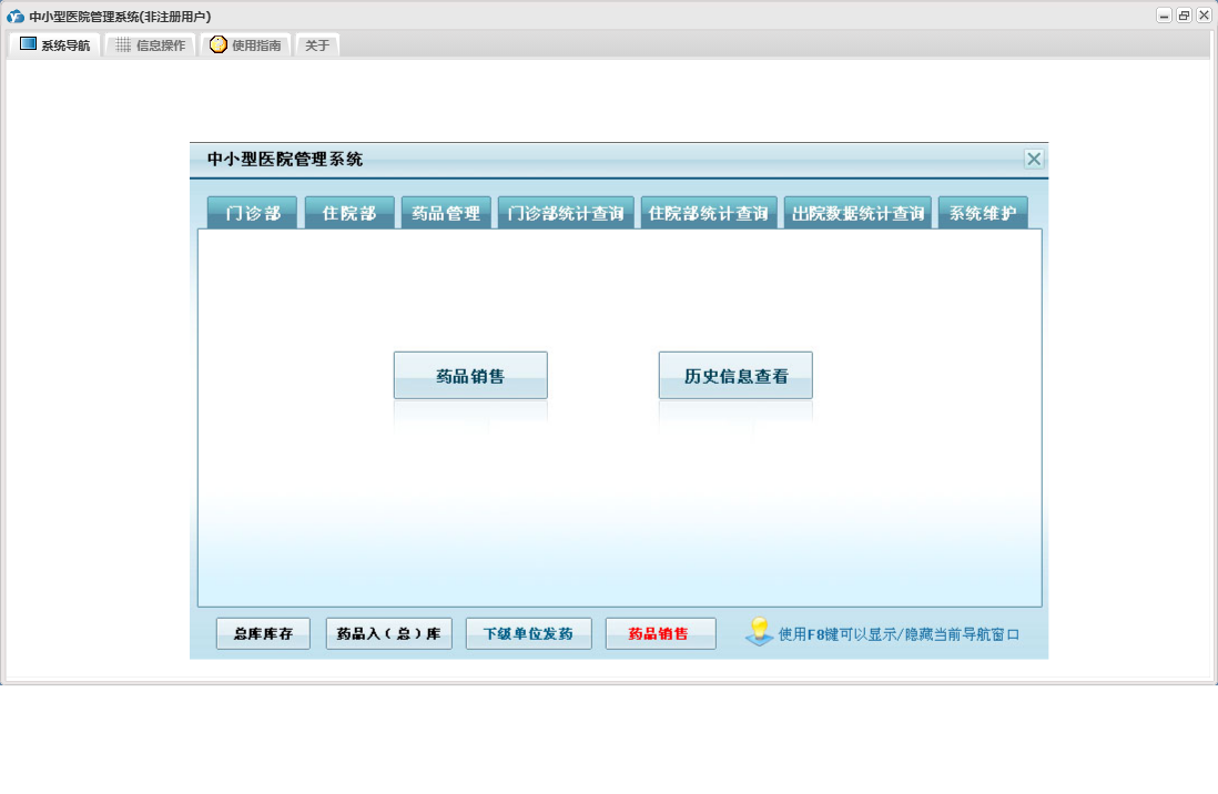 中小型医院管理系统包含以下功能:住院部、处方退费、药品销售、住院药品发药表、药品管理、住院收费明细、床位类别信息、住院登记、门诊收费明细、预交金收取、历史信息查看、客户、住院药品入库、药品入库、项目收费、权限设置、出院病人数据查询统计、部门信息、门诊入库、总库报废药品登记、药品信息、下级单位发药、住院报废药品登记、下级单位出库、医师信息、供货单位信息、诊疗项目、下级单位、关于、门诊部、住院费用登记、出院结算、日志、门诊报废药品登记、系统维护、药房发药登记、人员信息等