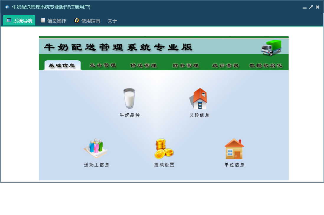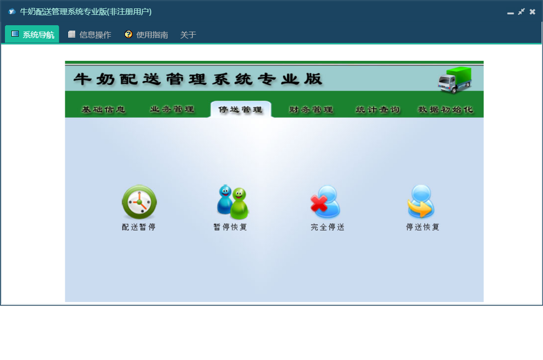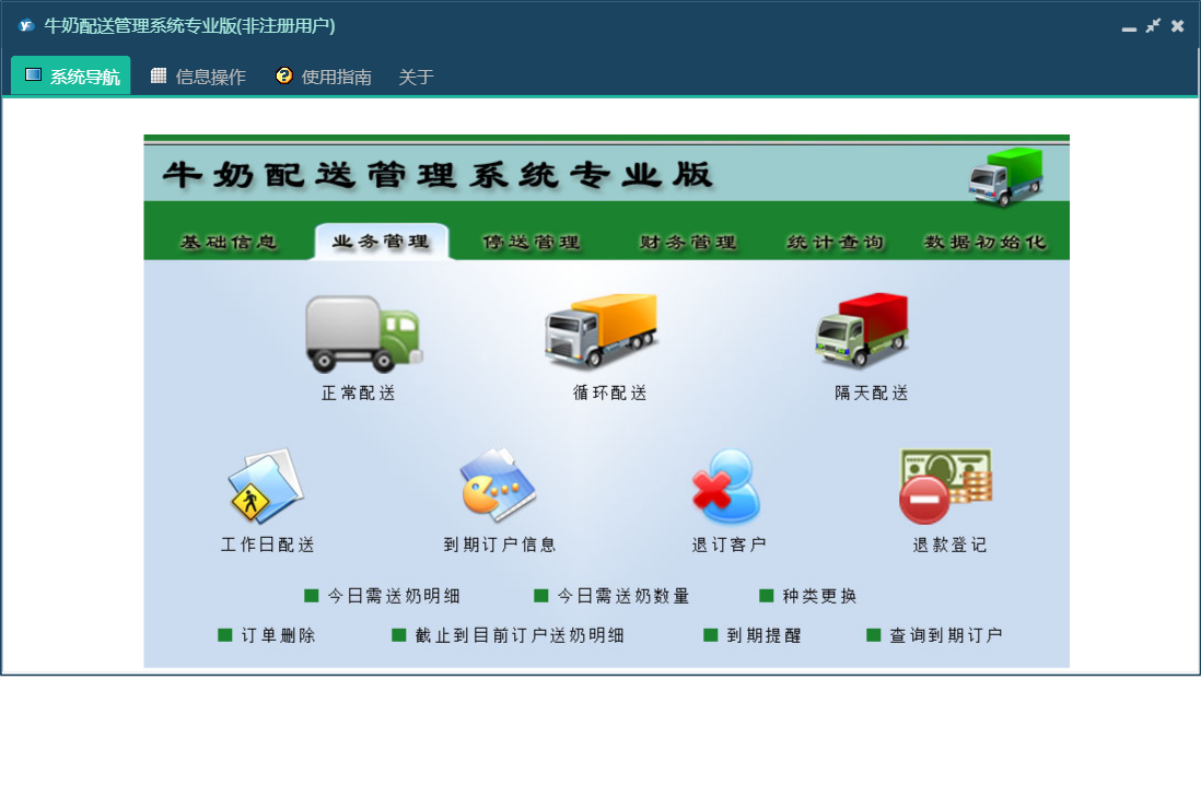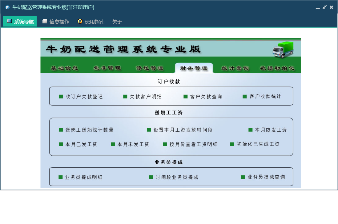 牛奶配送管理系统专业版包含以下功能:数据初始化、隔天配送、正常配送、财务管理、种类更换、循环配送、设置本月工资发放时间段、统计查询、权限设置、工作日配送、停送管理、停送恢复、完全停送、收订户欠款登记、关于、送奶工信息、业务管理、基础信息、退款登记、日志、暂停恢复、配送暂停等