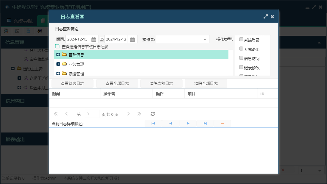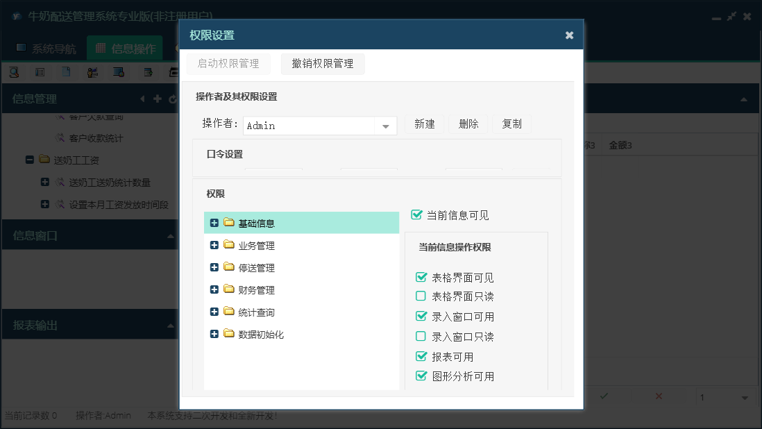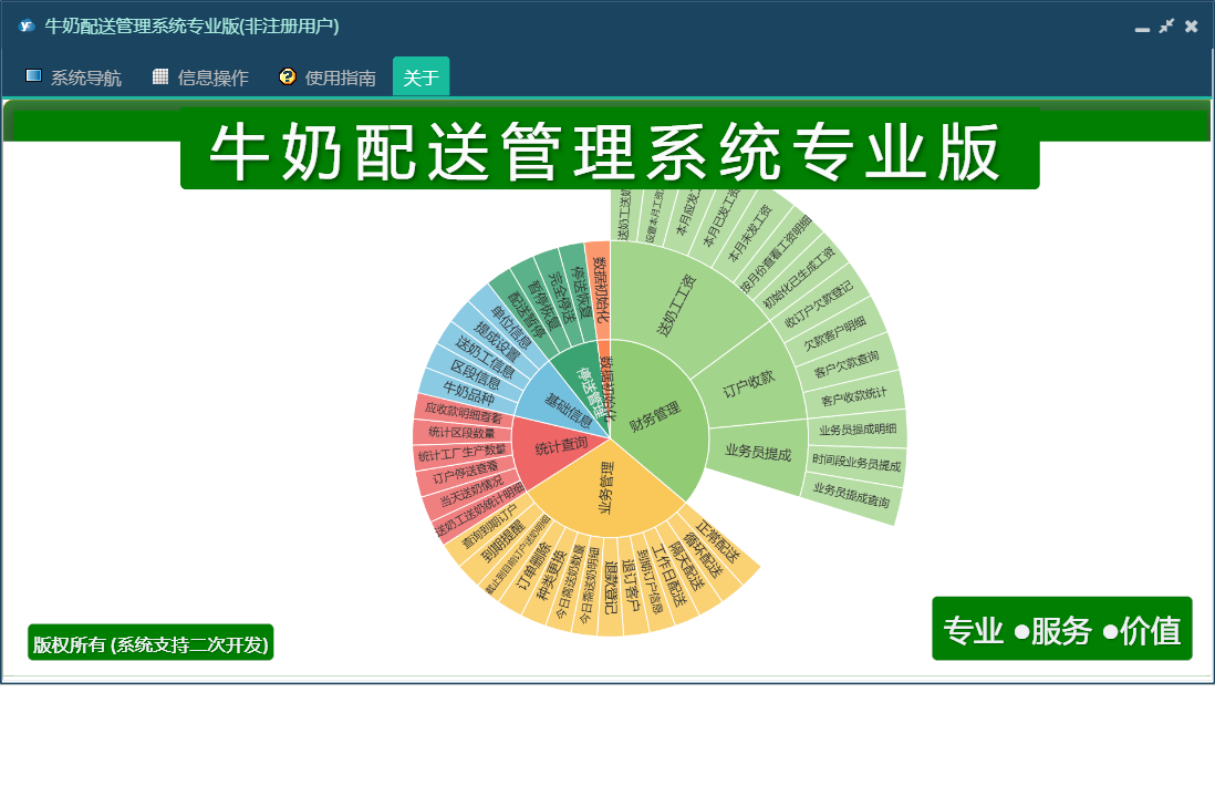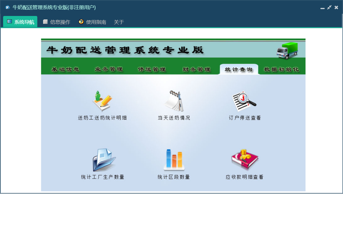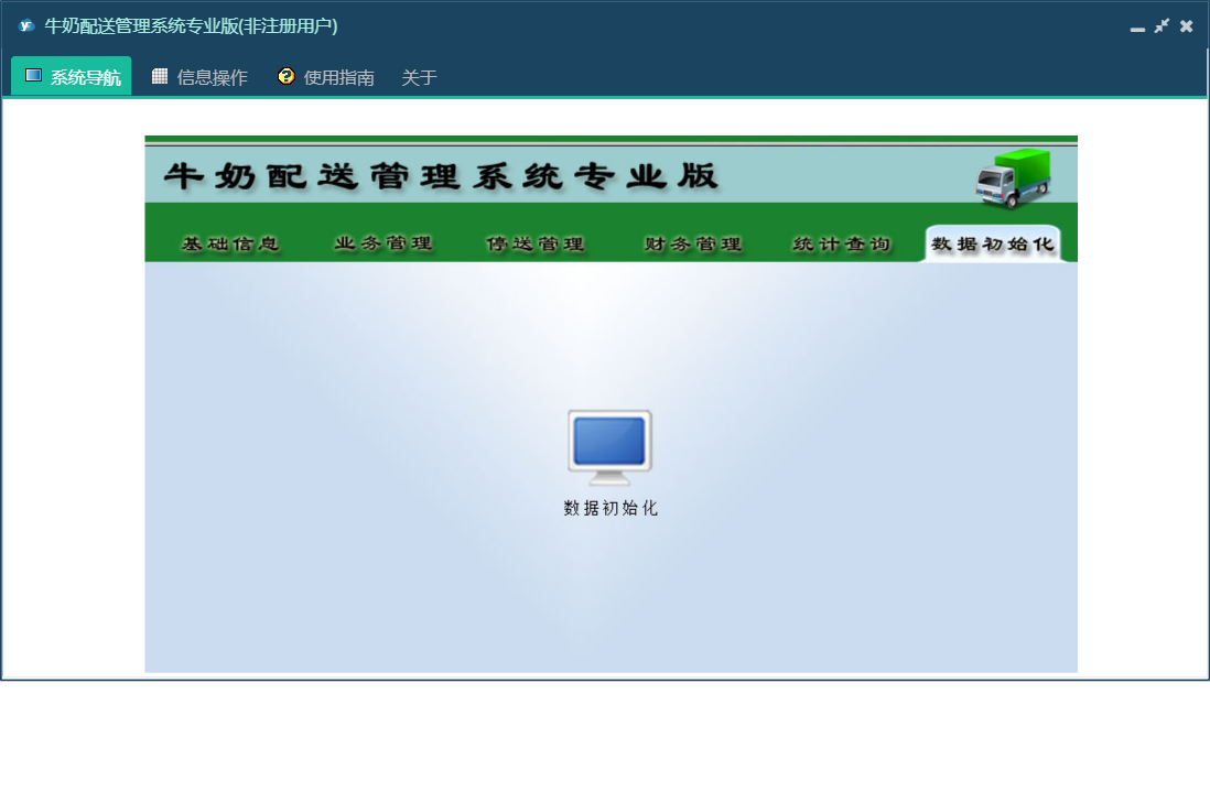 牛奶配送管理系统专业版包含以下功能:数据初始化、隔天配送、正常配送、财务管理、种类更换、循环配送、设置本月工资发放时间段、统计查询、权限设置、工作日配送、停送管理、停送恢复、完全停送、收订户欠款登记、关于、送奶工信息、业务管理、基础信息、退款登记、日志、暂停恢复、配送暂停等