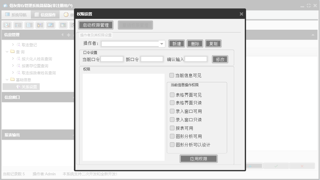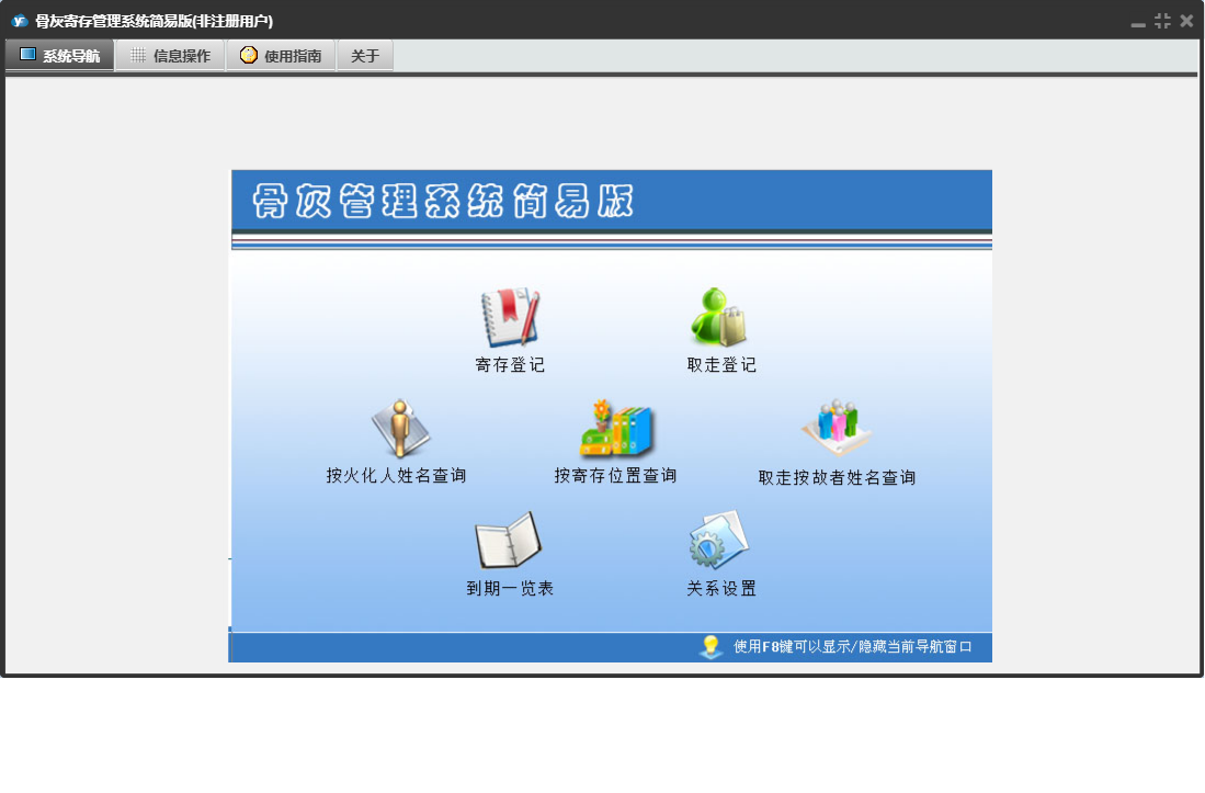 骨灰寄存管理系统简易版包含以下功能:取走登记、面板、按寄存位置查询、按火化人姓名查询、日志、关于、权限设置等