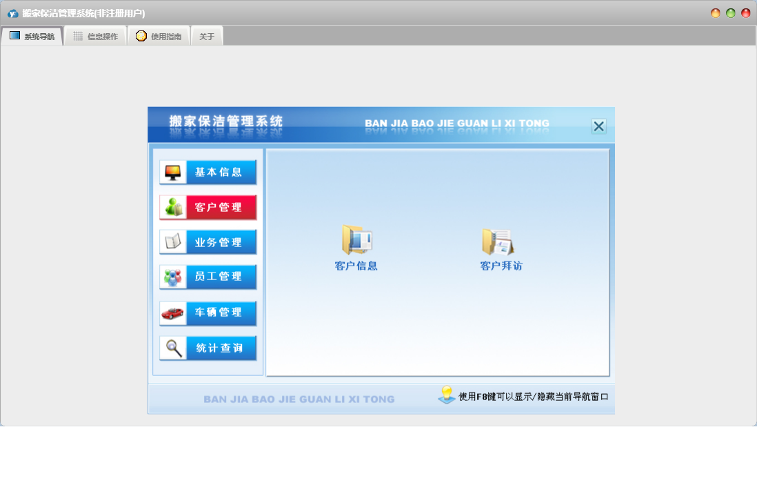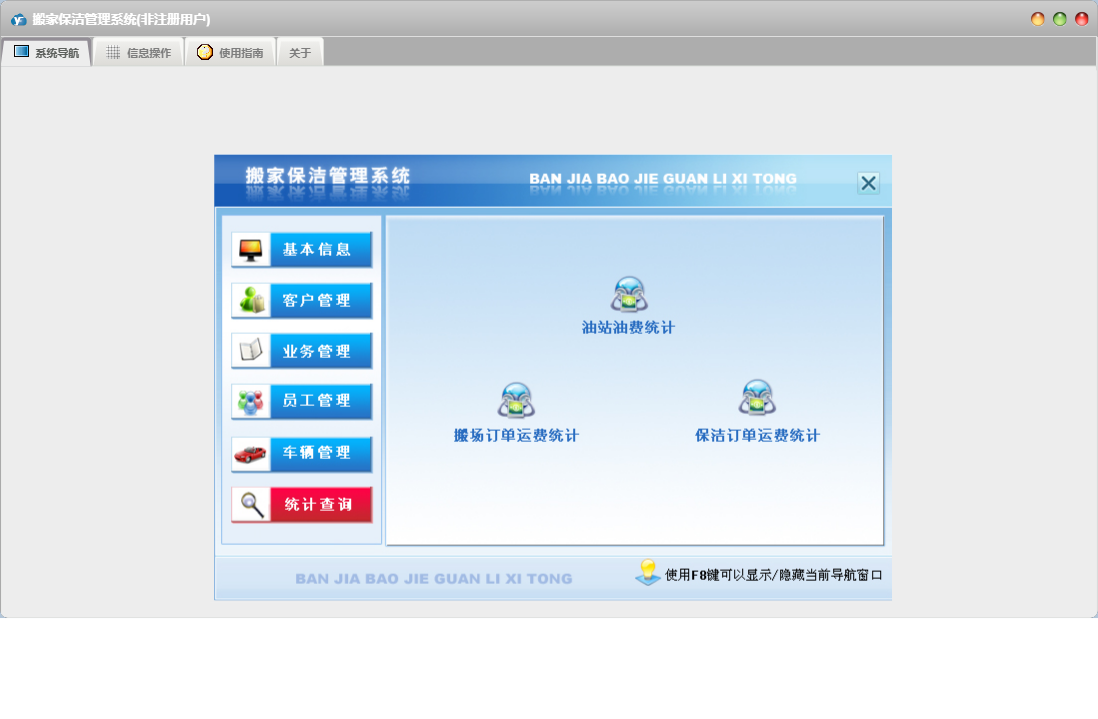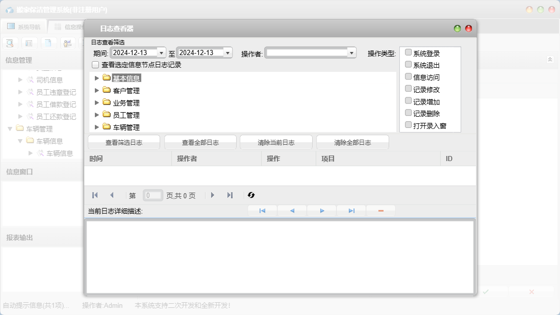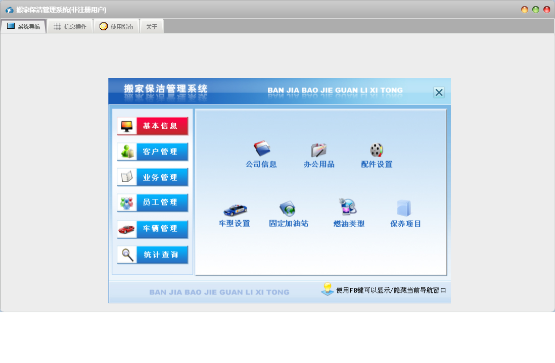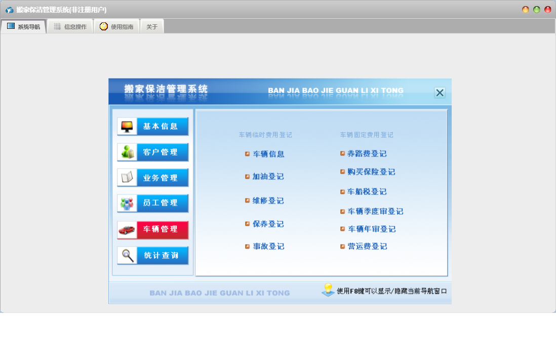搬家保洁管理系统包含以下功能:车辆年审登记、保洁订单、车型设置、车船税登记、搬场客户还款登记、员工违章登记、车辆季度审登记、保养项目、车辆管理、固定加油站、汽车配件、保洁作业调用、办公用品费用登记、公司信息、搬场作业回车登记、客户拜访、客户管理、权限设置、统计查询、保洁客户还款登记、养路费登记、保洁作业回车登记、办公用品、关于、燃油类型、基本信息、客户信息、购买保险登记、业务管理、员工借款登记、员工管理、搬场作业调用、营运费登记、司机信息、员工信息、员工还款登记、日志、搬场订单等