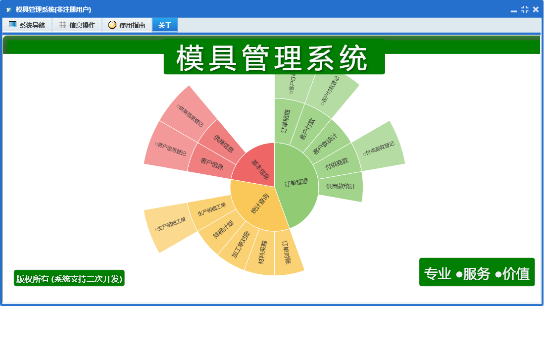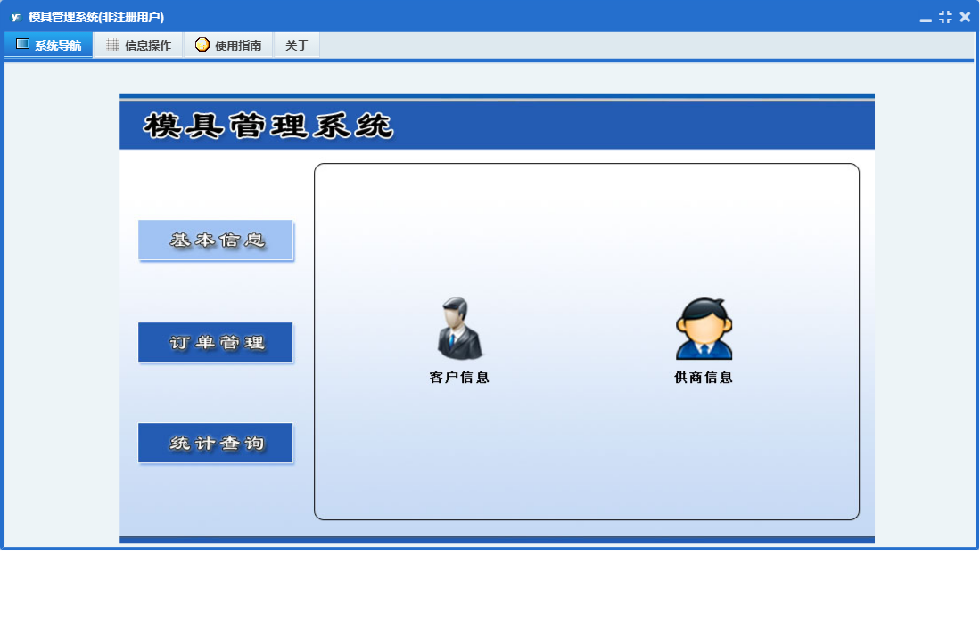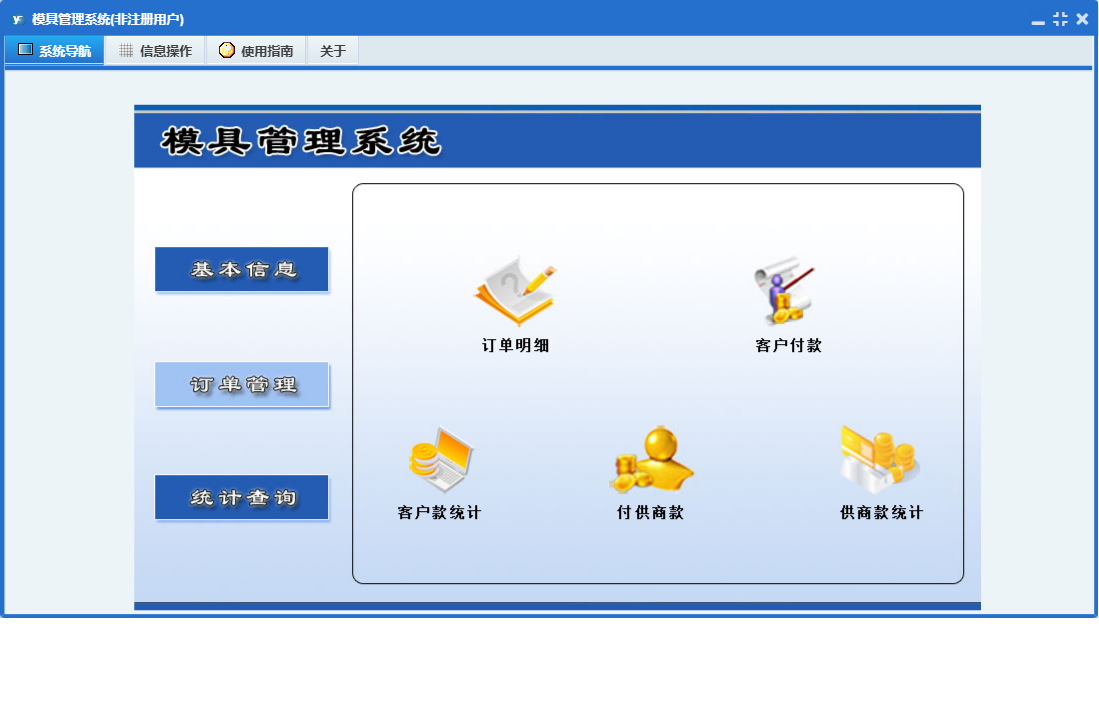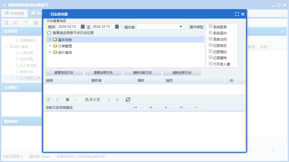 模具管理系统包含以下功能:订单管理、日志、关于、基本信息、权限设置、统计查询等