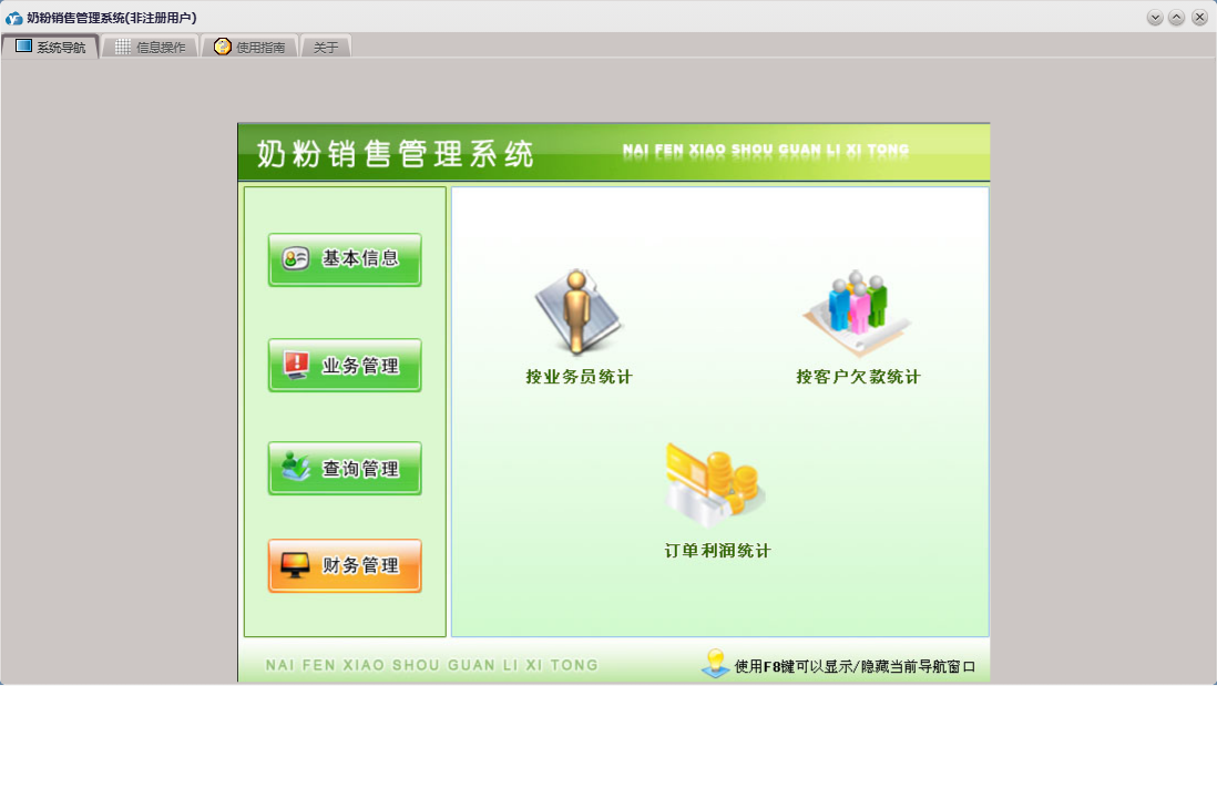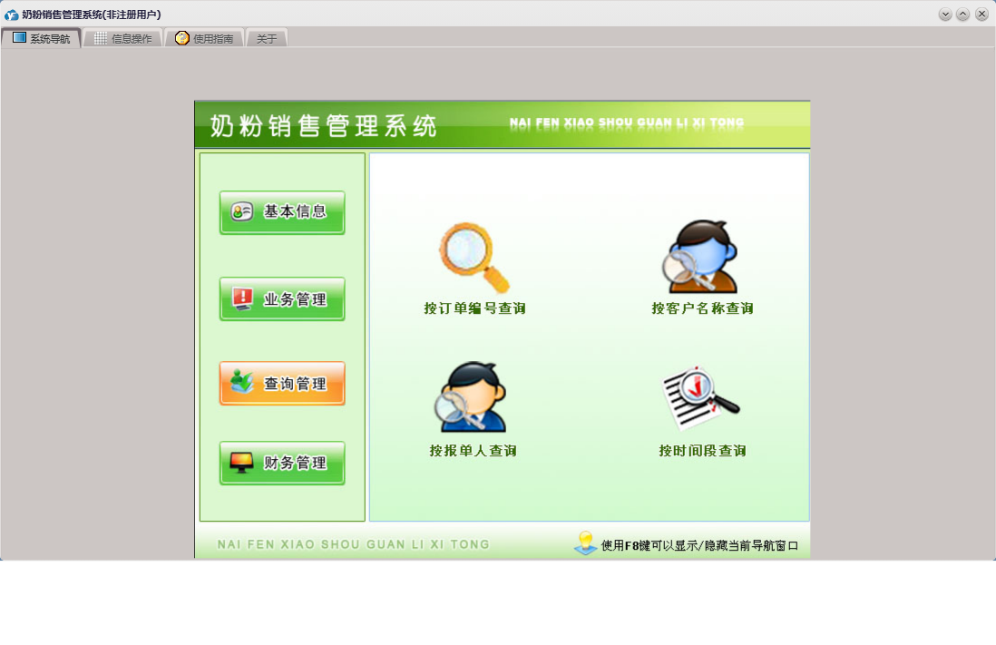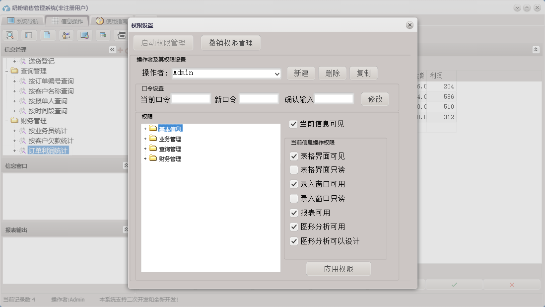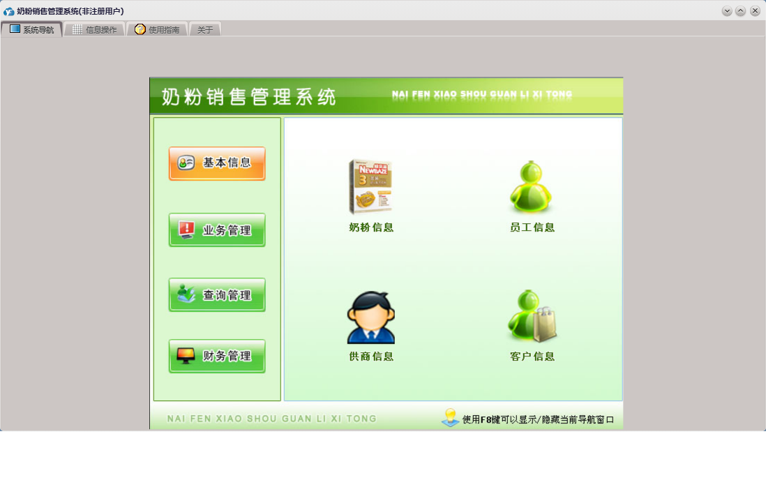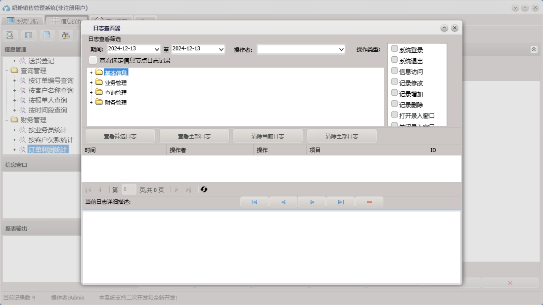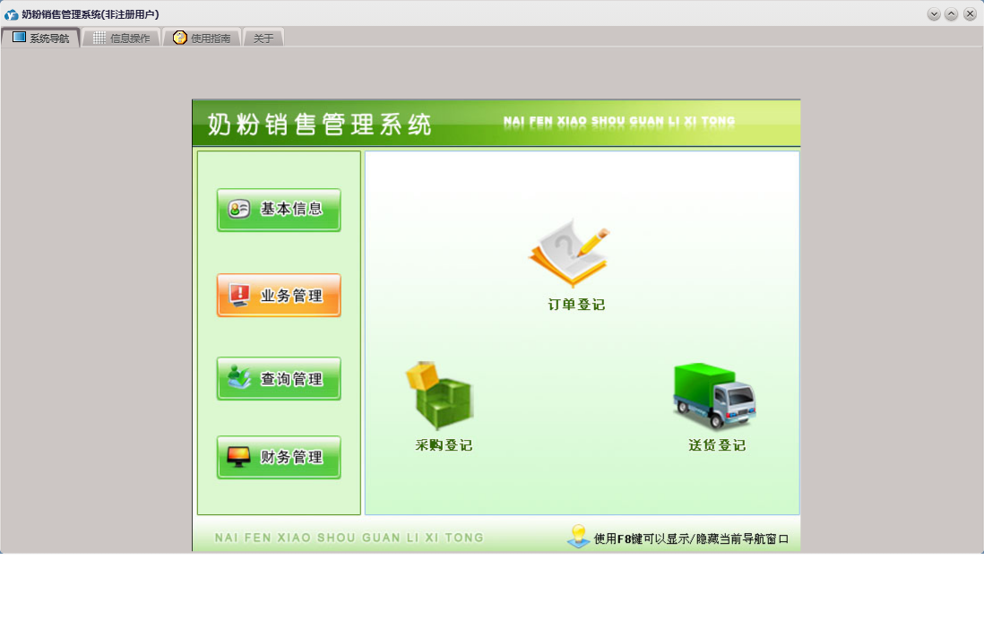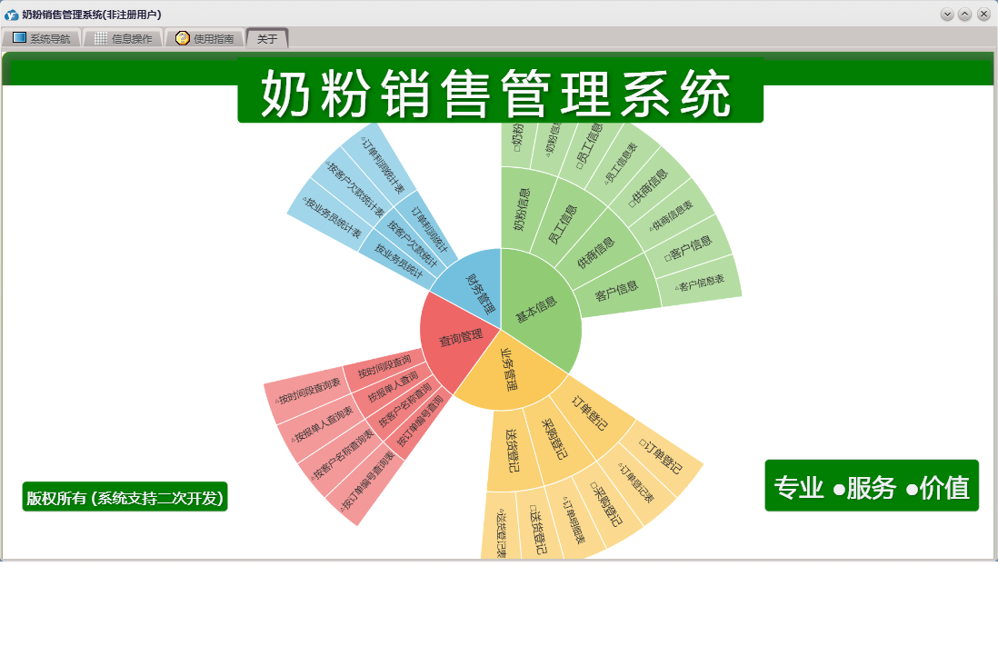 奶粉销售管理系统包含以下功能:奶粉信息、送货登记、员工信息、订单登记、日志、采购登记、关于、权限设置、基本信息、客户信息、业务管理、财务管理、查询管理、供商信息等