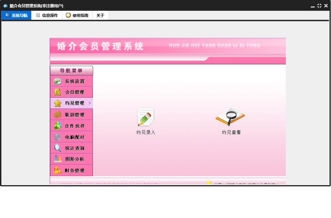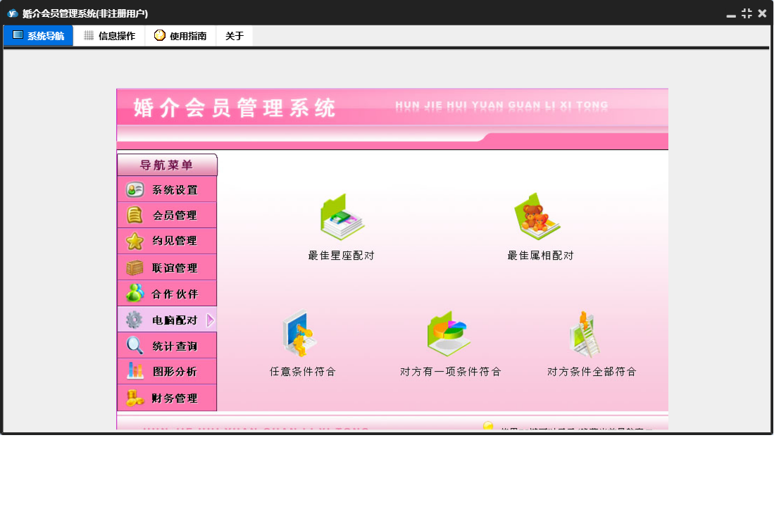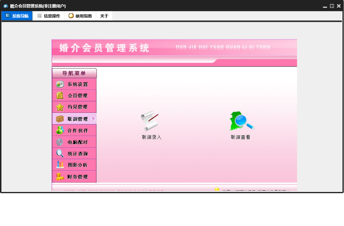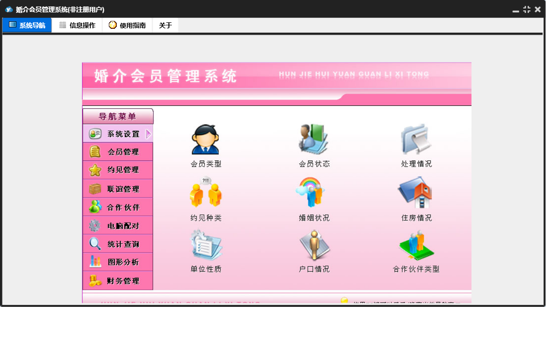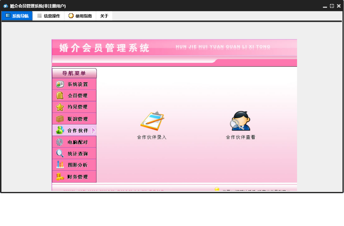 婚介会员管理系统包含以下功能:合作伙伴录入、合作伙伴、电脑配对、财务管理、联谊管理、权限设置、统计查询、约见查看、会员录入、收入录入、关于、系统设置、图形分析、会员管理、支出录入、日志、联谊录入、联谊查看、约见管理、合作伙伴查看等