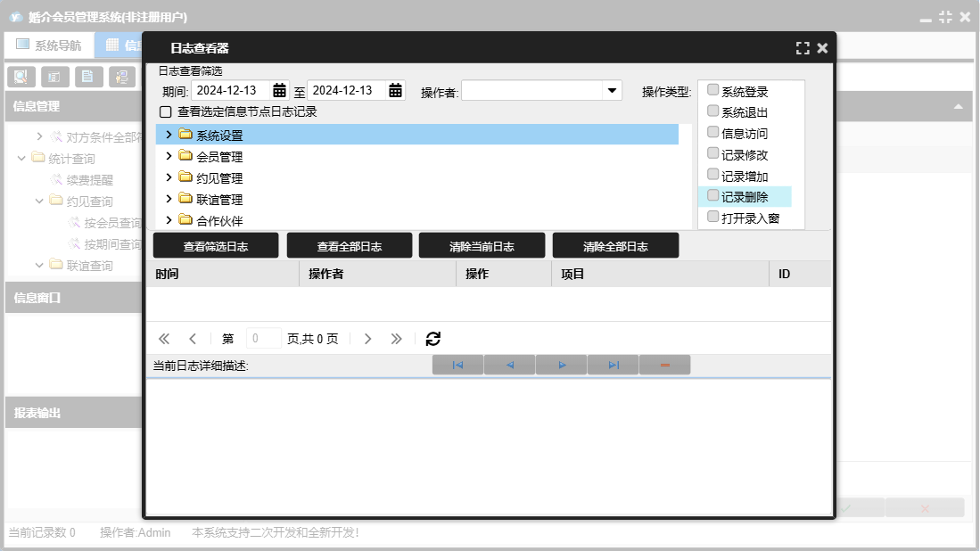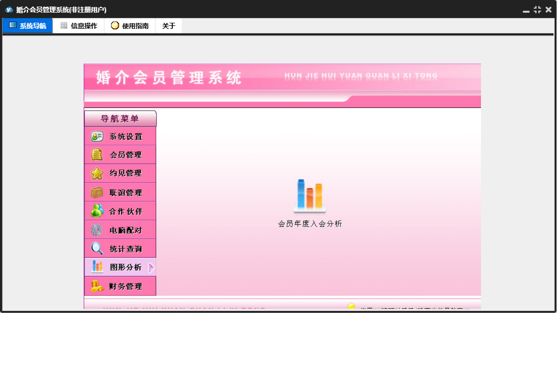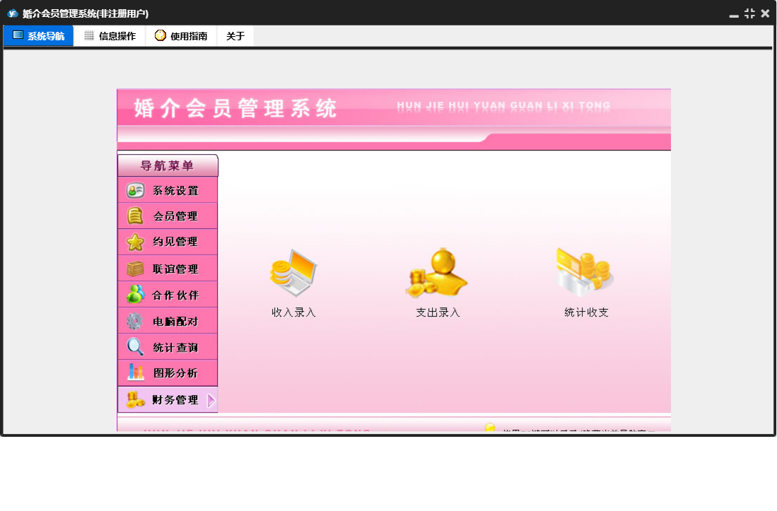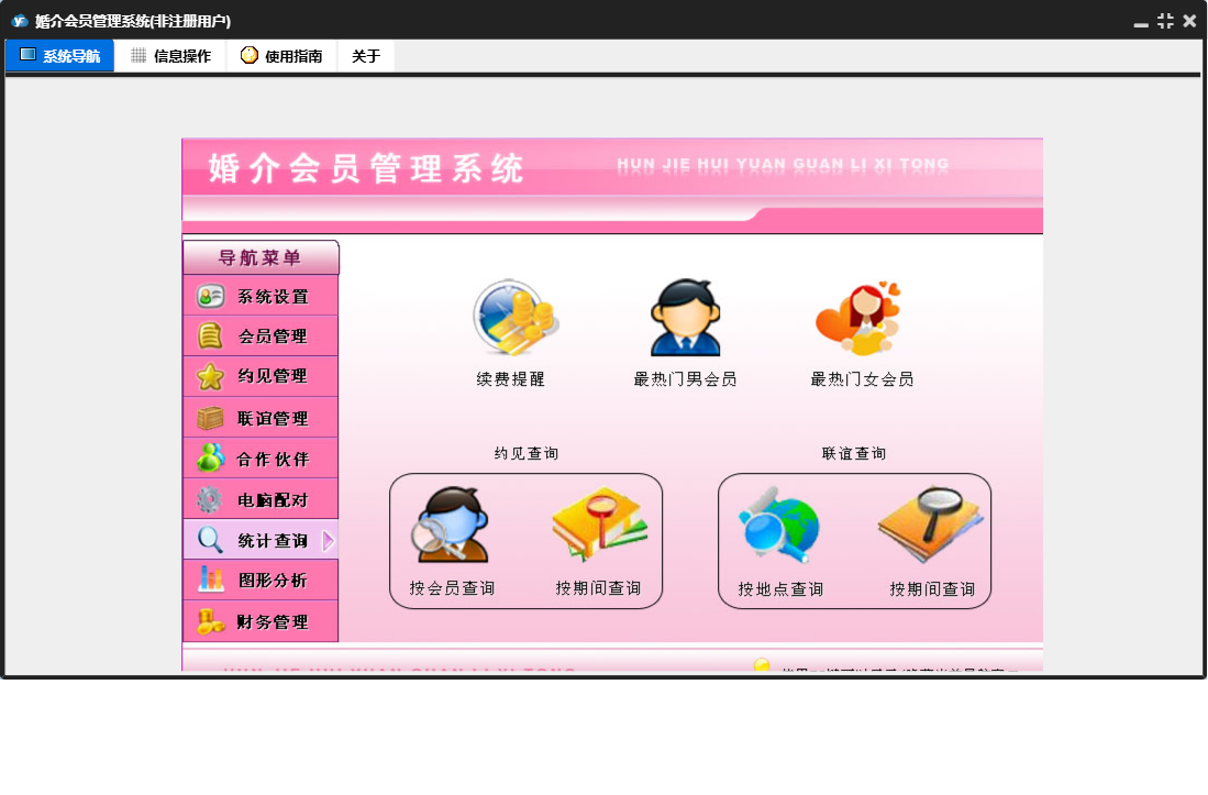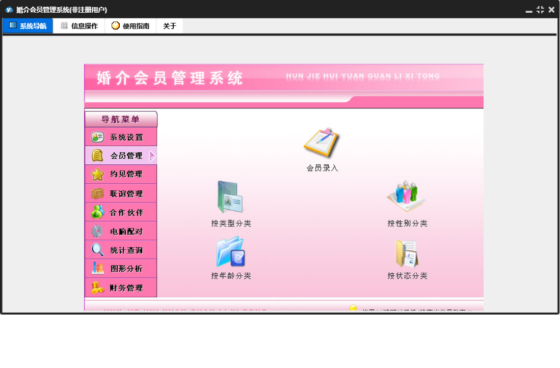 婚介会员管理系统包含以下功能:合作伙伴录入、合作伙伴、电脑配对、财务管理、联谊管理、权限设置、统计查询、约见查看、会员录入、收入录入、关于、系统设置、图形分析、会员管理、支出录入、日志、联谊录入、联谊查看、约见管理、合作伙伴查看等