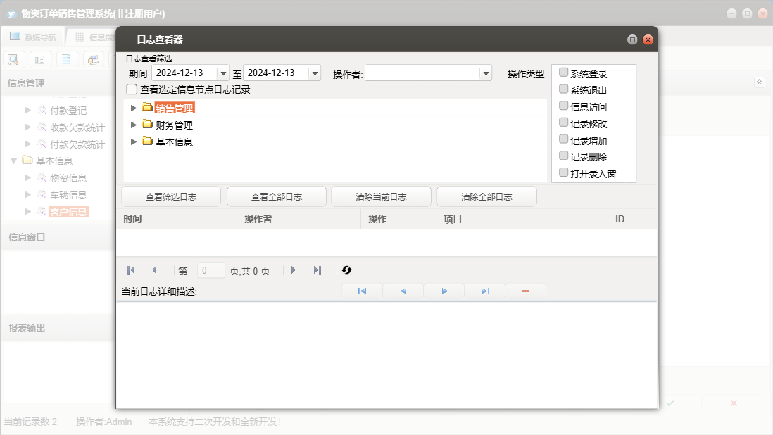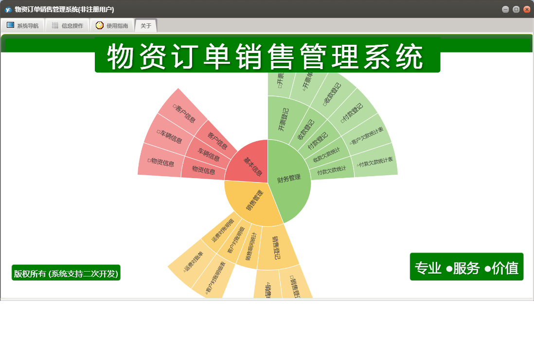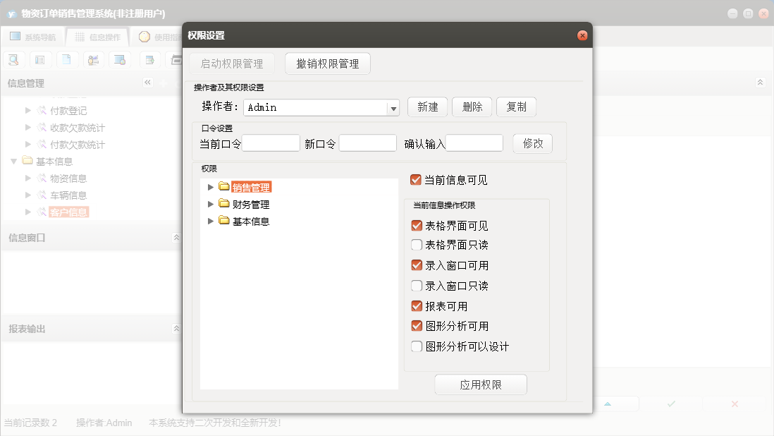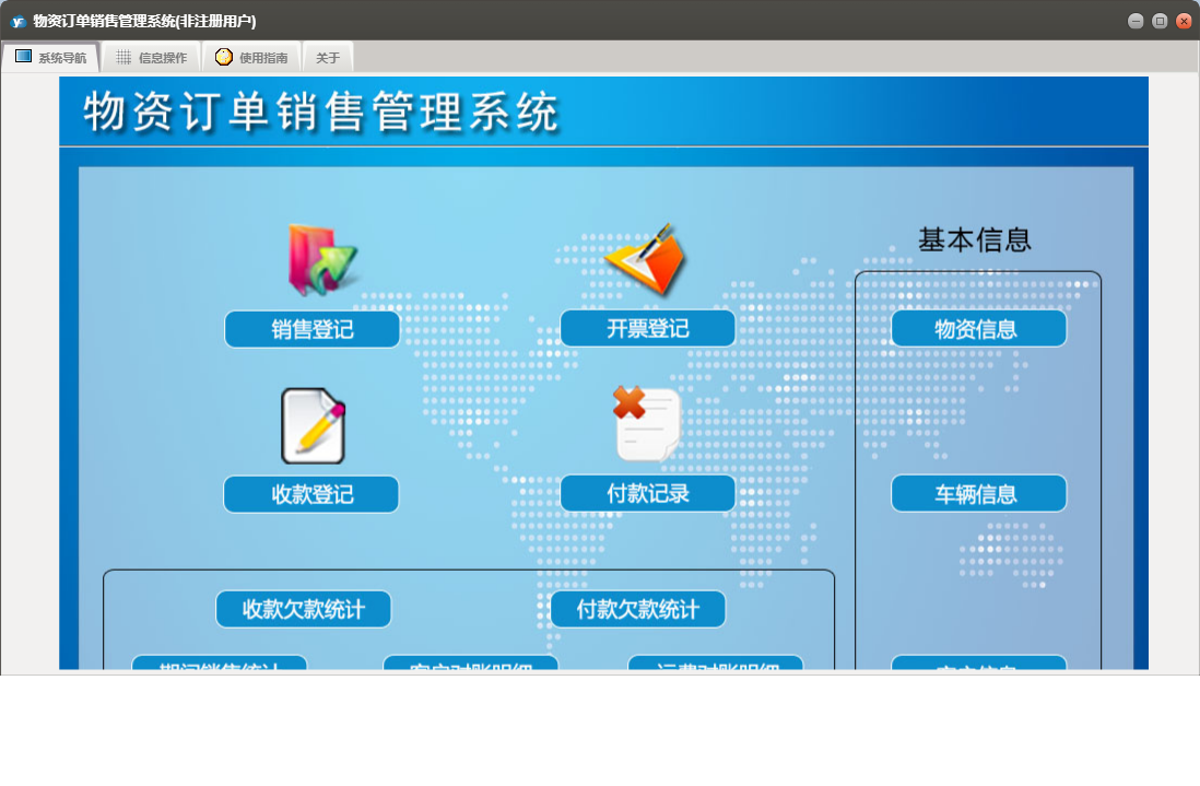 物资订单销售管理系统包含以下功能:物资信息、面板、付款登记、日志、开票登记、关于、权限设置、销售登记、客户信息、收款登记、车辆信息等