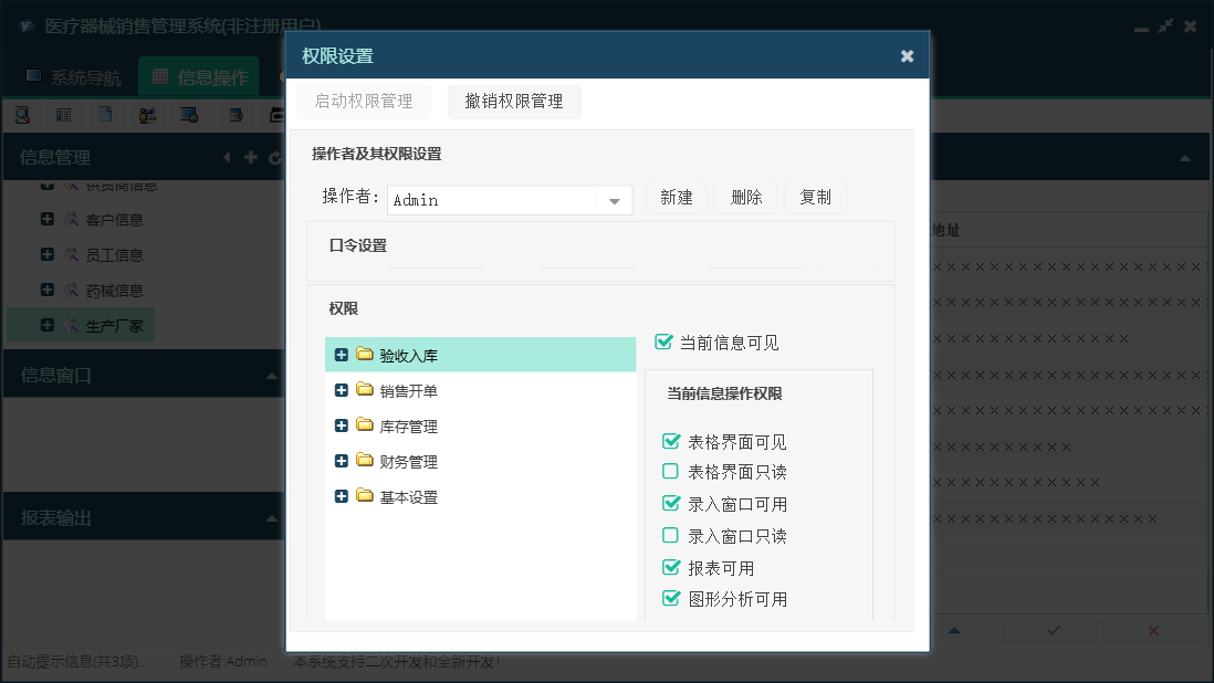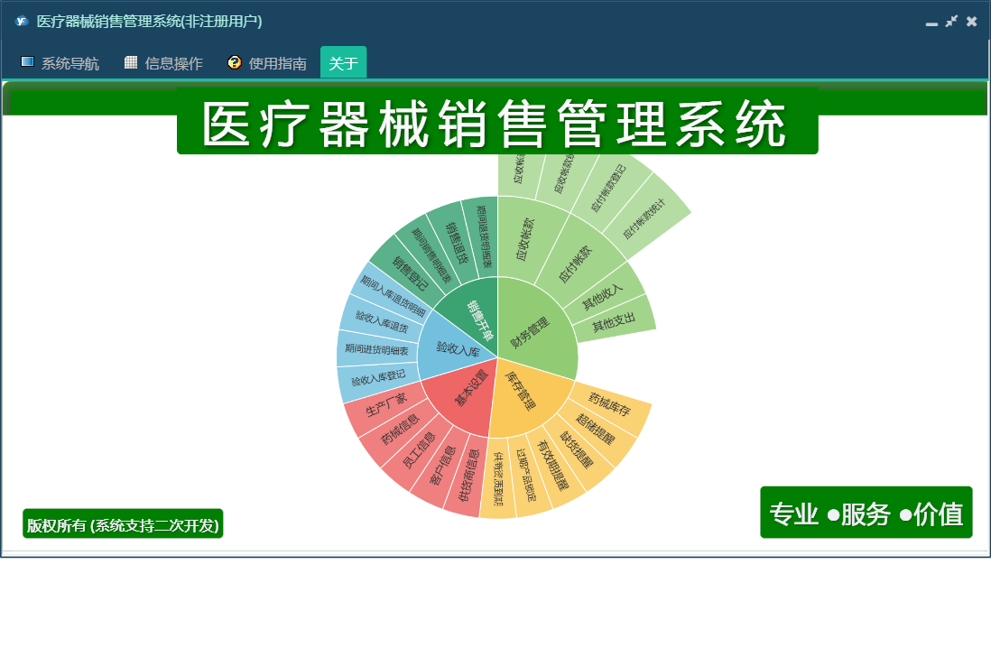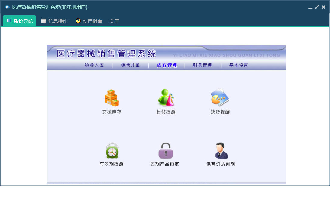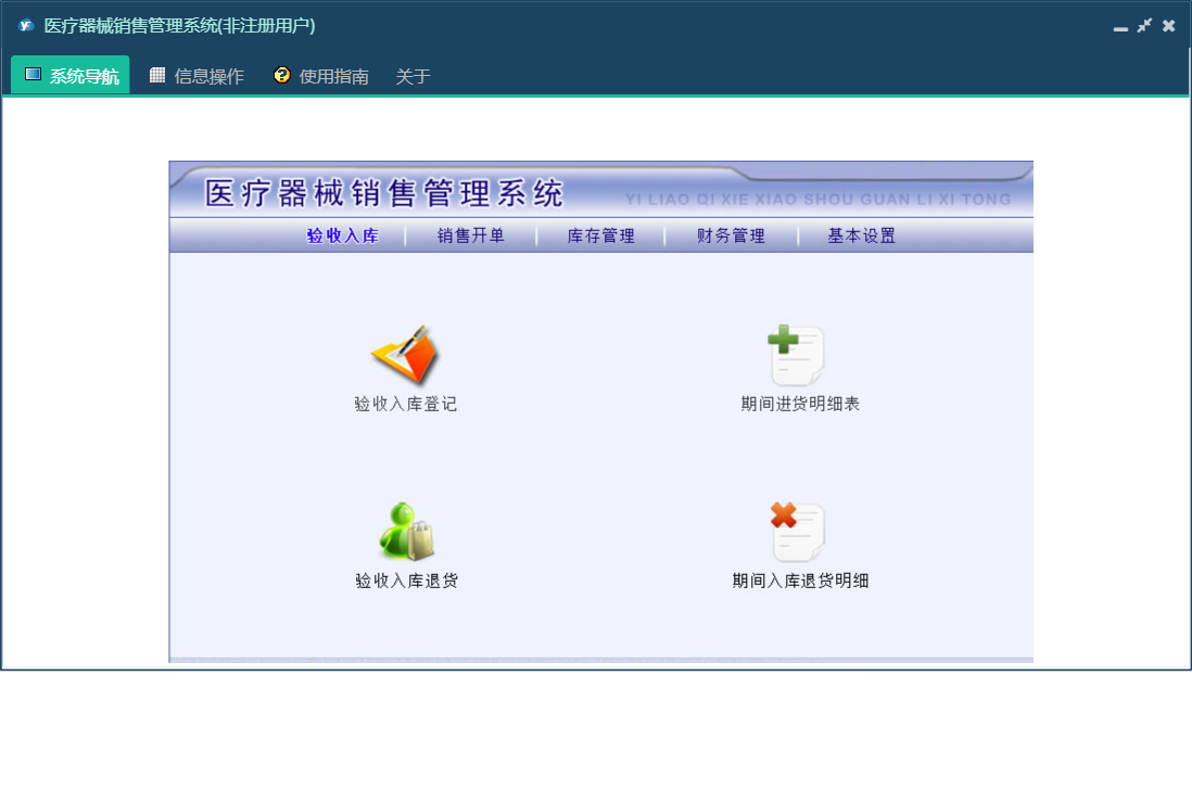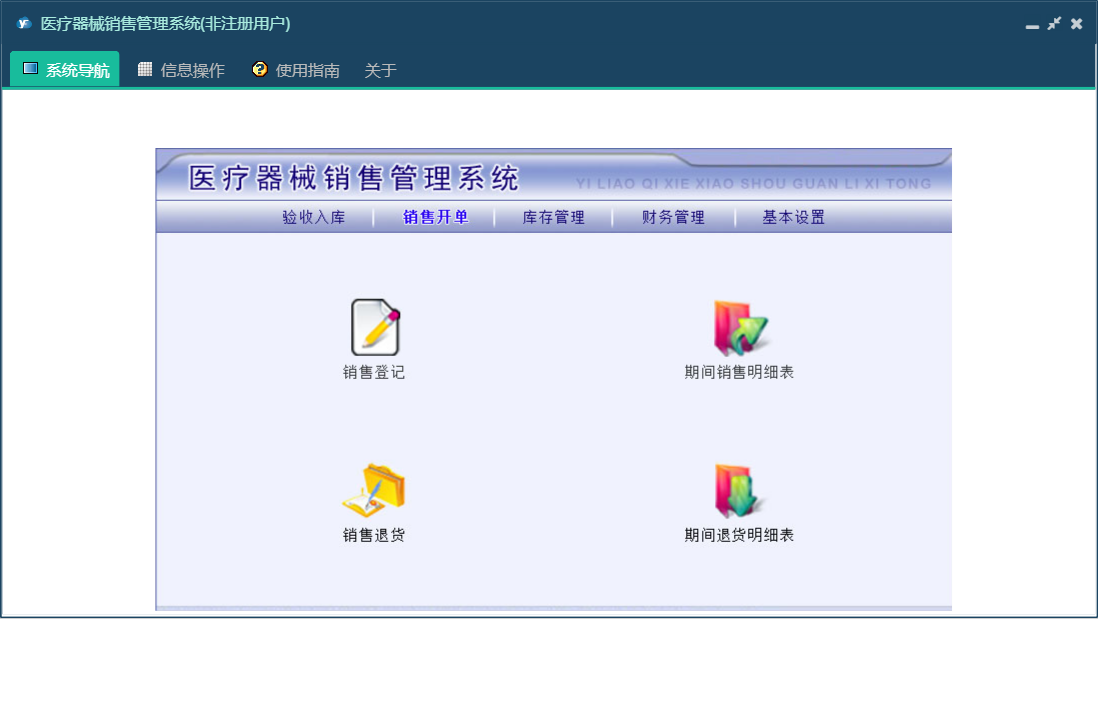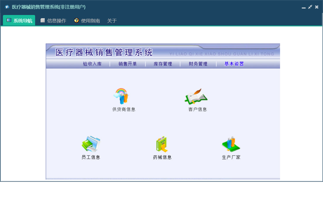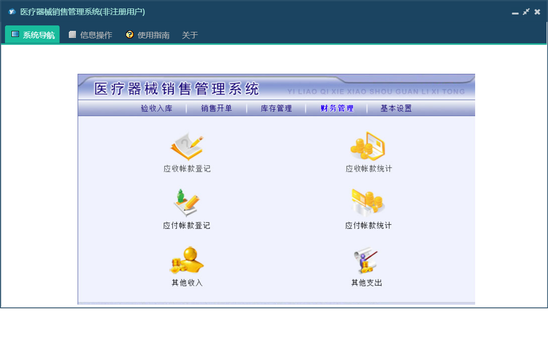 医疗器械销售管理系统包含以下功能:基本设置、其他收入、财务管理、验收入库登记、其他支出、销售开单、药械信息、销售退货、权限设置、应收帐款登记、库存管理、关于、销售登记、客户信息、员工信息、供货商信息、验收入库退货、应付帐款登记、日志、验收入库、生产厂家等