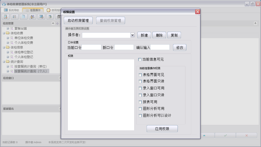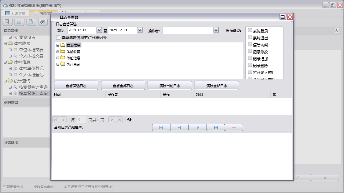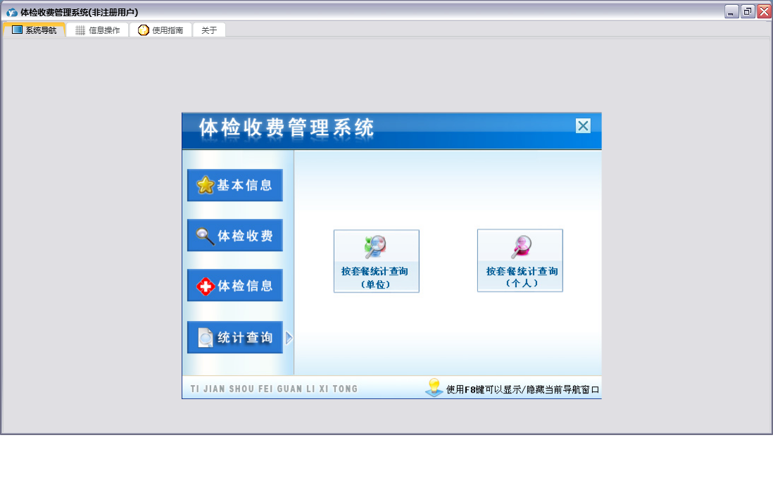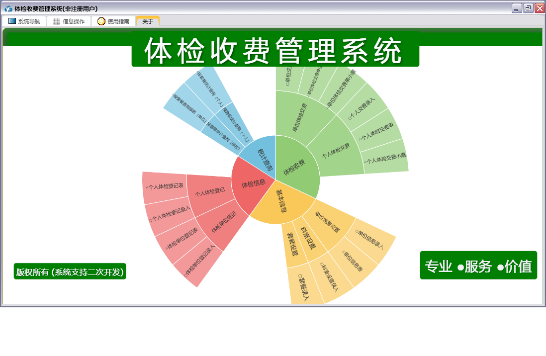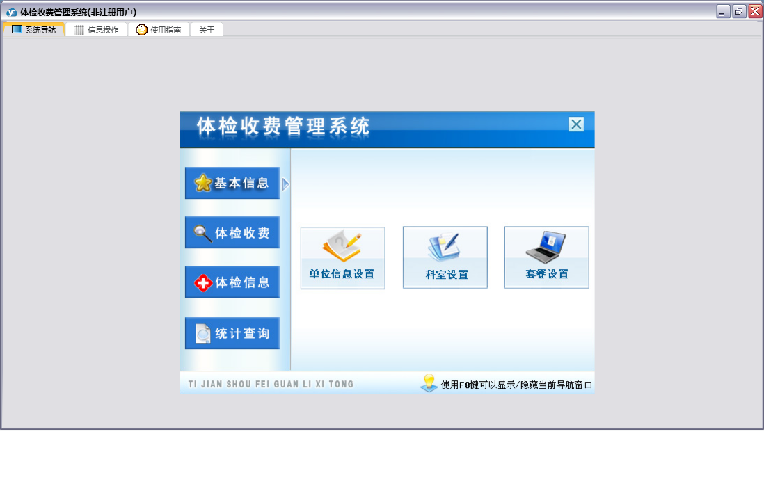 体检收费管理系统包含以下功能:体检信息、单位信息设置、个人体检登记、体检单位登记、日志、套餐设置、关于、权限设置、基本信息、体检收费、统计查询、个人体检交费、单位体检交费、科室设置等