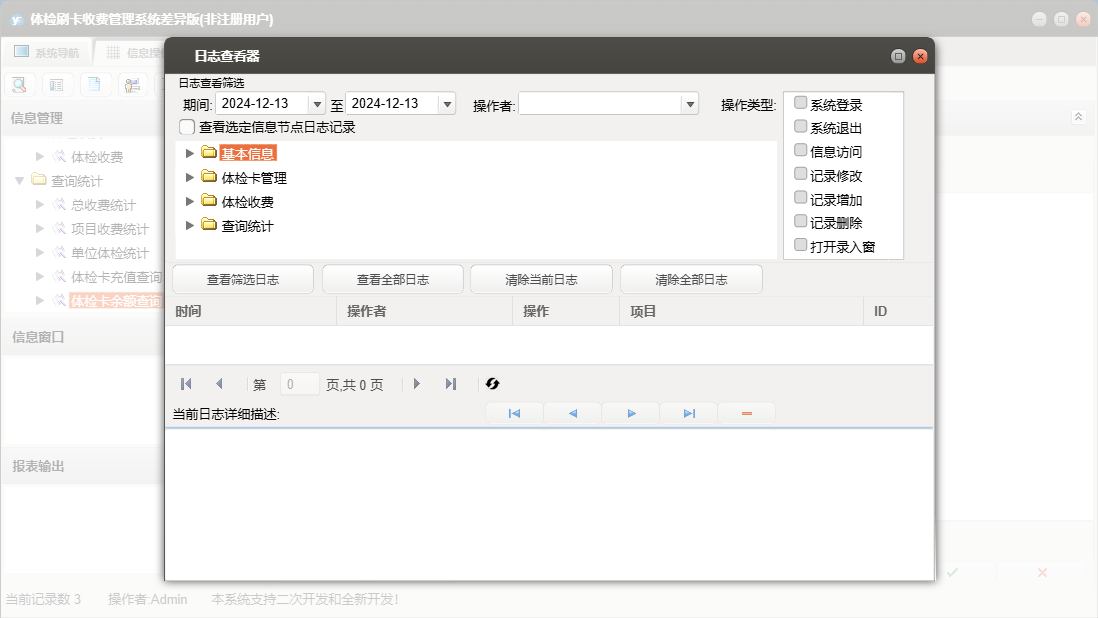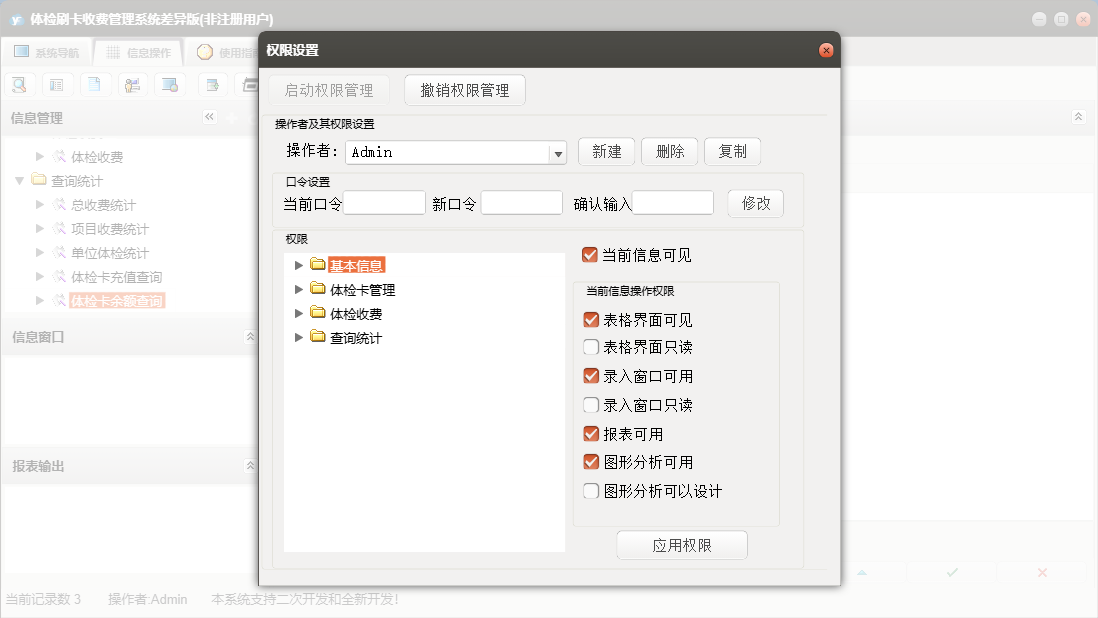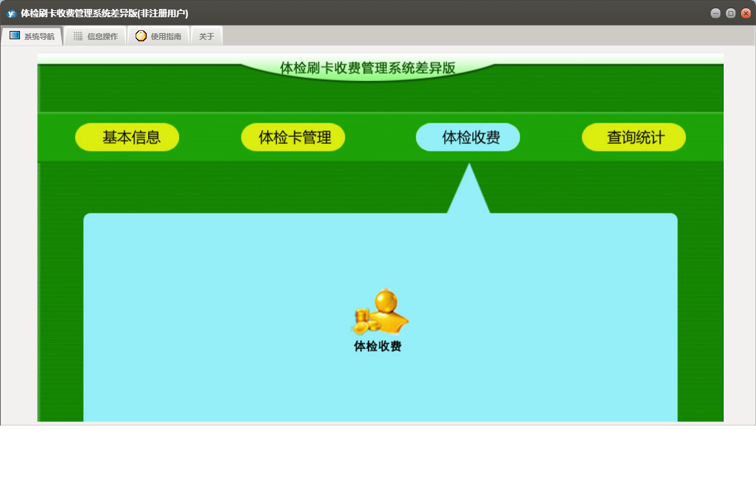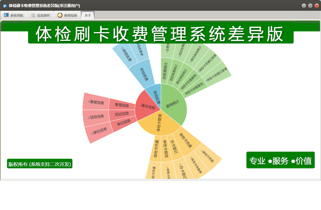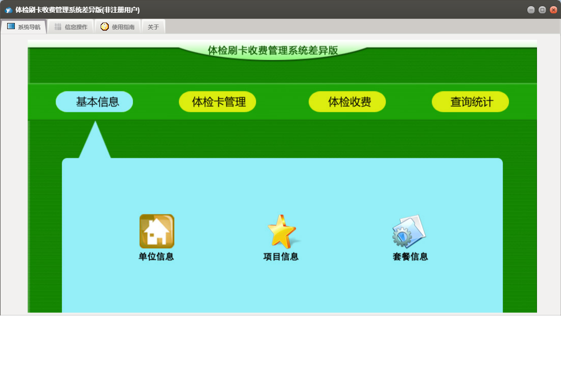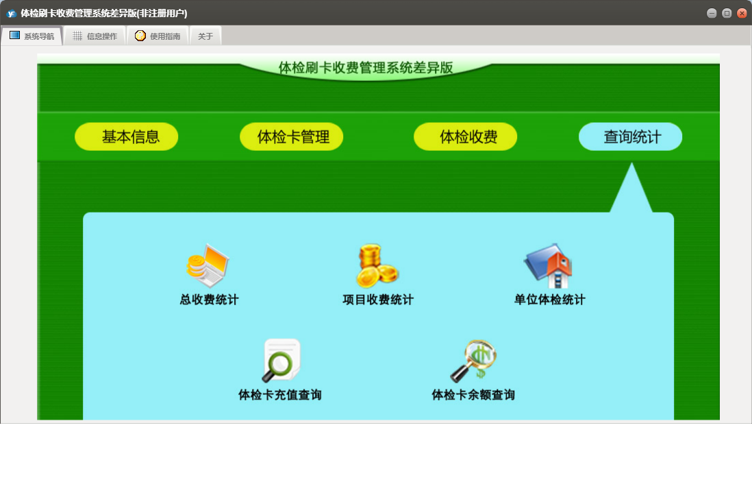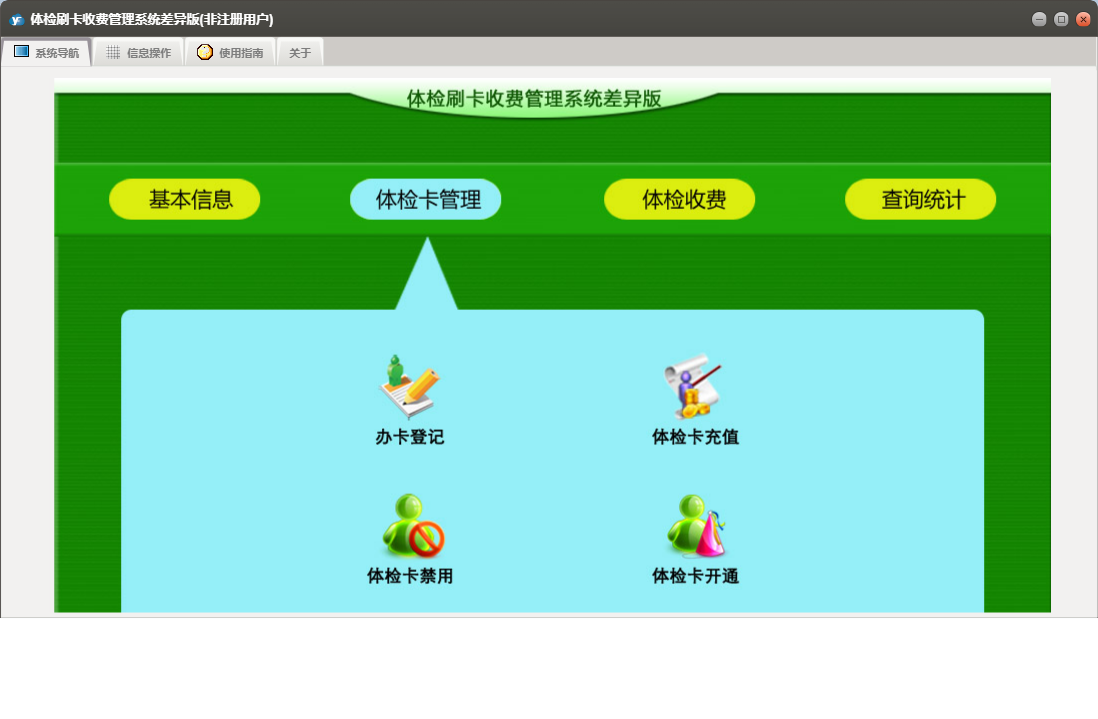 体检刷卡收费管理系统差异版包含以下功能:办卡登记、单位信息、套餐信息、查询统计、体检卡充值、体检卡管理、体检卡禁用、日志、项目信息、体检卡开通、关于、基本信息、权限设置、体检收费等