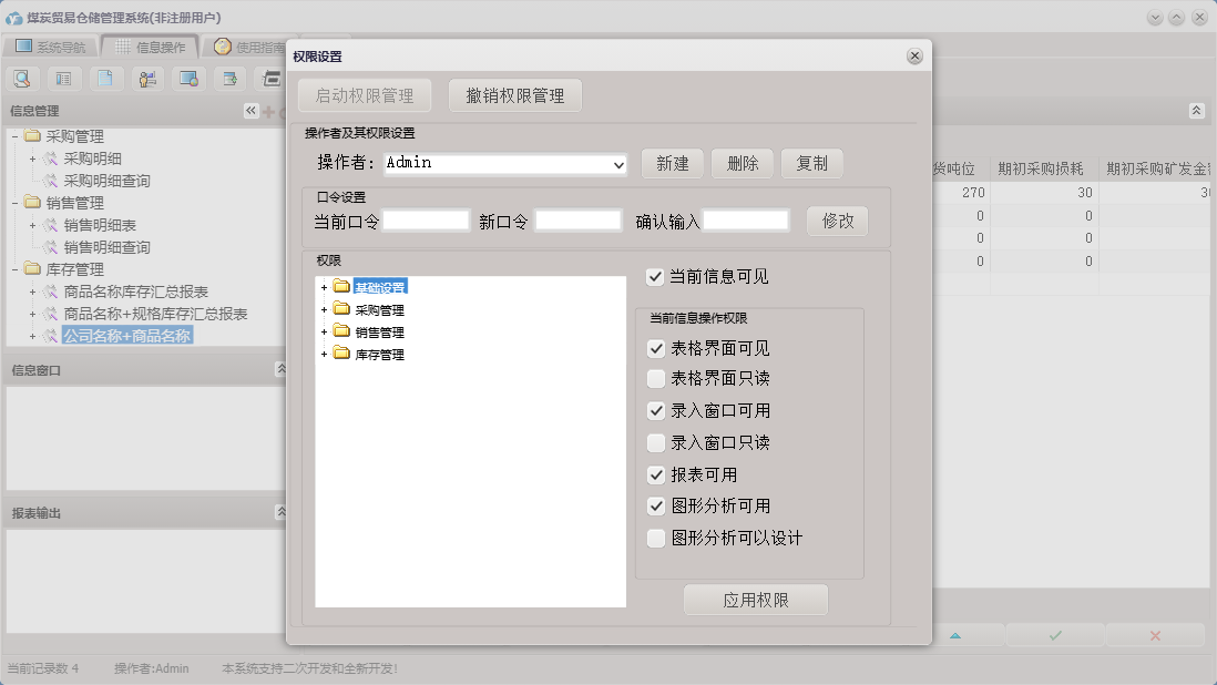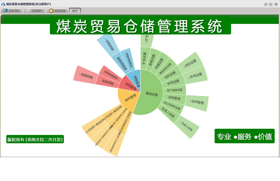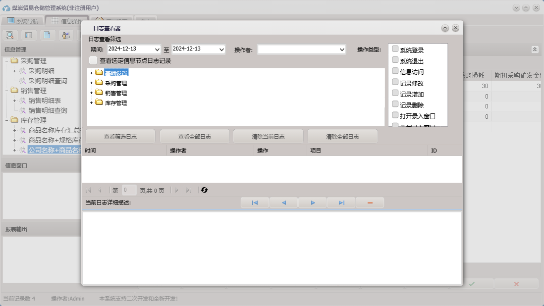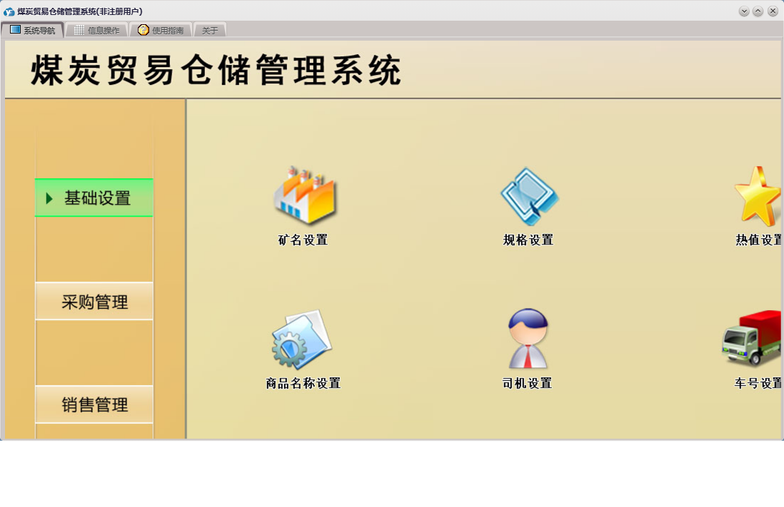 煤炭贸易仓储管理系统包含以下功能:负责人信息、采购明细、销售管理、基础设置、销售明细表、日志、采购管理、库存管理、关于、权限设置、合同管理、司机设置、矿名设置、车号设置等