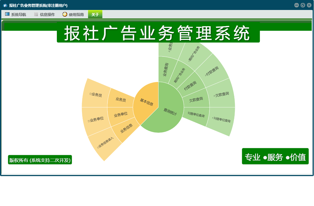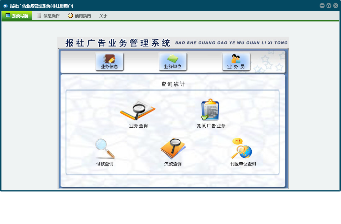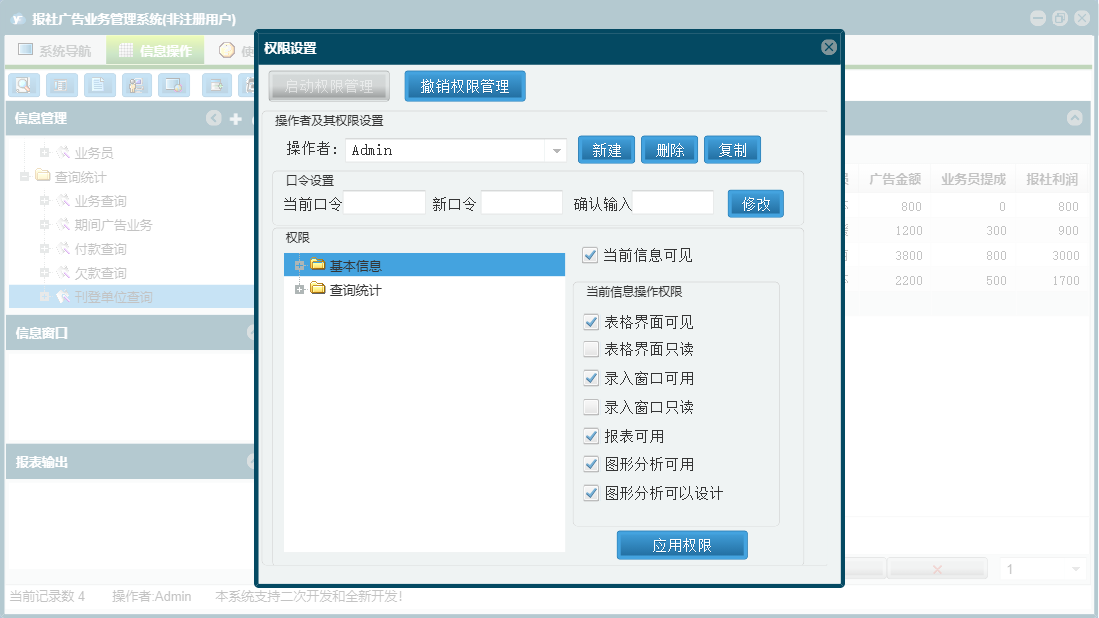 报社广告业务管理系统包含以下功能:业务员、业务单位、日志、关于、权限设置、业务信息、基本信息等