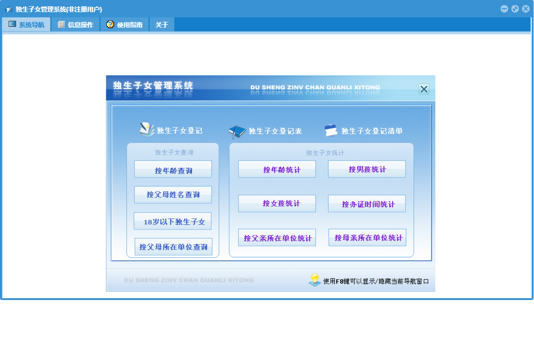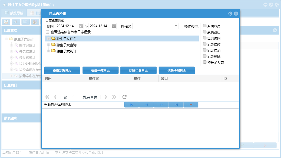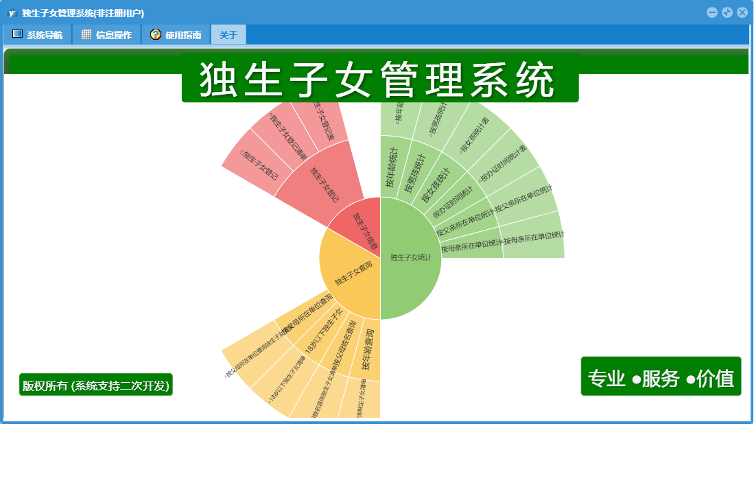 独生子女管理系统包含以下功能:独生子女登记、日志、关于、权限设置、主面板等