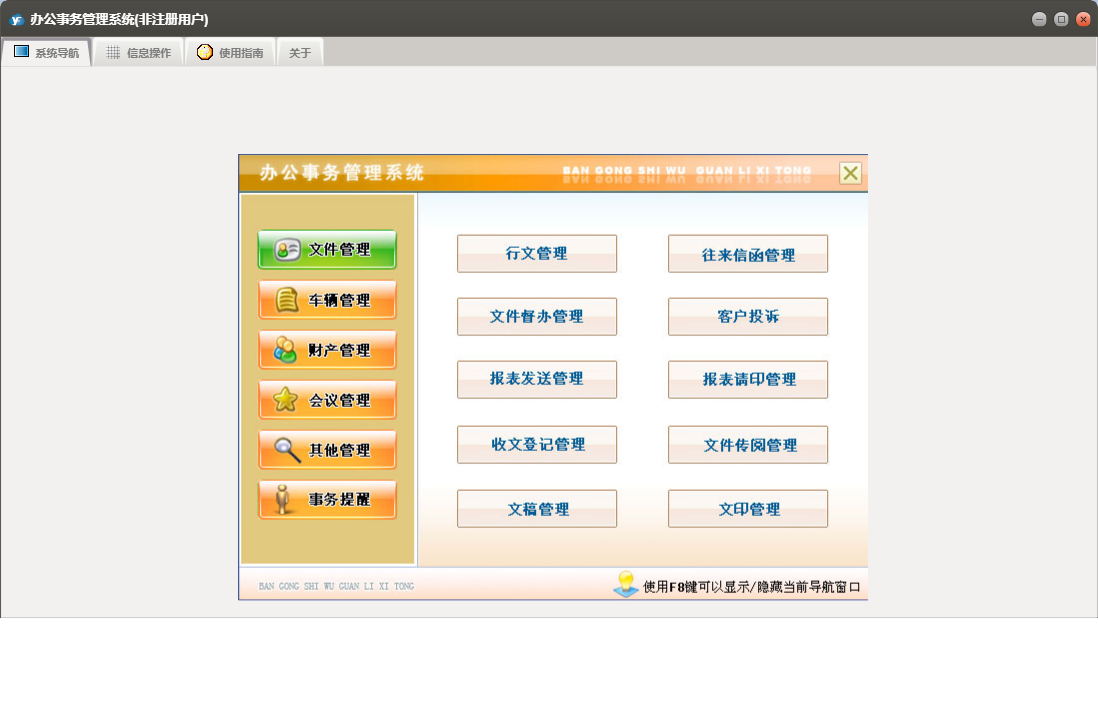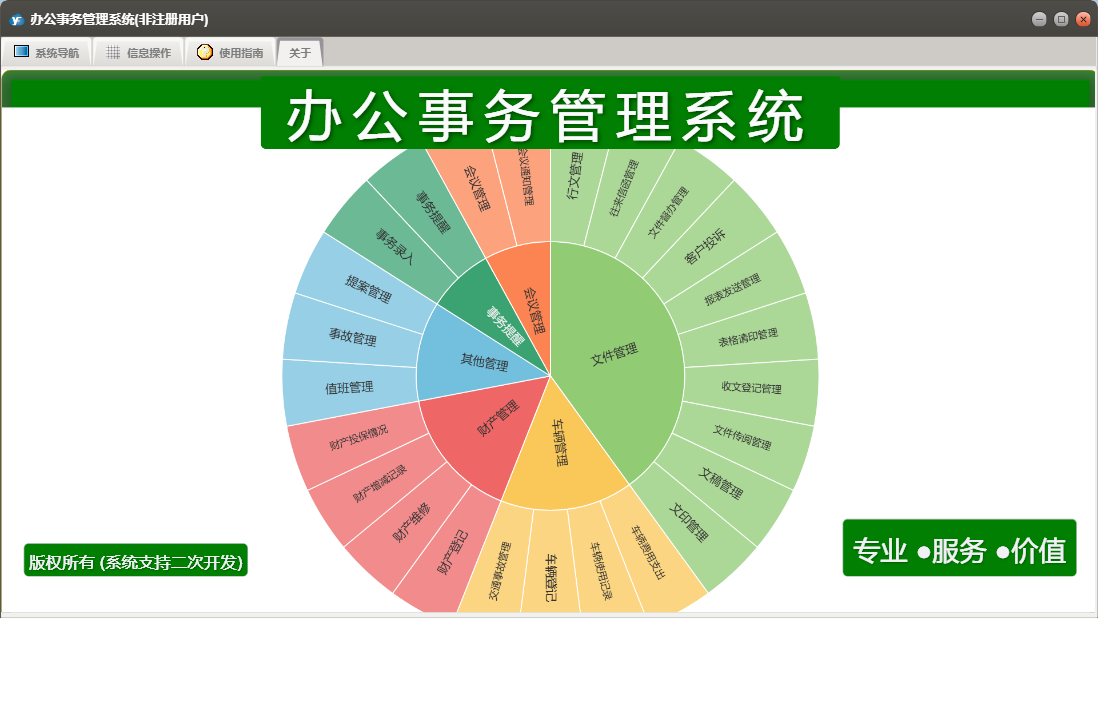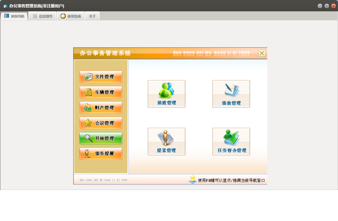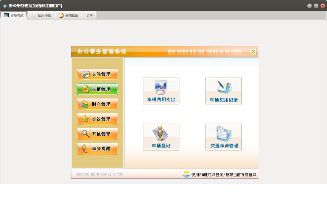 办公事务管理系统包含以下功能:事故管理、车辆使用记录、车辆管理、文件传阅管理、财产维修、会议管理、会议通知管理、文印管理、事务录入、文件管理、文稿管理、财产管理、权限设置、表格请印管理、收文登记管理、财产登记、车辆登记、往来信函管理、财产增减记录、文件督办管理、关于、其他管理、交通事故管理、报表发送管理、客户投诉、财产投保情况、值班管理、行文管理、提案管理、事务提醒、日志、车辆费用支出等