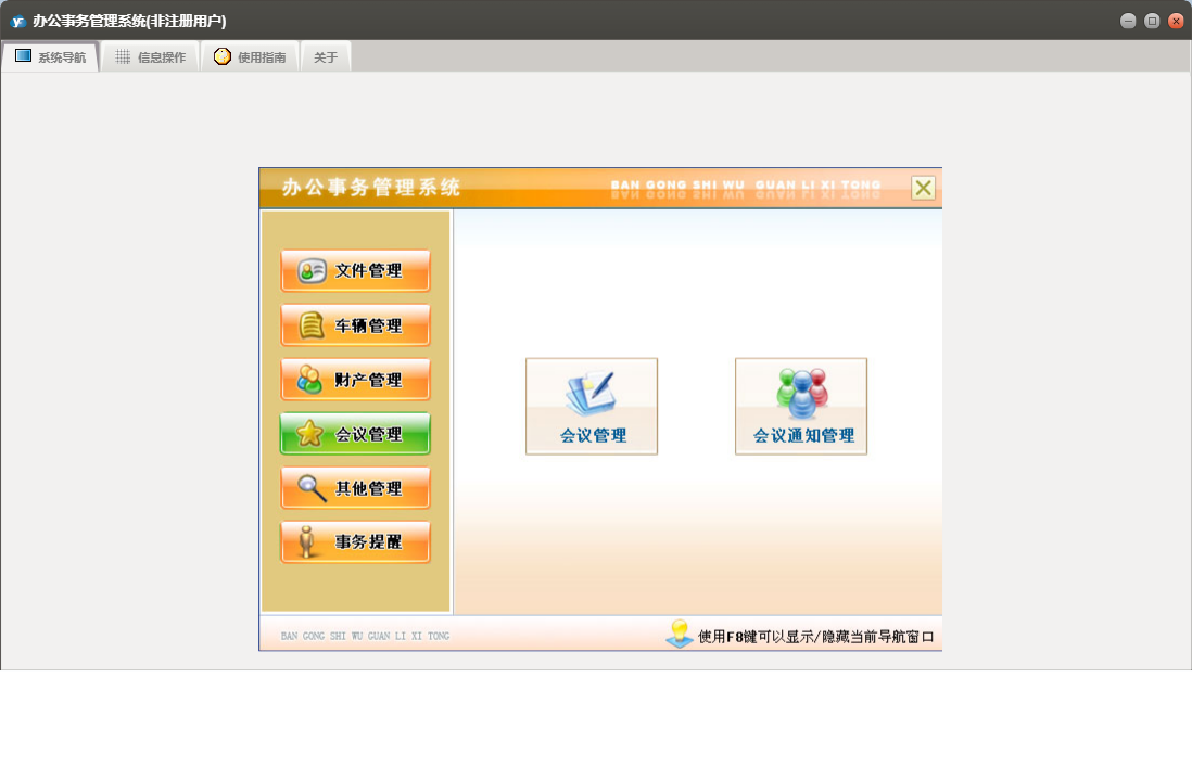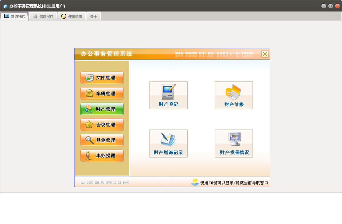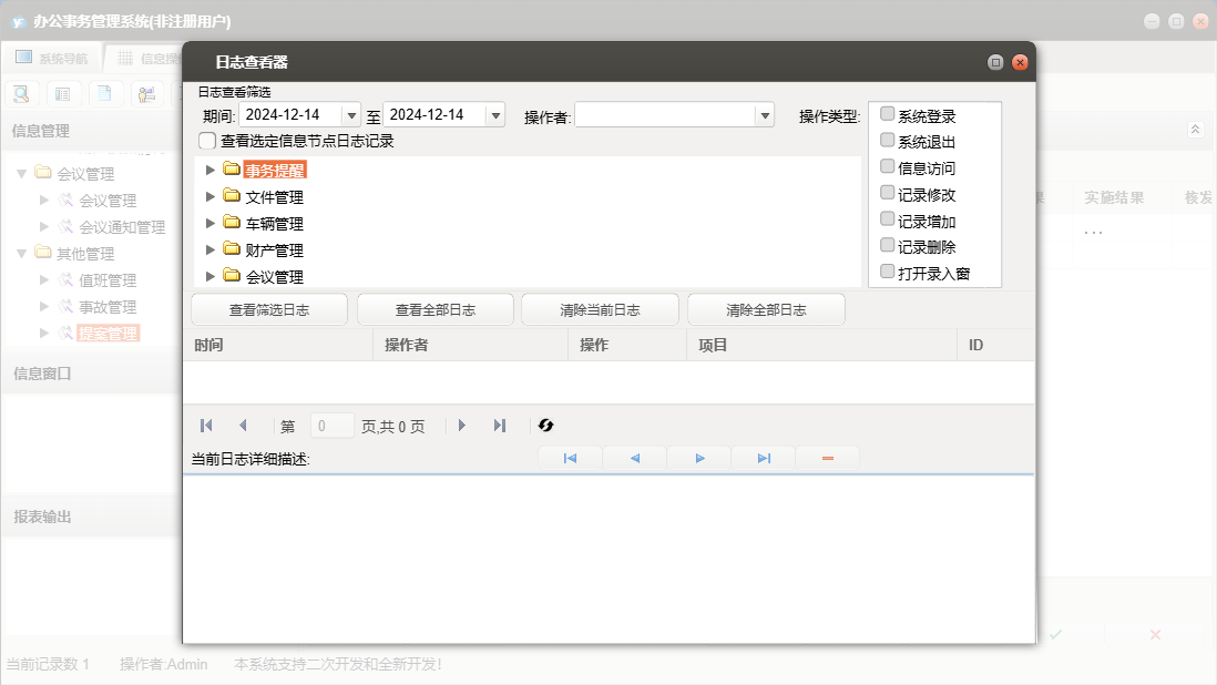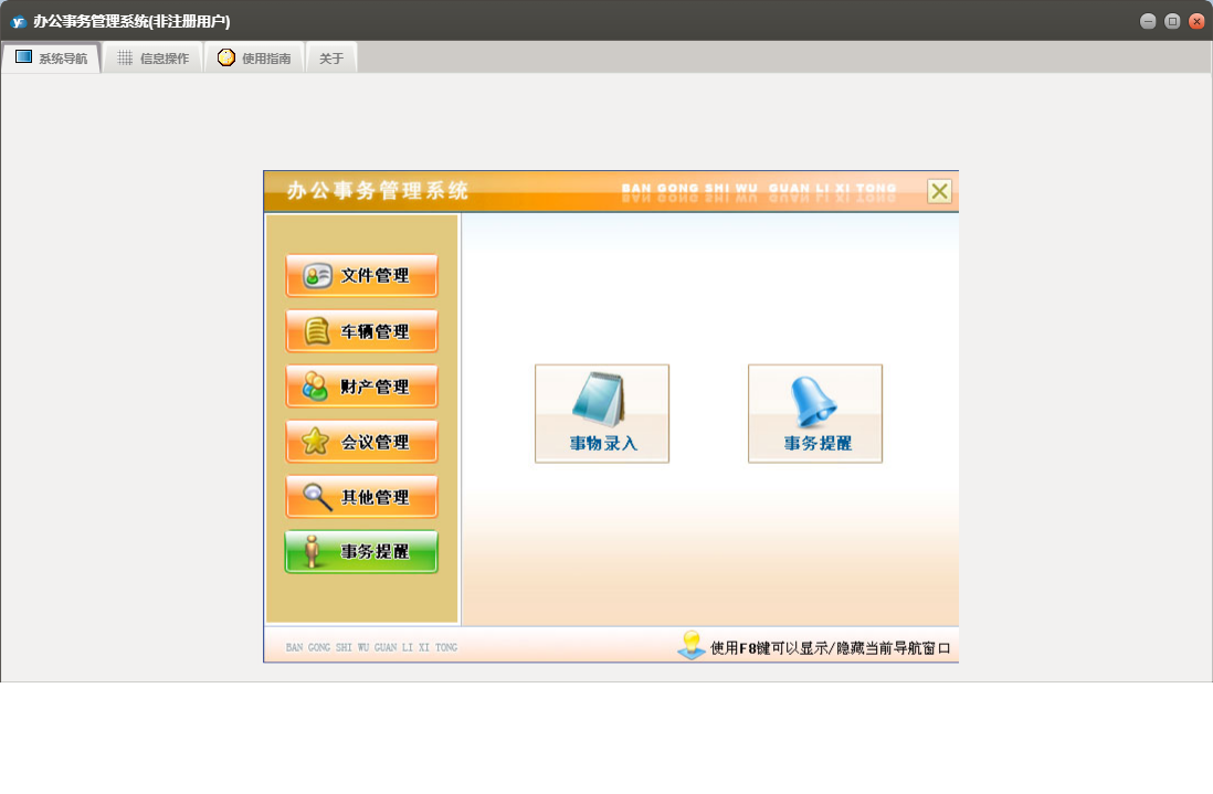 办公事务管理系统包含以下功能:事故管理、车辆使用记录、车辆管理、文件传阅管理、财产维修、会议管理、会议通知管理、文印管理、事务录入、文件管理、文稿管理、财产管理、权限设置、表格请印管理、收文登记管理、财产登记、车辆登记、往来信函管理、财产增减记录、文件督办管理、关于、其他管理、交通事故管理、报表发送管理、客户投诉、财产投保情况、值班管理、行文管理、提案管理、事务提醒、日志、车辆费用支出等