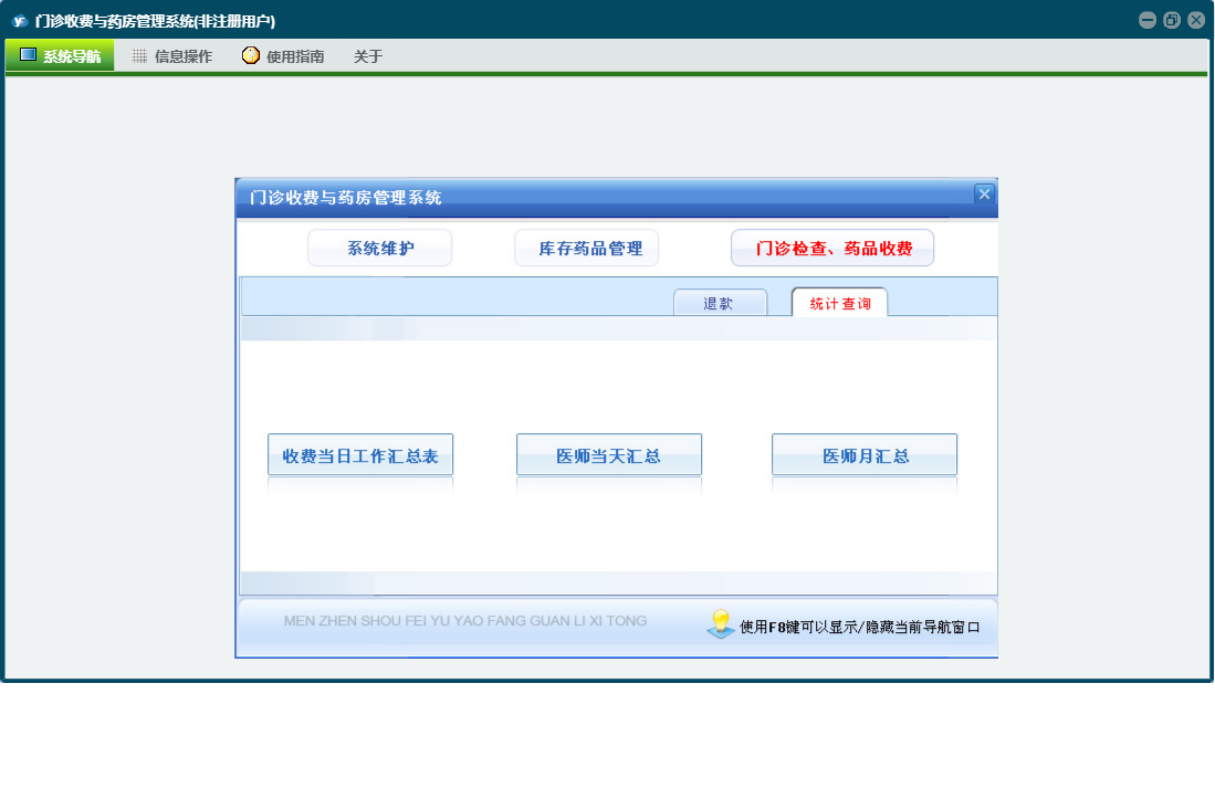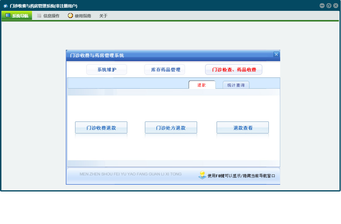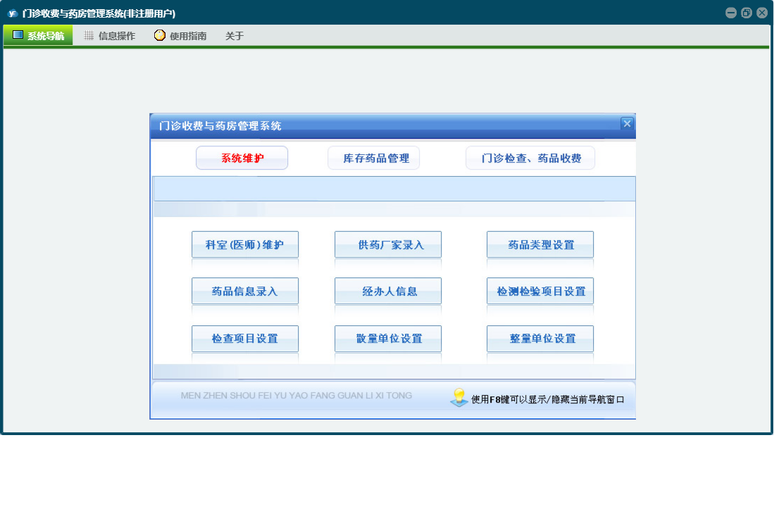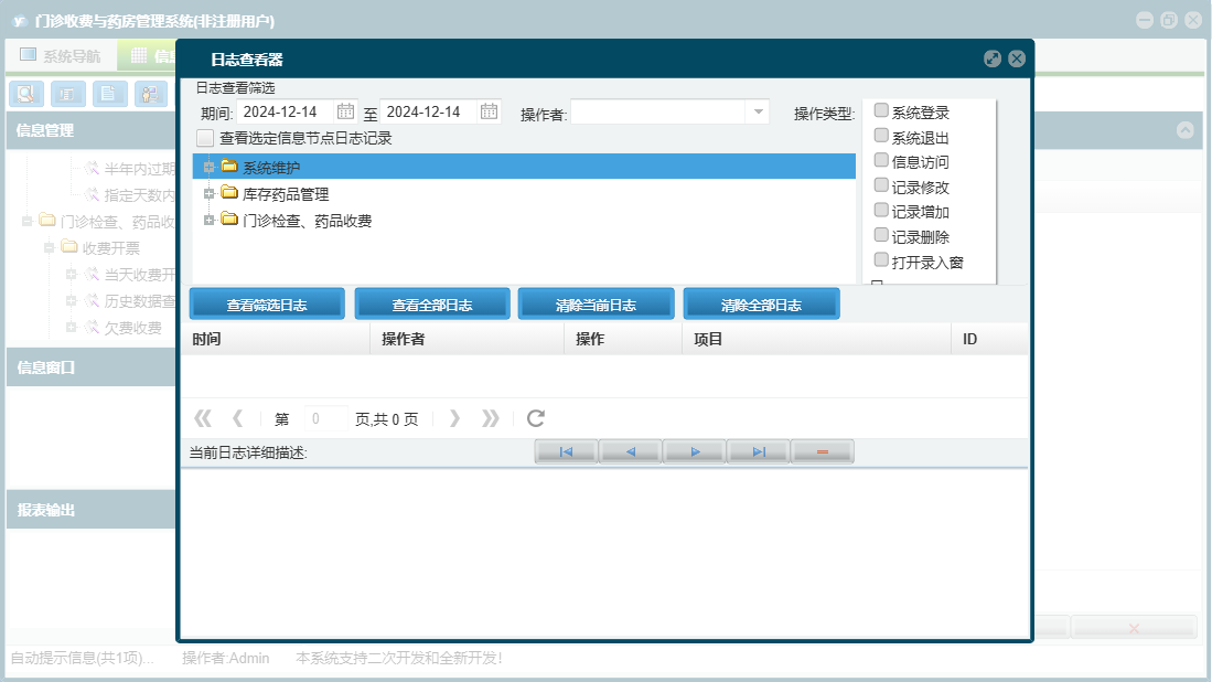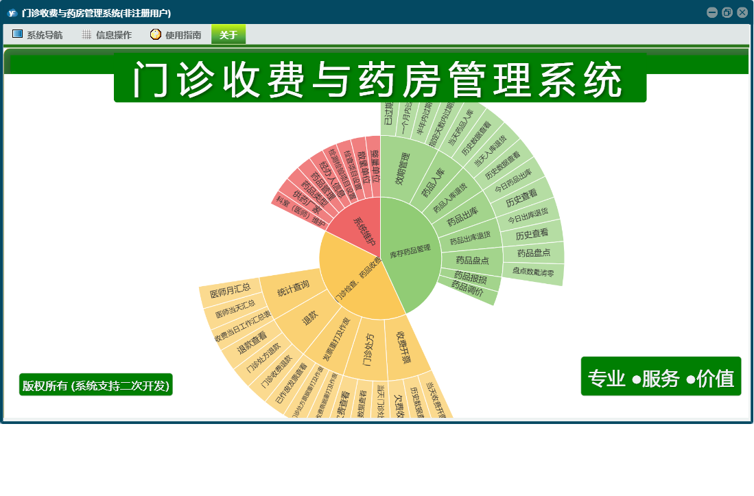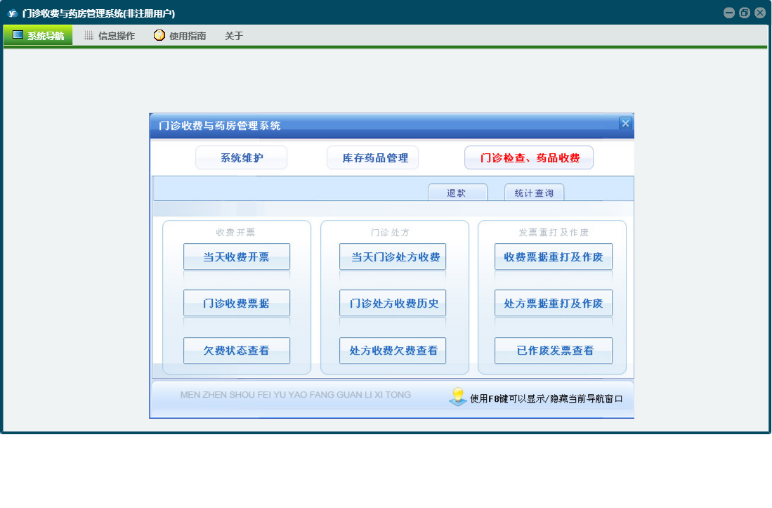 门诊收费与药房管理系统包含以下功能:门诊处方退款、科室(医师)维护、当天药品入库、药品管理、检测检验项目设置、经办人信息、药品报损、欠费查看、当天收费开票、门诊处方票据重打及作废、门诊收费退款、财务查询、门诊检查药品收费、统计查询、权限设置、销售查询、历史数据查看、效期管理、今日出库退货、退款、库存查询、药品调价、关于、当天门诊处方收费、药品盘点、欠费收费、今日药品出库、药品类型、门诊收费票据重打及作废、库存药品管理、日志、采购查询、供药厂家、检查项目设置、系统维护、当天入库退货等