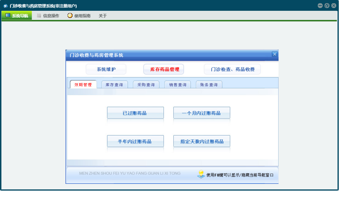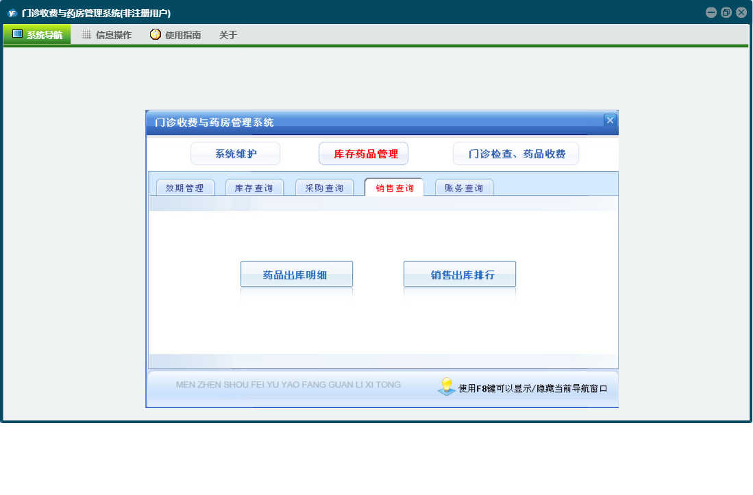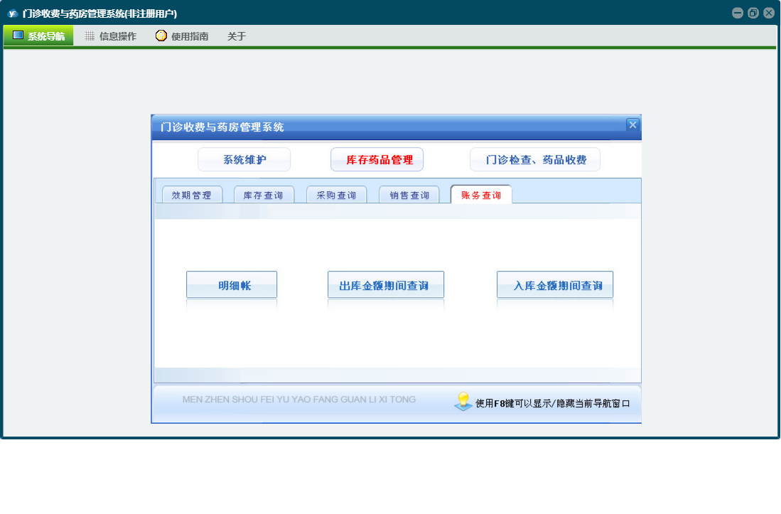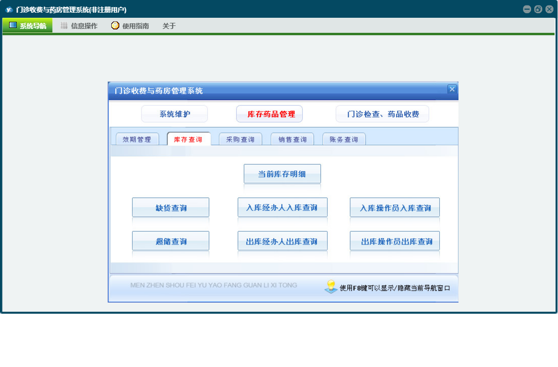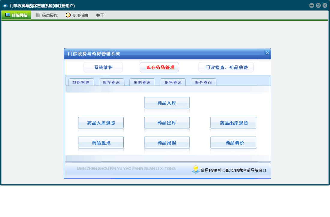 门诊收费与药房管理系统包含以下功能:门诊处方退款、科室(医师)维护、当天药品入库、药品管理、检测检验项目设置、经办人信息、药品报损、欠费查看、当天收费开票、门诊处方票据重打及作废、门诊收费退款、财务查询、门诊检查药品收费、统计查询、权限设置、销售查询、历史数据查看、效期管理、今日出库退货、退款、库存查询、药品调价、关于、当天门诊处方收费、药品盘点、欠费收费、今日药品出库、药品类型、门诊收费票据重打及作废、库存药品管理、日志、采购查询、供药厂家、检查项目设置、系统维护、当天入库退货等