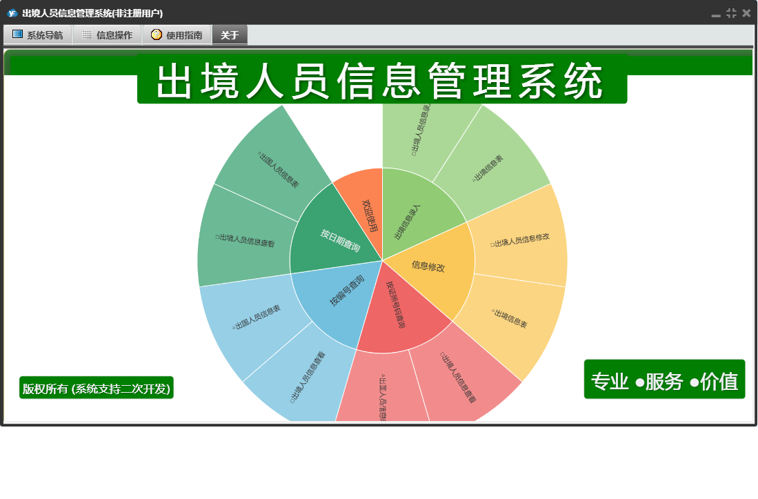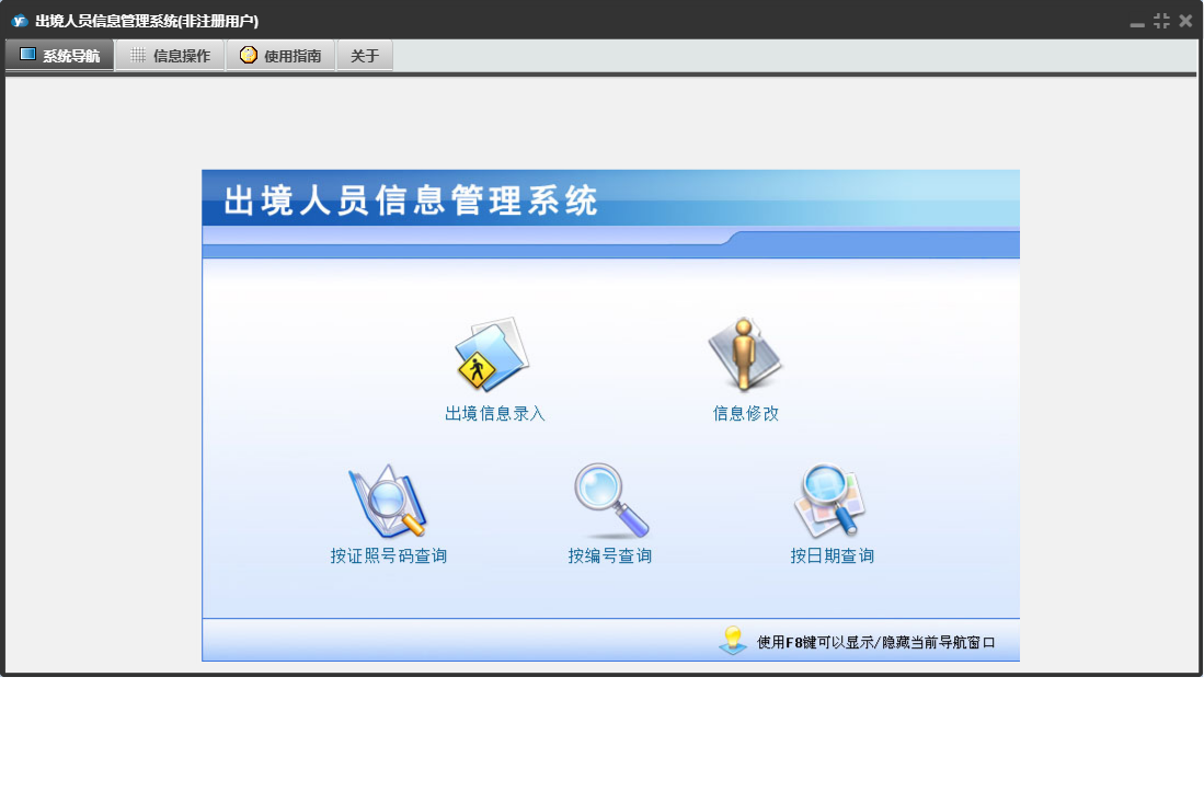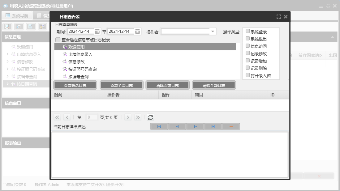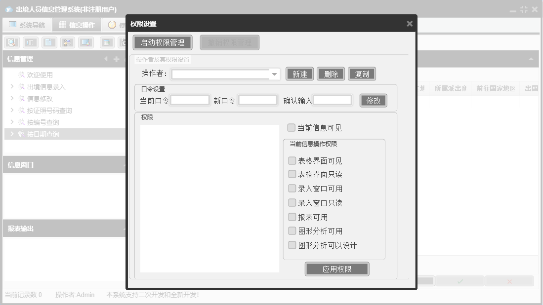 出境人员信息管理系统包含以下功能:面板、按日期查询、日志、按编号查询、关于、权限设置、信息修改、按证照号码查询等