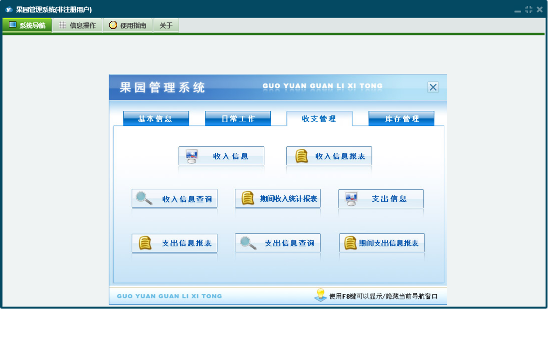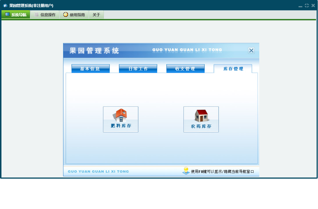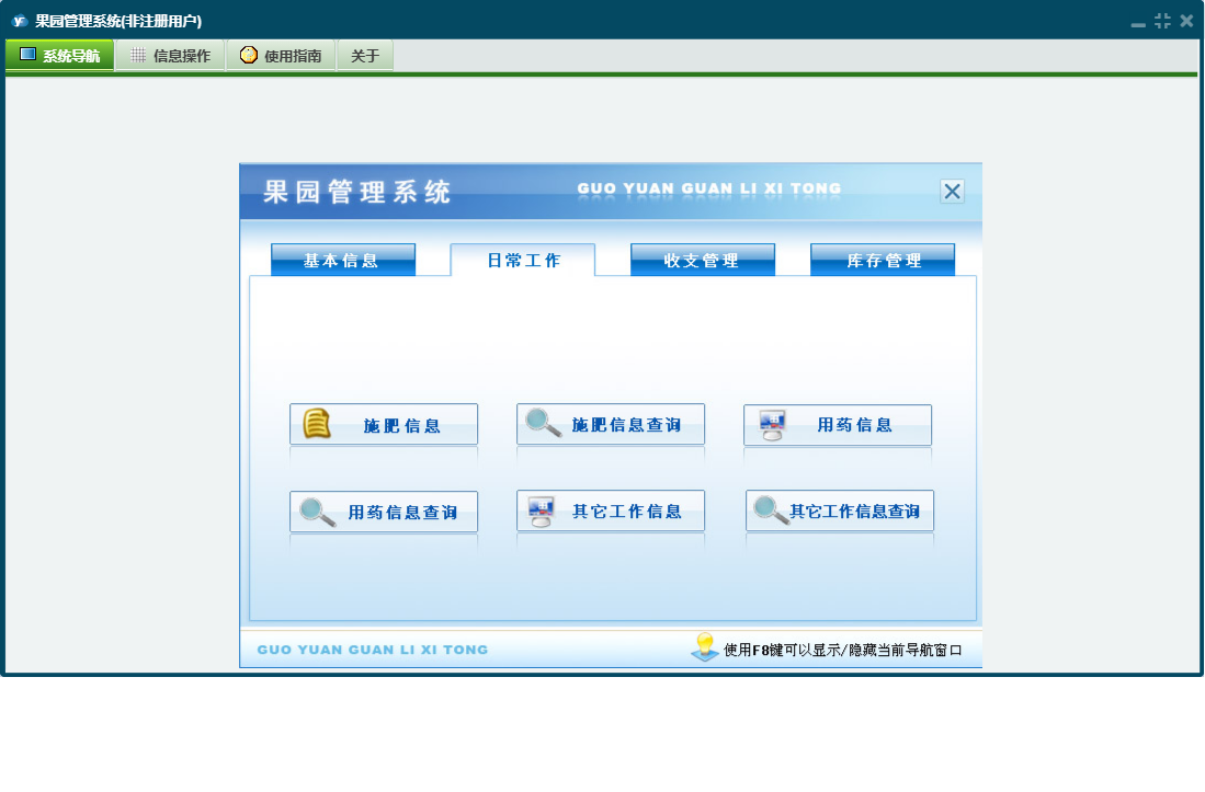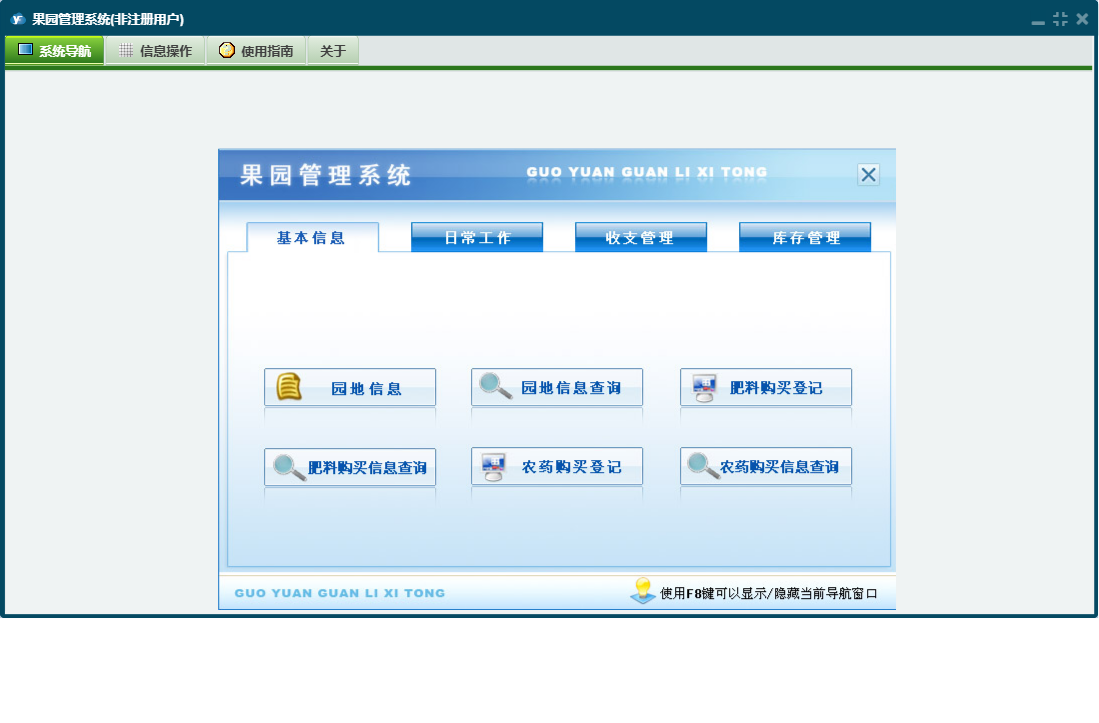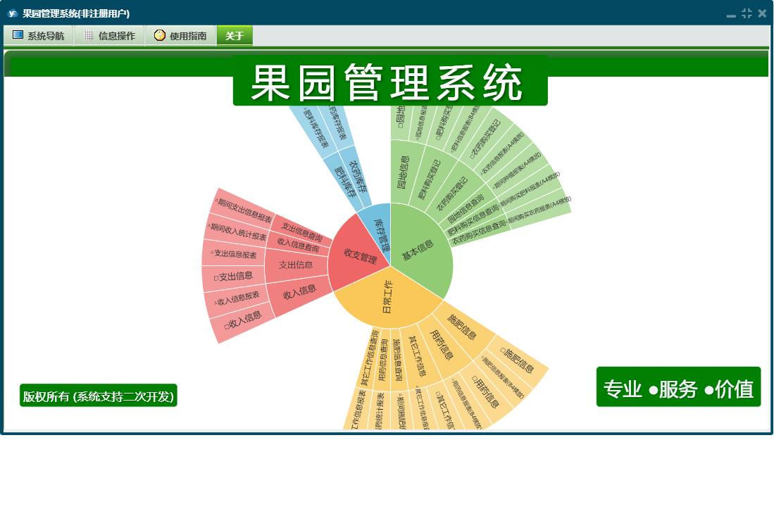 果园管理系统包含以下功能:用药信息、支出信息、施肥信息、日常工作、园地信息、肥料购买登记、日志、库存管理、关于、基本信息、权限设置、收入信息、收支管理、其它工作信息、农药购买登记等