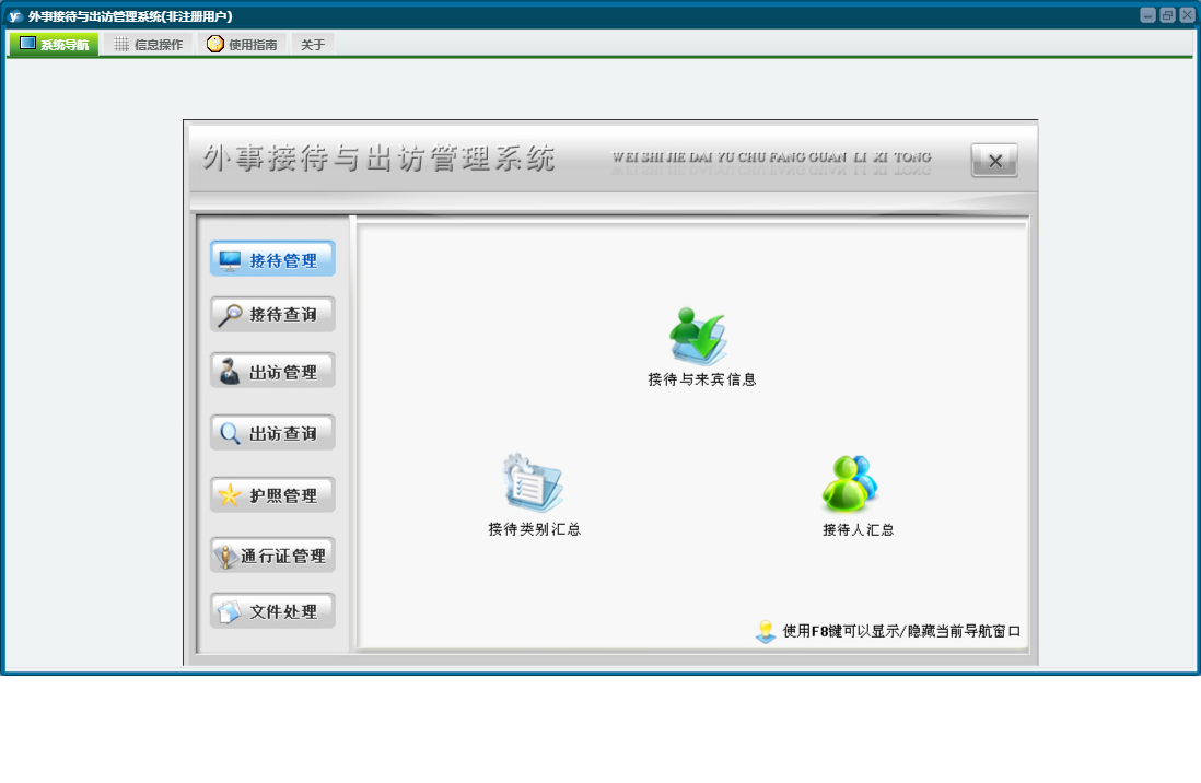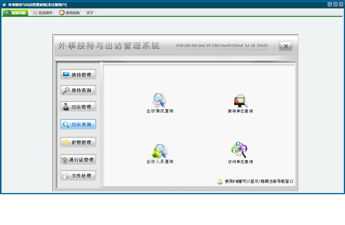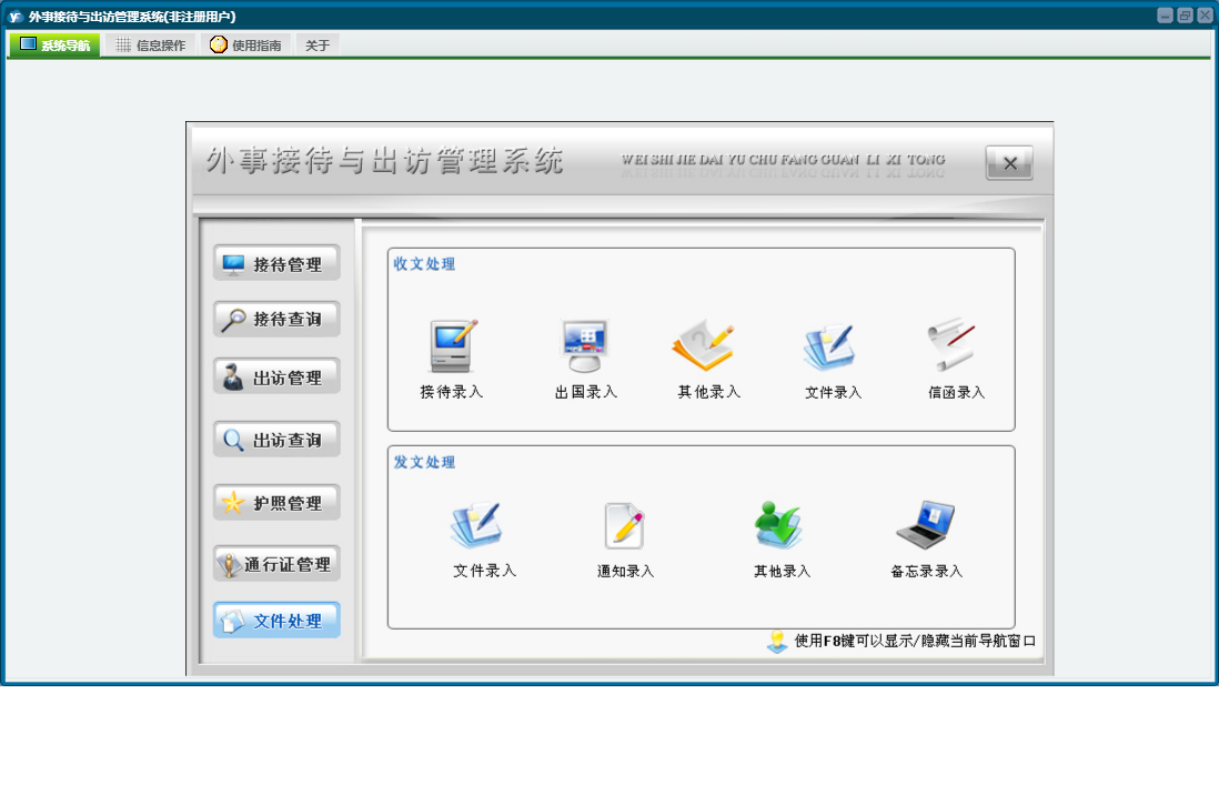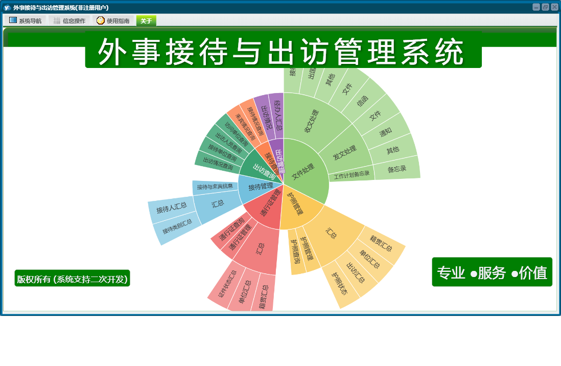 外事接待与出访管理系统包含以下功能:通知、出访查询、权限设置、出访情况、出访管理、通行证管理、接待管理、文件、出国、接待、关于、信函、其他、备忘录、接待查询、日志、接待与来宾信息、文件处理、护照管理等