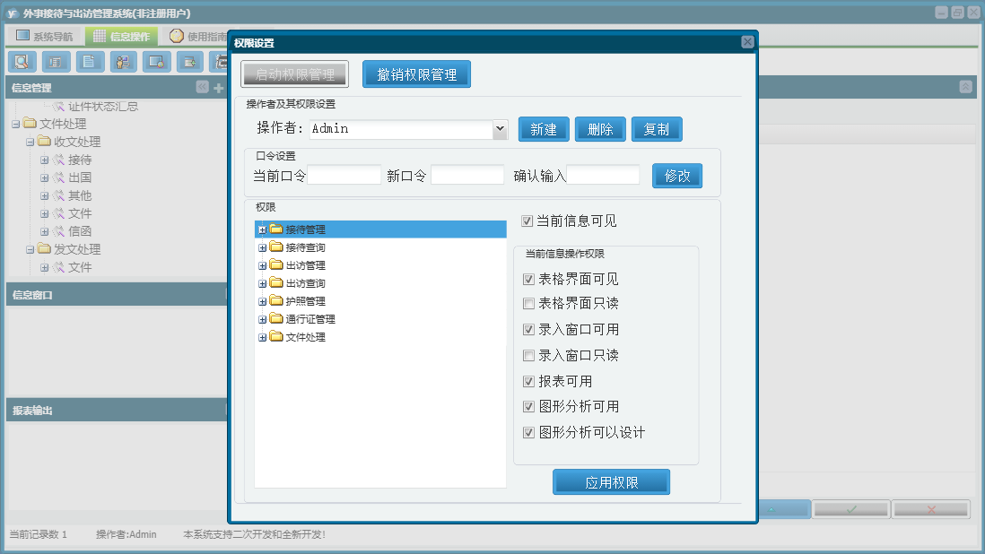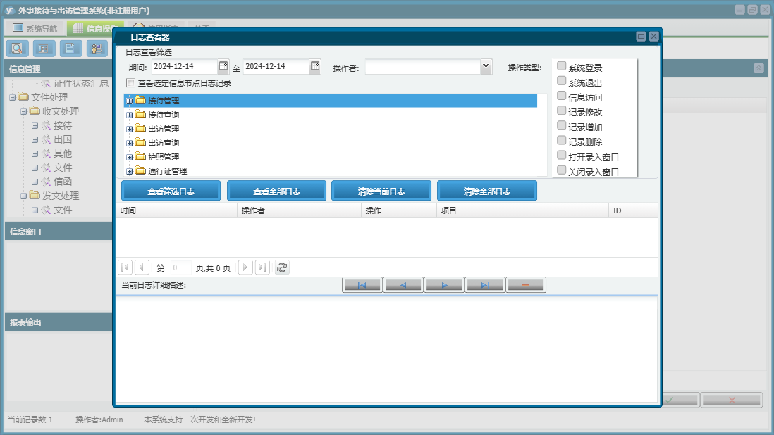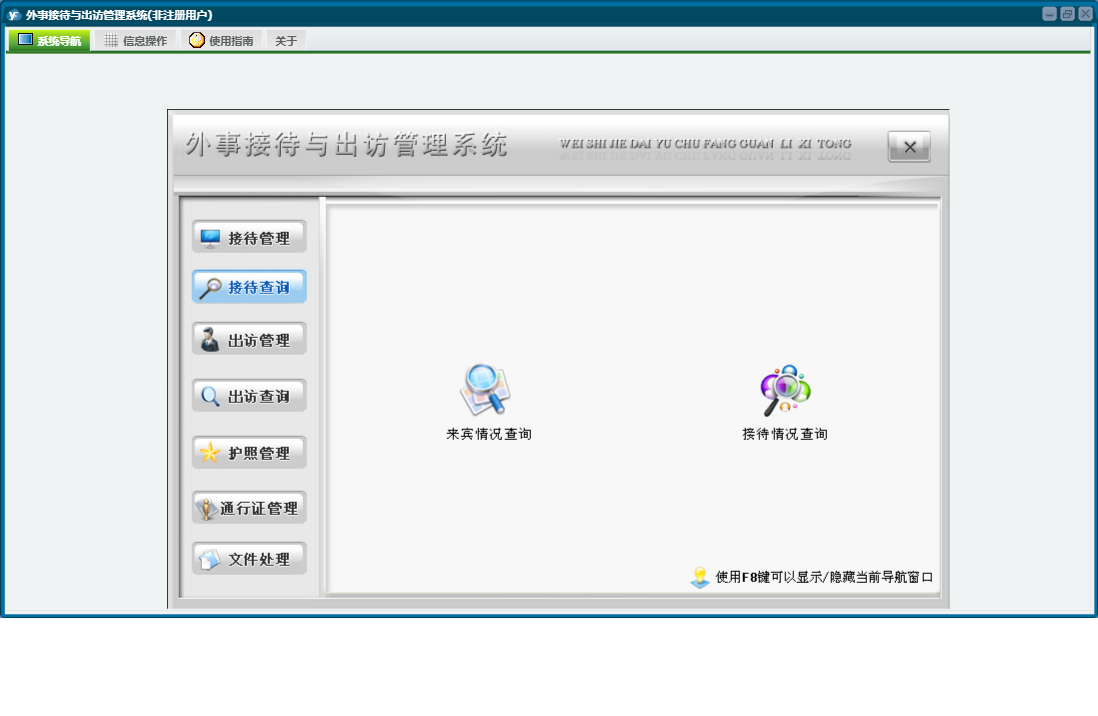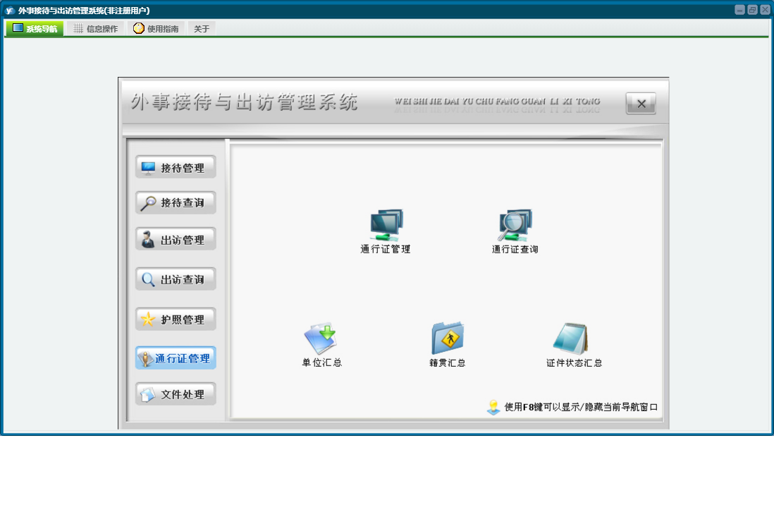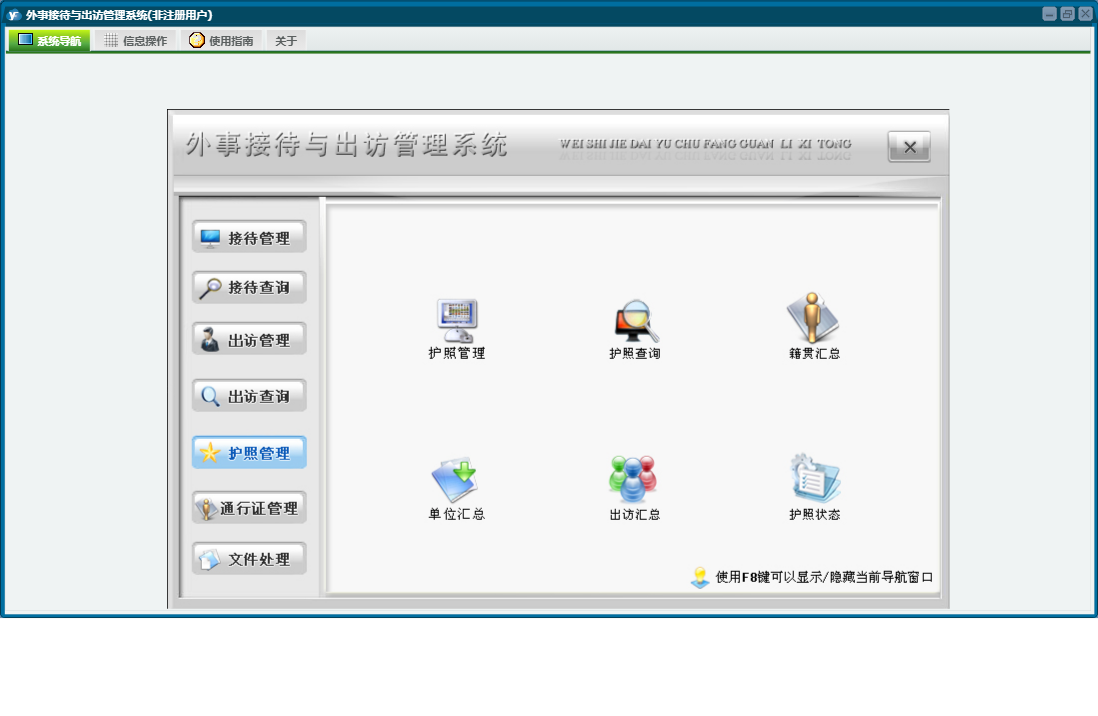 外事接待与出访管理系统包含以下功能:通知、出访查询、权限设置、出访情况、出访管理、通行证管理、接待管理、文件、出国、接待、关于、信函、其他、备忘录、接待查询、日志、接待与来宾信息、文件处理、护照管理等