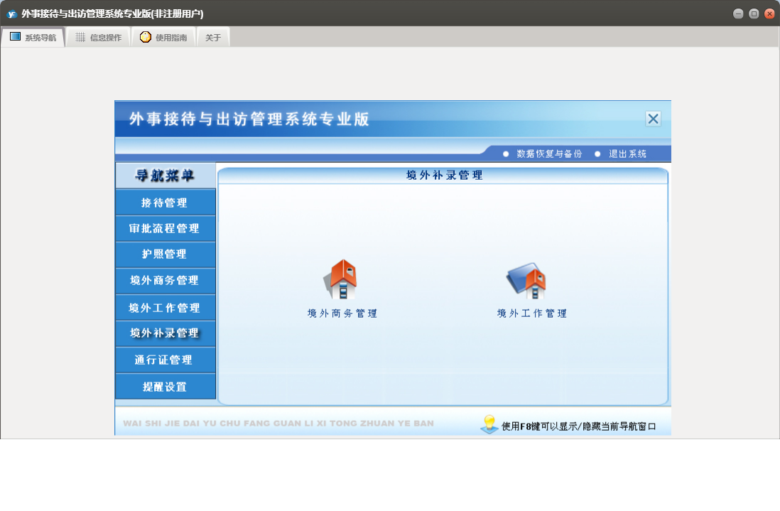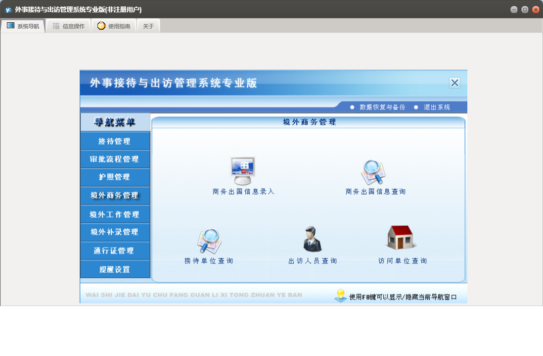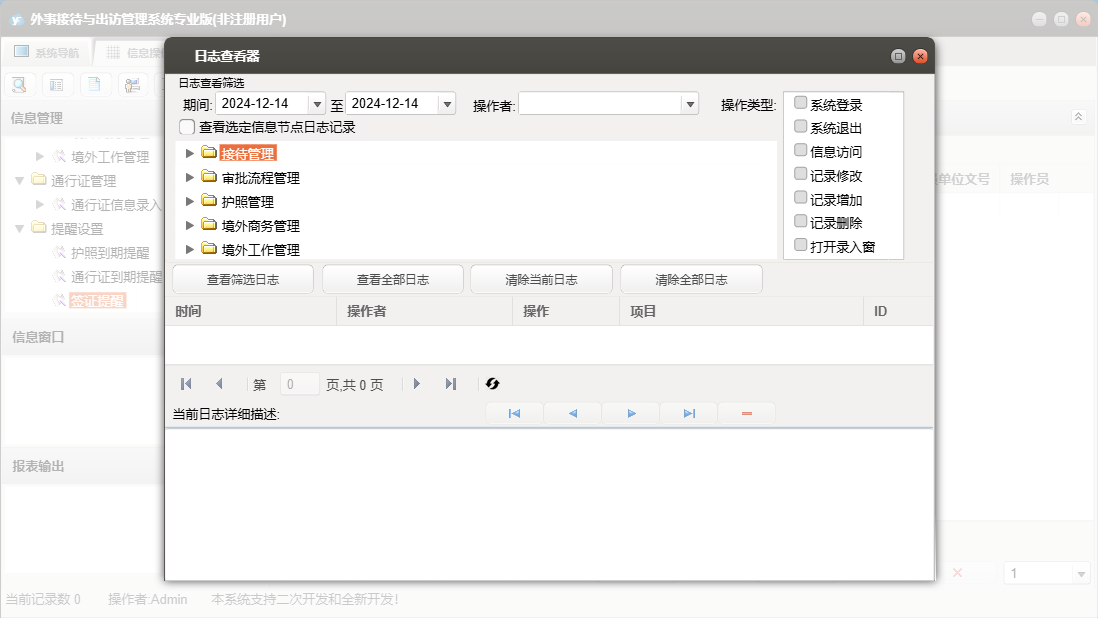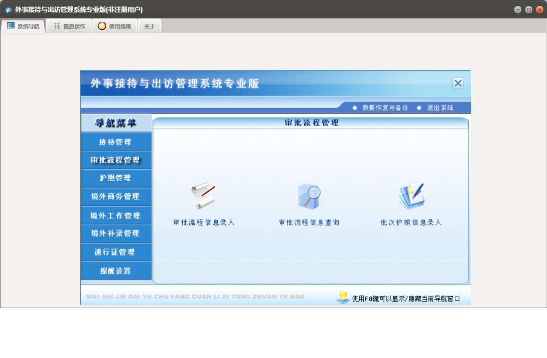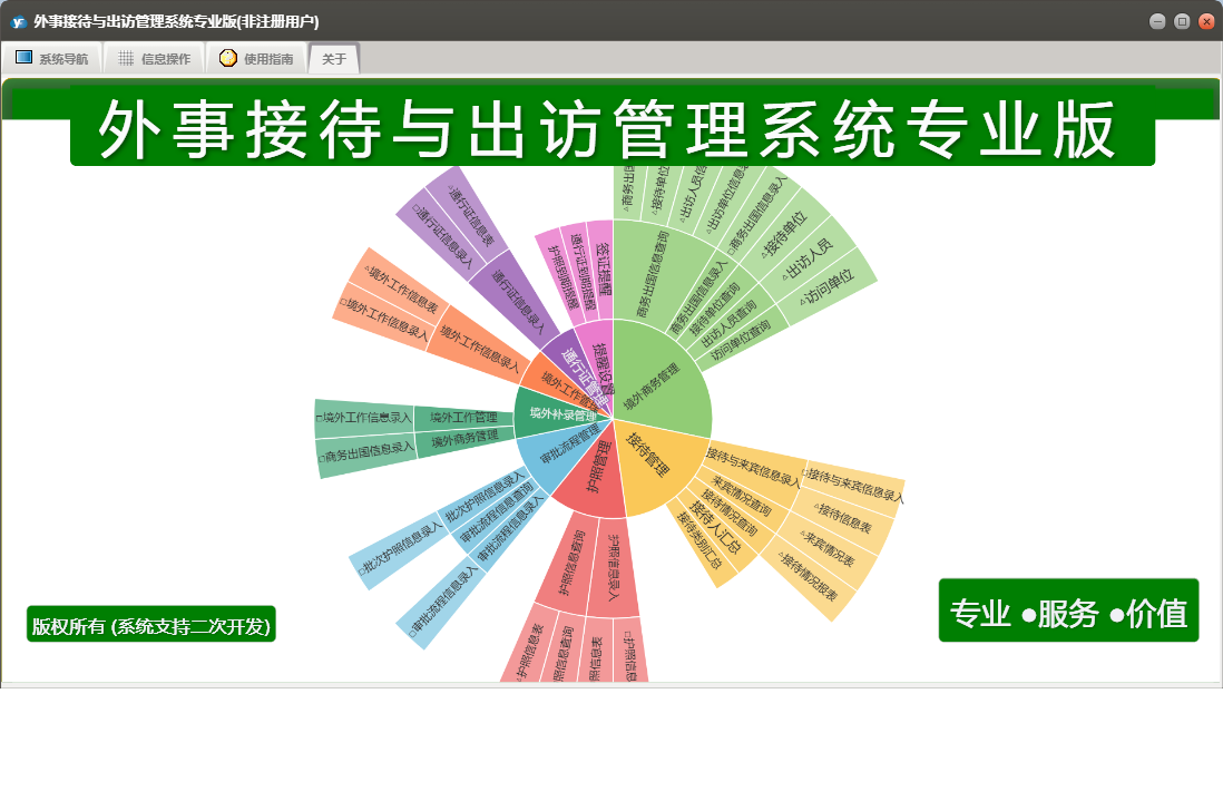外事接待与出访管理系统专业版包含以下功能:提醒管理、境外补录管理、审批流程信息录入、境外工作管理、护照信息录入、权限设置、境外工作信息录入、境外商务管理、接待与来宾信息录入、批次护照信息录入、通行证管理、接待管理、关于、审批流程管理、通行证信息录入、日志、护照信息查询、商务出国信息录入、护照管理等