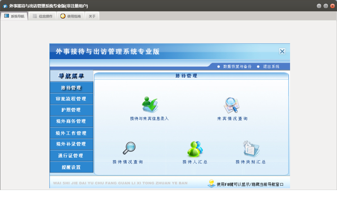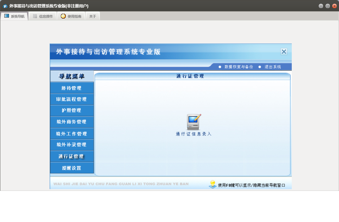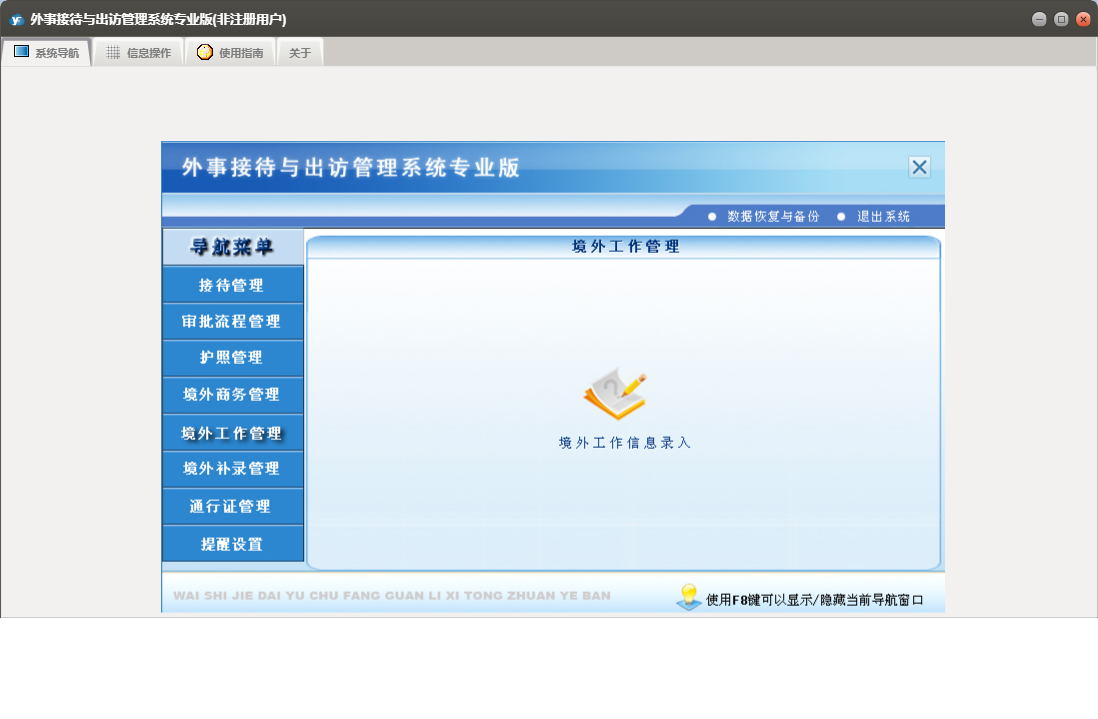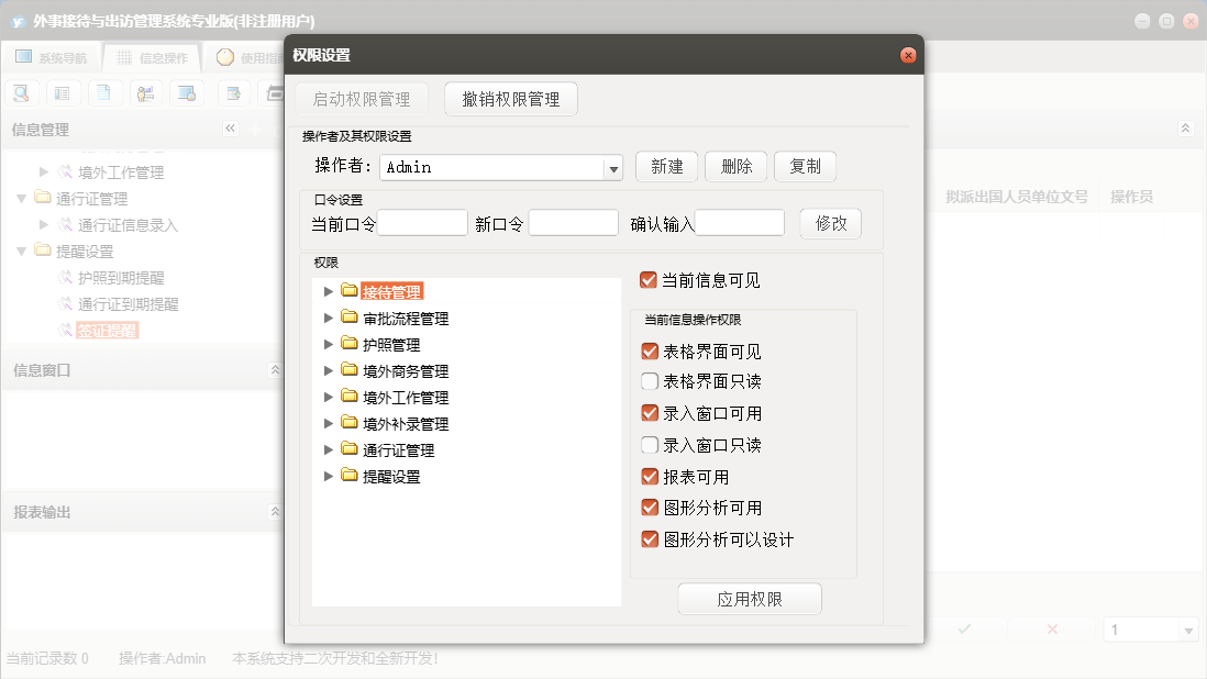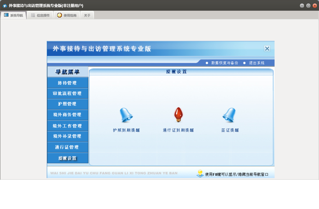 外事接待与出访管理系统专业版包含以下功能:提醒管理、境外补录管理、审批流程信息录入、境外工作管理、护照信息录入、权限设置、境外工作信息录入、境外商务管理、接待与来宾信息录入、批次护照信息录入、通行证管理、接待管理、关于、审批流程管理、通行证信息录入、日志、护照信息查询、商务出国信息录入、护照管理等