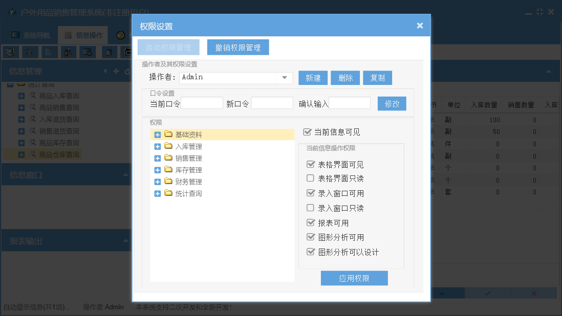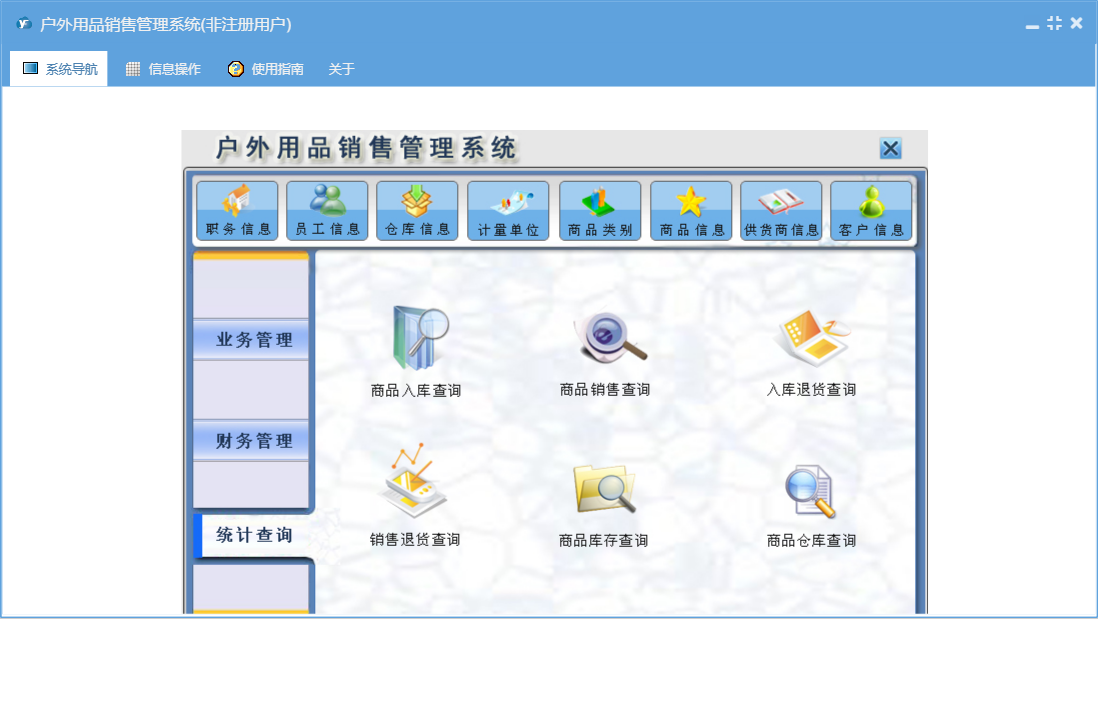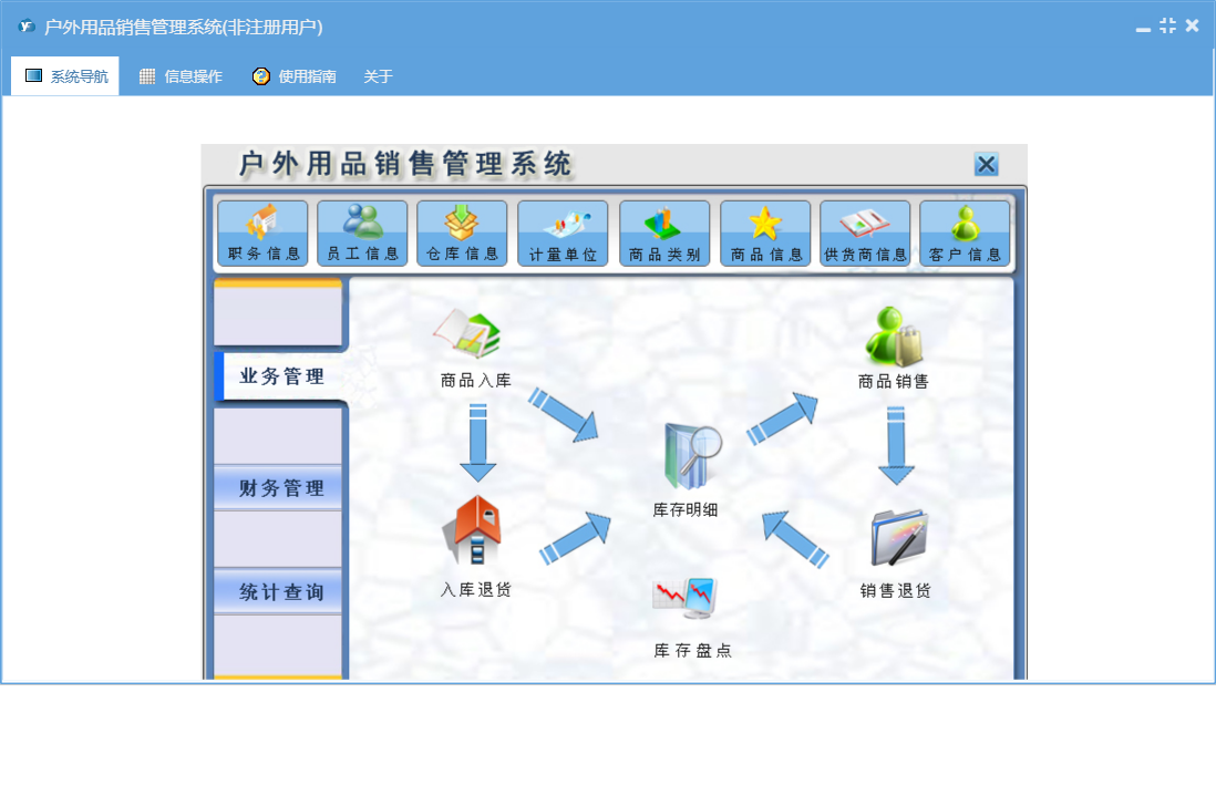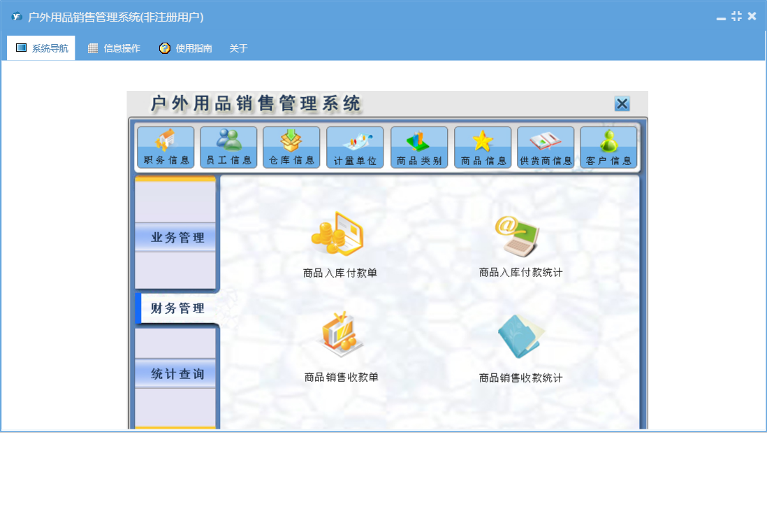 户外用品销售管理系统包含以下功能:财务管理、商品信息、商品入库付款单、商品类别、销售退货、统计查询、权限设置、仓库信息、商品入库、入库退货、商品销售收款单、关于、客户信息、业务管理、商品销售、库存盘点、员工信息、职务信息、供货商信息、日志、计量单位等