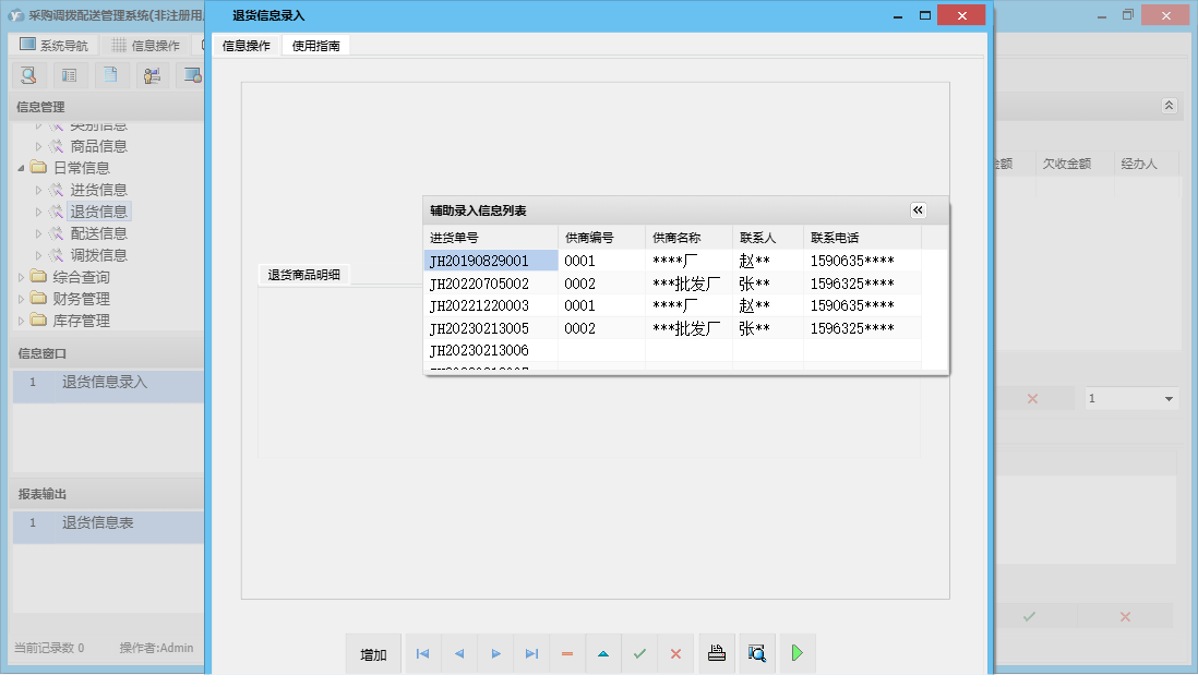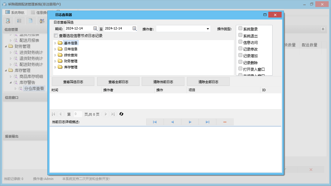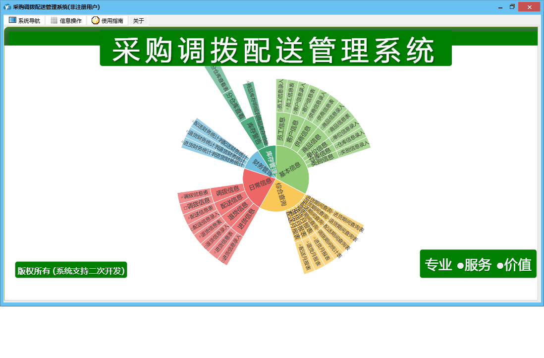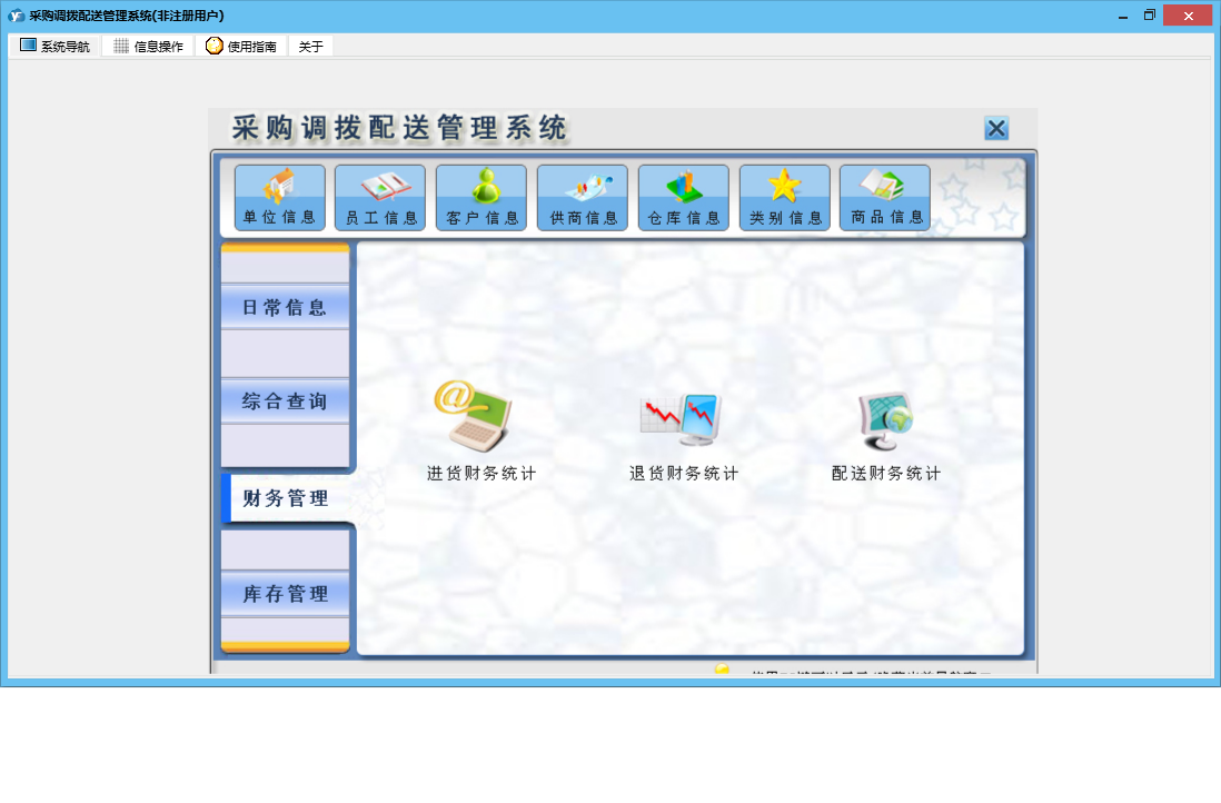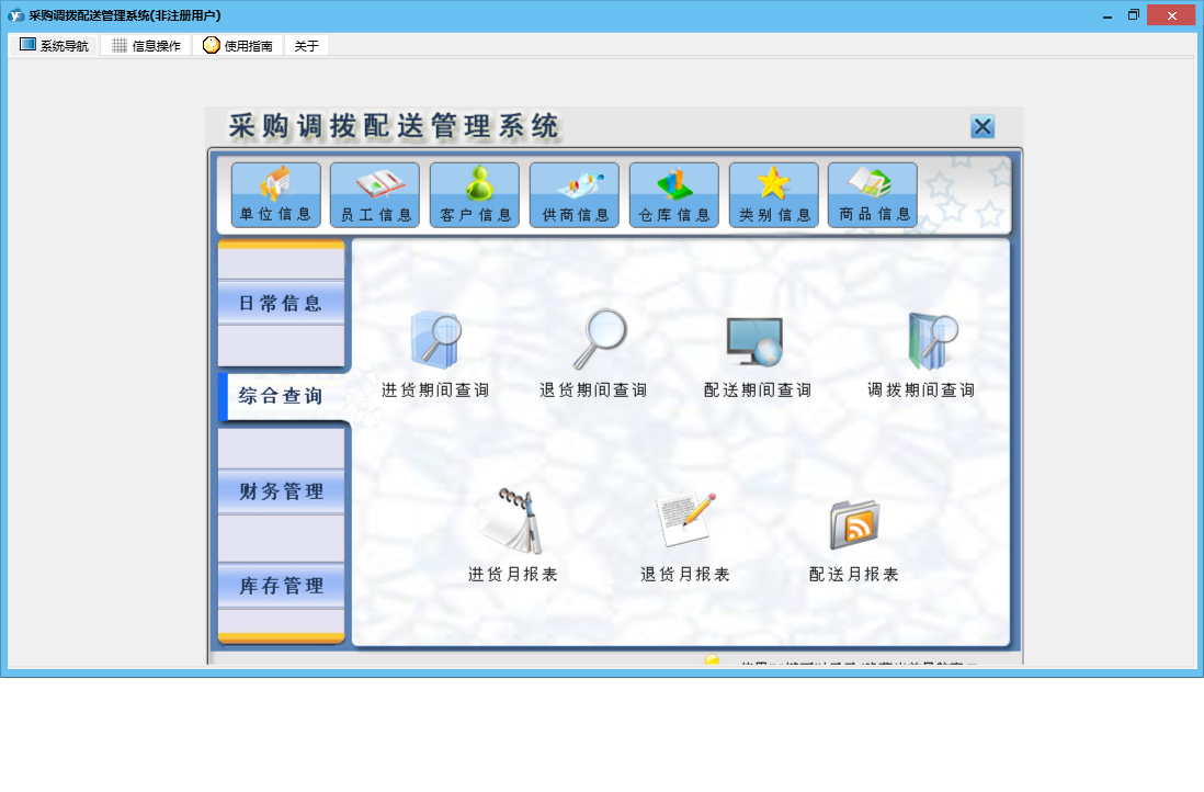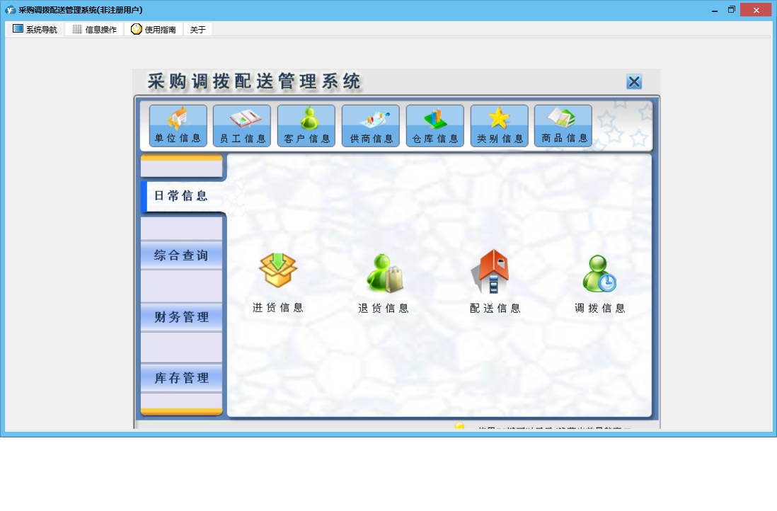 采购调拨配送管理系统包含以下功能:单位信息、商品信息、员工信息、退货信息、配送信息、日志、库存管理、关于、综合查询、权限设置、类别信息、进货信息、客户信息、调拨信息、日常信息、财务管理、仓库信息、供商信息等