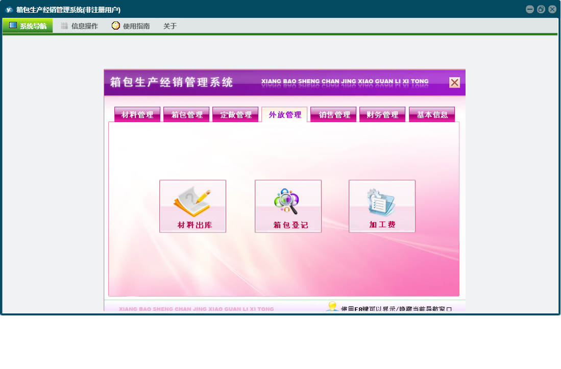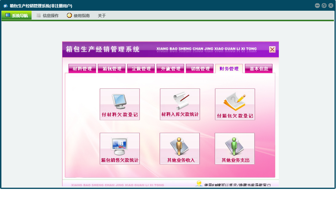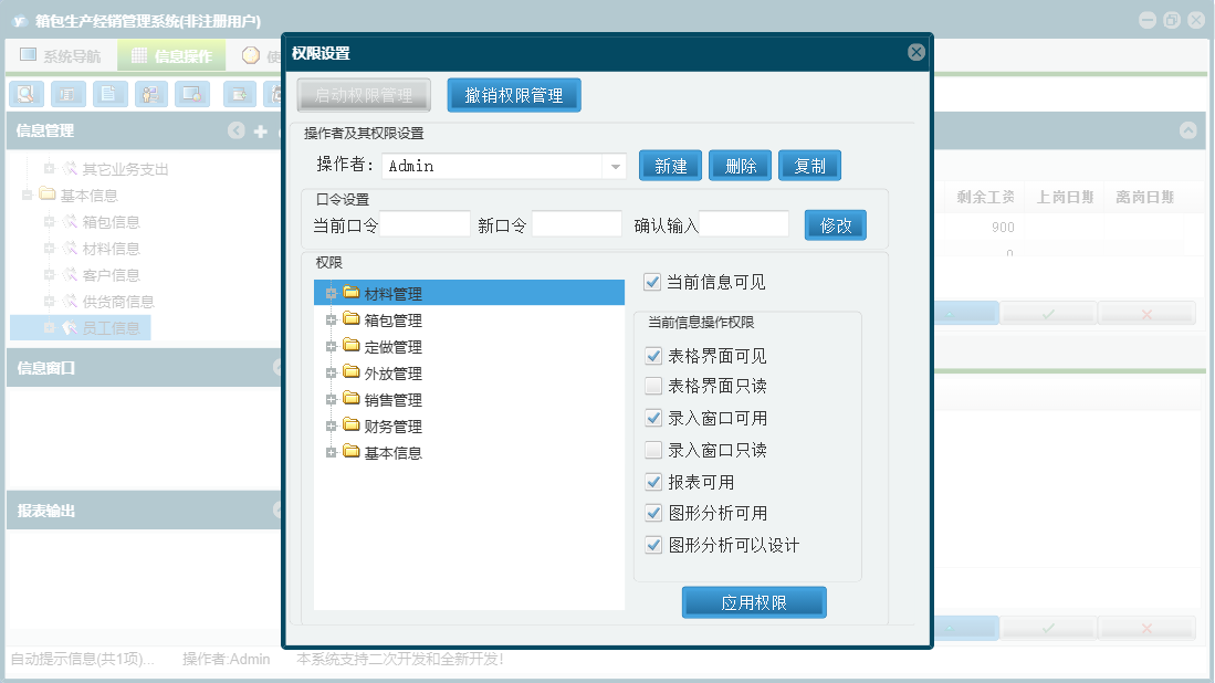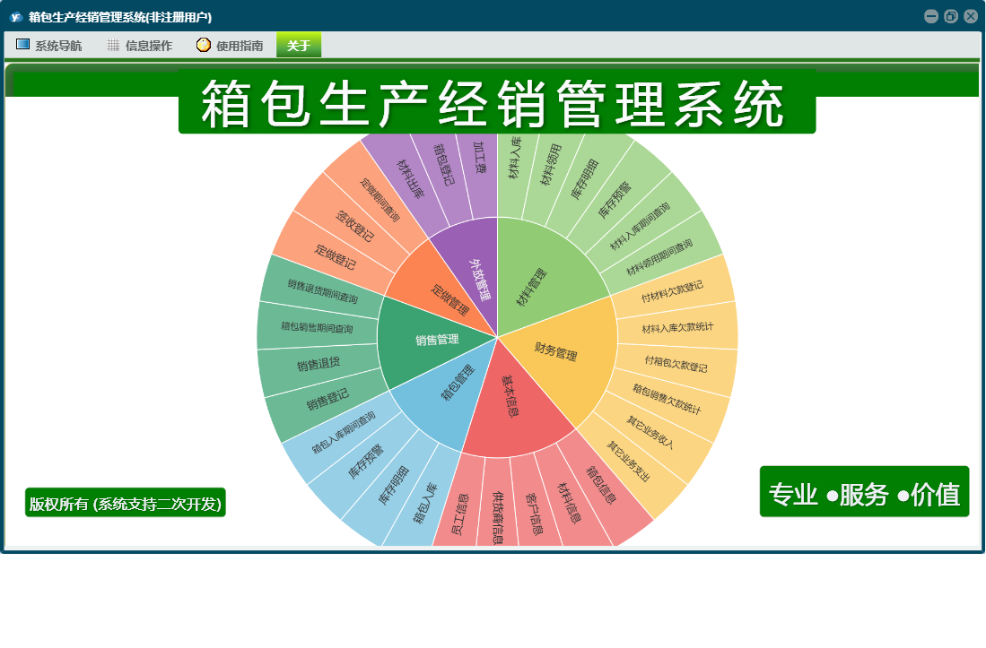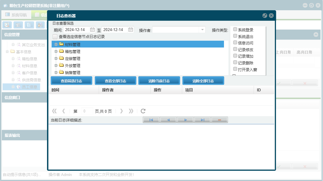 箱包生产经销管理系统包含以下功能:销售管理、签收登记、加工费、财务管理、付材料欠款登记、外放管理、付箱包欠款登记、材料信息、销售退货、其它业务支出、权限设置、定做登记、箱包登记、材料领用、材料出库、箱包信息、关于、材料管理、销售登记、基本信息、客户信息、材料入库、箱包入库、员工信息、供货商信息、日志、定做管理、箱包管理、其它业务收入等