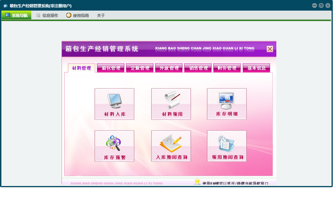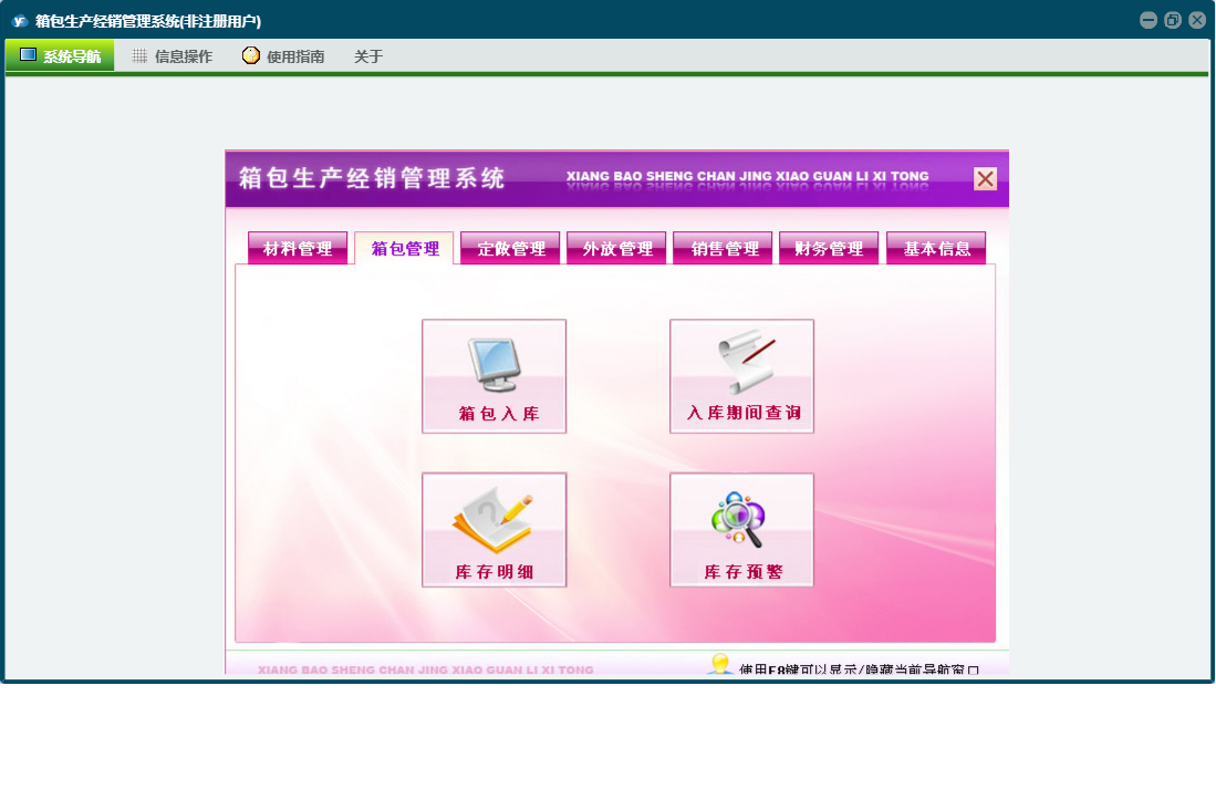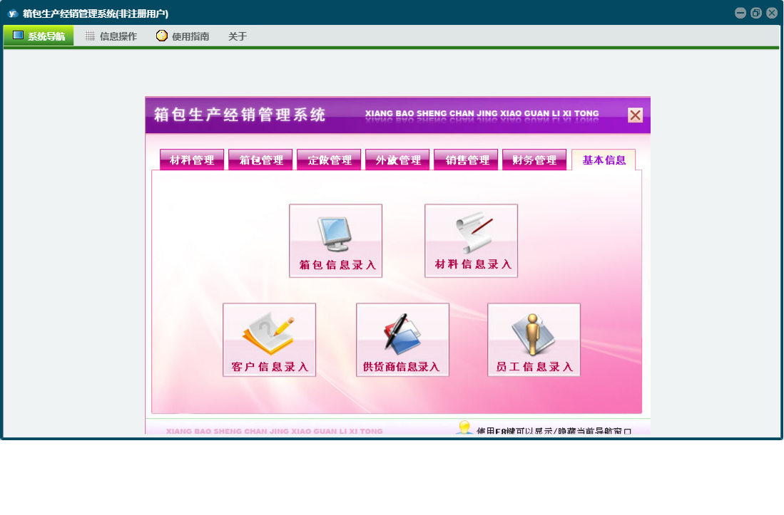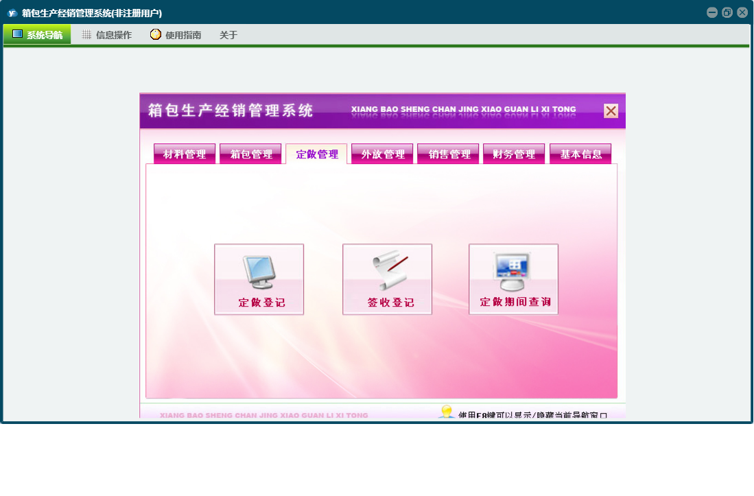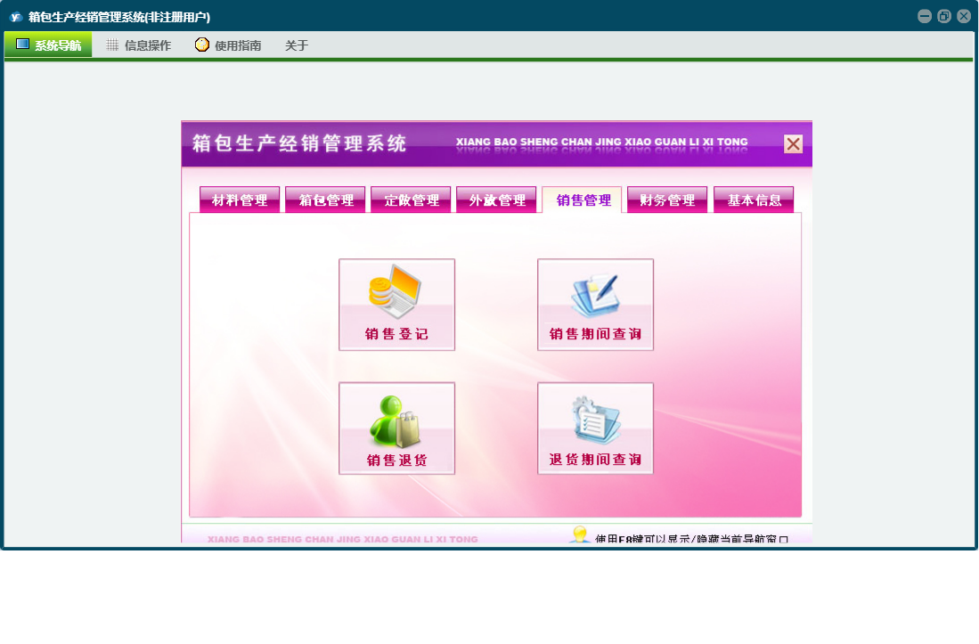 箱包生产经销管理系统包含以下功能:销售管理、签收登记、加工费、财务管理、付材料欠款登记、外放管理、付箱包欠款登记、材料信息、销售退货、其它业务支出、权限设置、定做登记、箱包登记、材料领用、材料出库、箱包信息、关于、材料管理、销售登记、基本信息、客户信息、材料入库、箱包入库、员工信息、供货商信息、日志、定做管理、箱包管理、其它业务收入等
