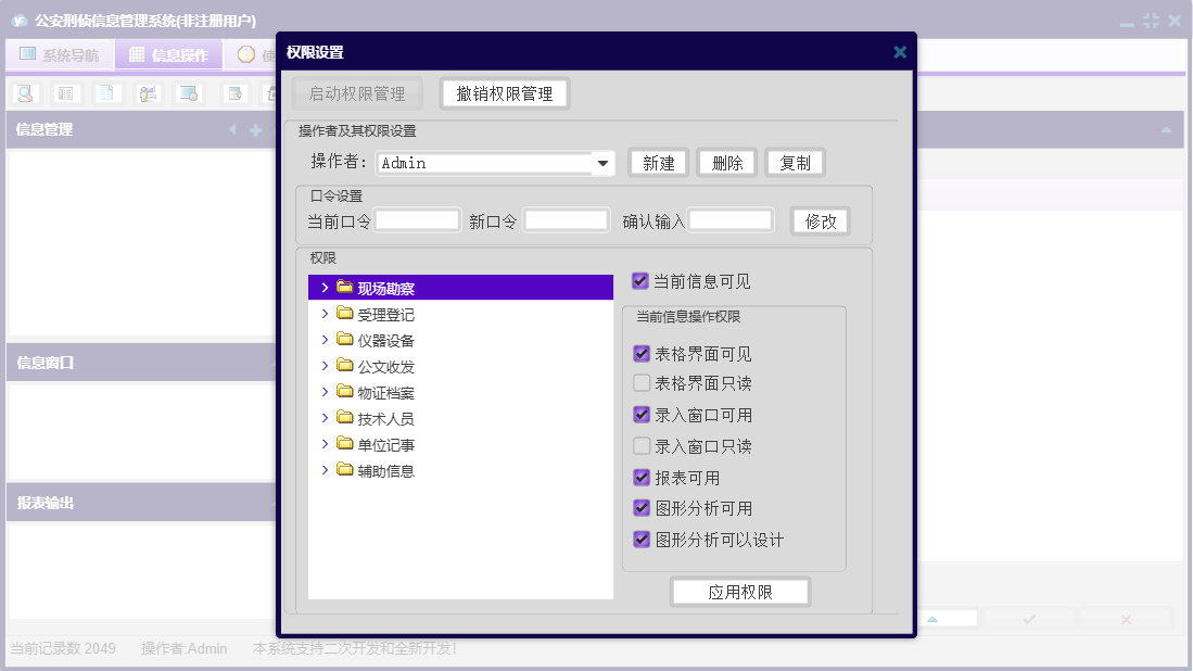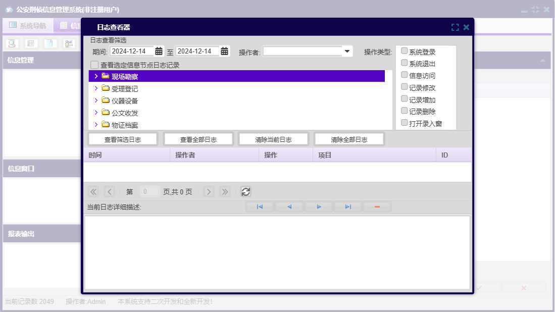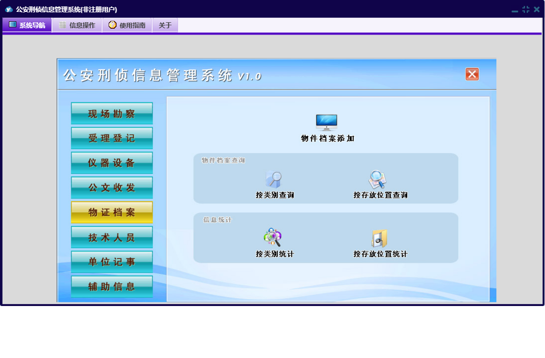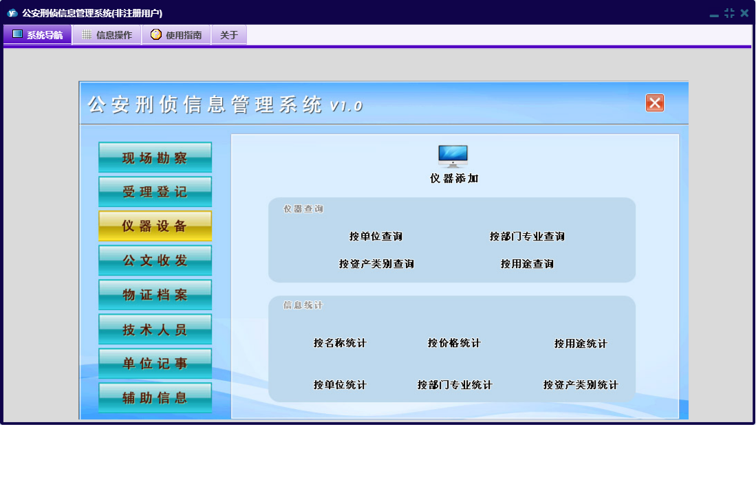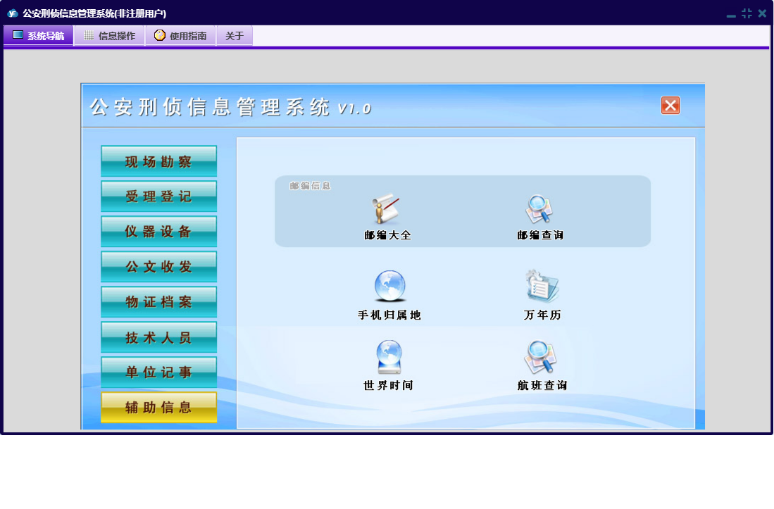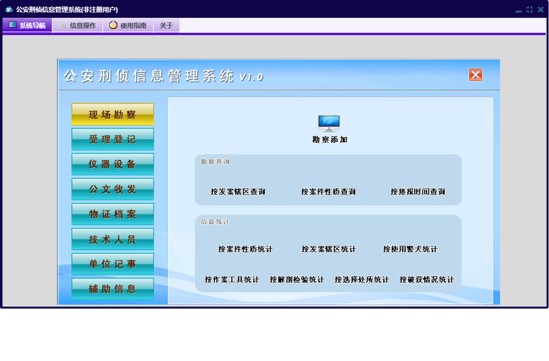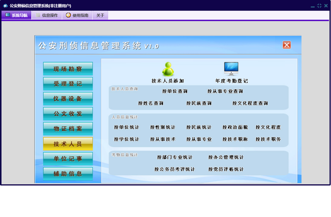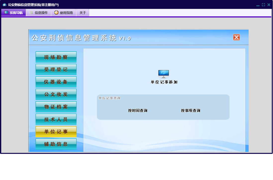公安刑侦信息管理系统包含以下功能:按公文种类查询、辅助信息、按案件性质查询、公文添加、受理添加、按时间查询、按文化程度查询、按存放位置查询、公文收发、单位记事、按姓名查询、受理登记、勘察添加、按民族查询、技术人员、权限设置、按发案辖区查询、按资产类别查询、仪器添加、按事项查询、技术人员添加、单位记事添加、按类别查询、按送检单位查询、按部门专业查询、按从事专业查询、关于、仪器设备、按用途查询、按受理类别查询、物证档案添加、日志、年度考勤登记、按接报时间查询、按受理时间查询、物证档案、现场勘察、按收发时间查询、按单位查询等