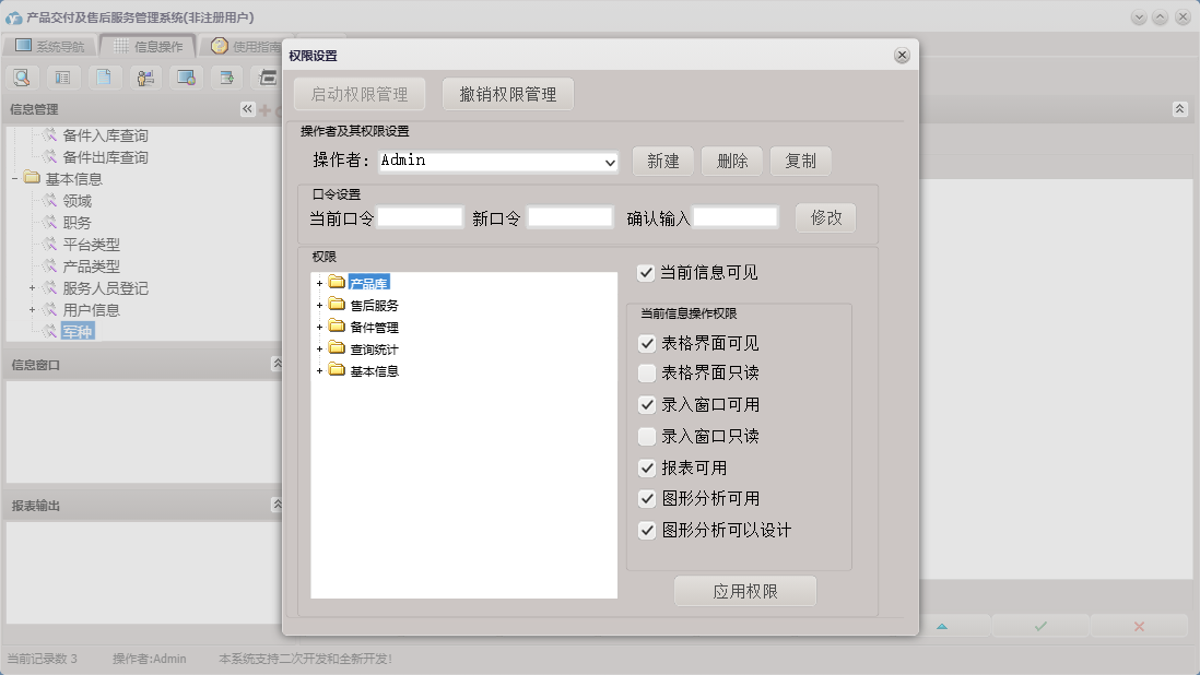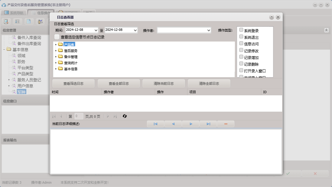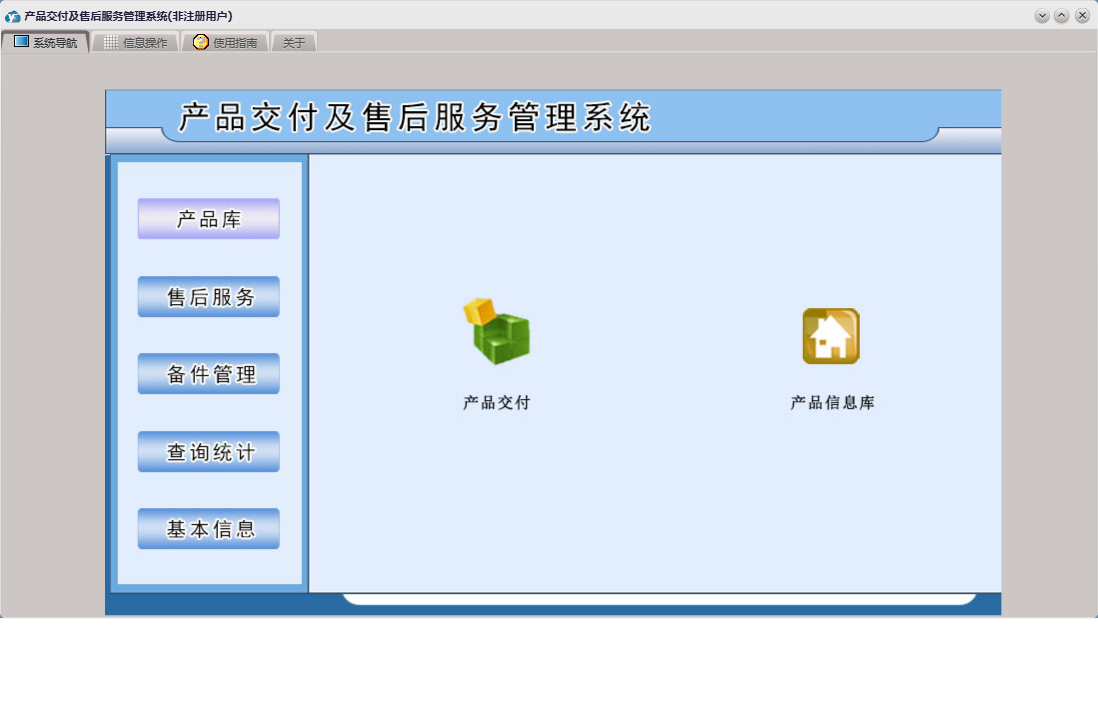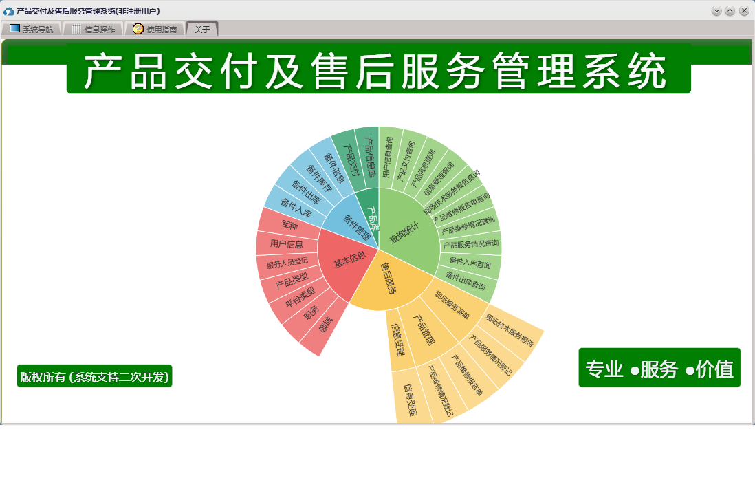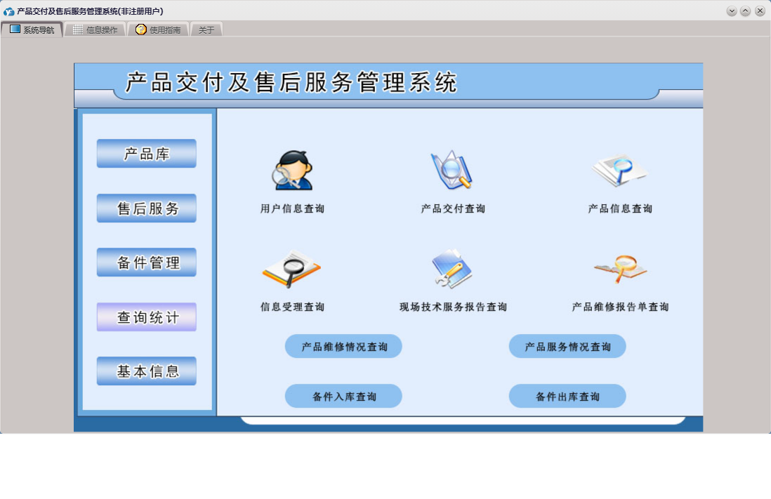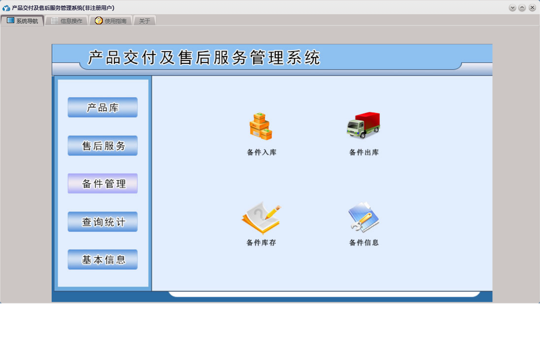 产品交付及售后服务管理系统包含以下功能:查询统计、备件信息、产品库、现场技术服务报告、售后服务、备件出库、产品服务情况登记、服务人员登记、产品维修报告单、信息受理、权限设置、产品信息库、关于、基本信息、产品维修情况登记、备件管理、用户信息、日志、产品交付、备件入库等