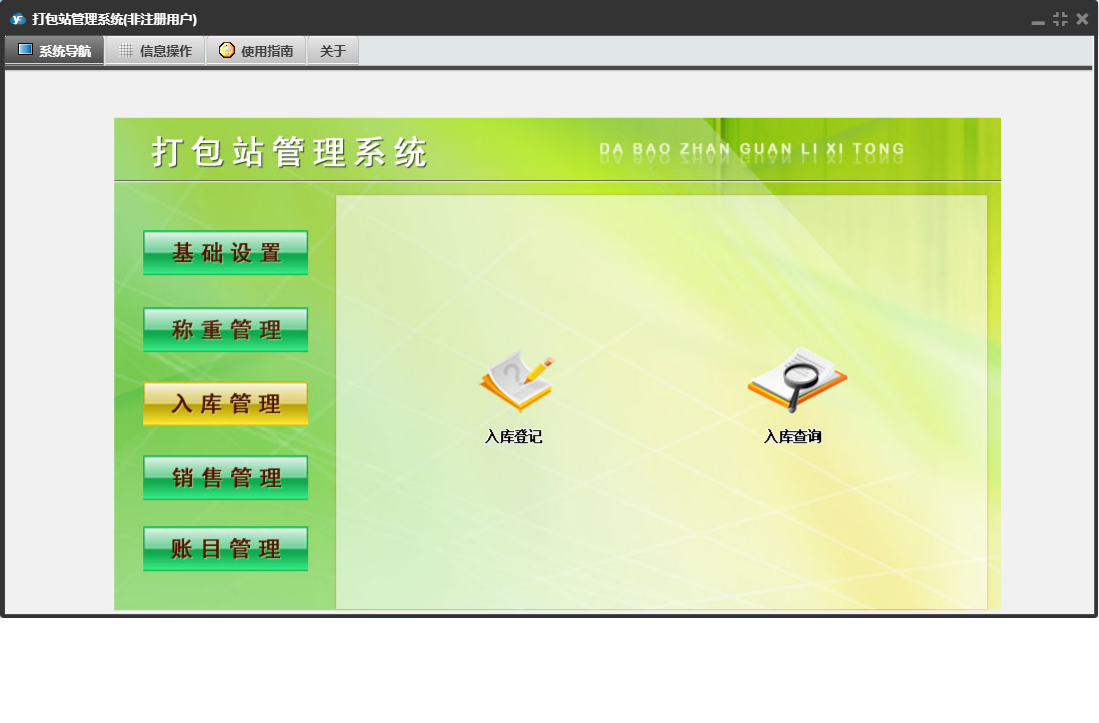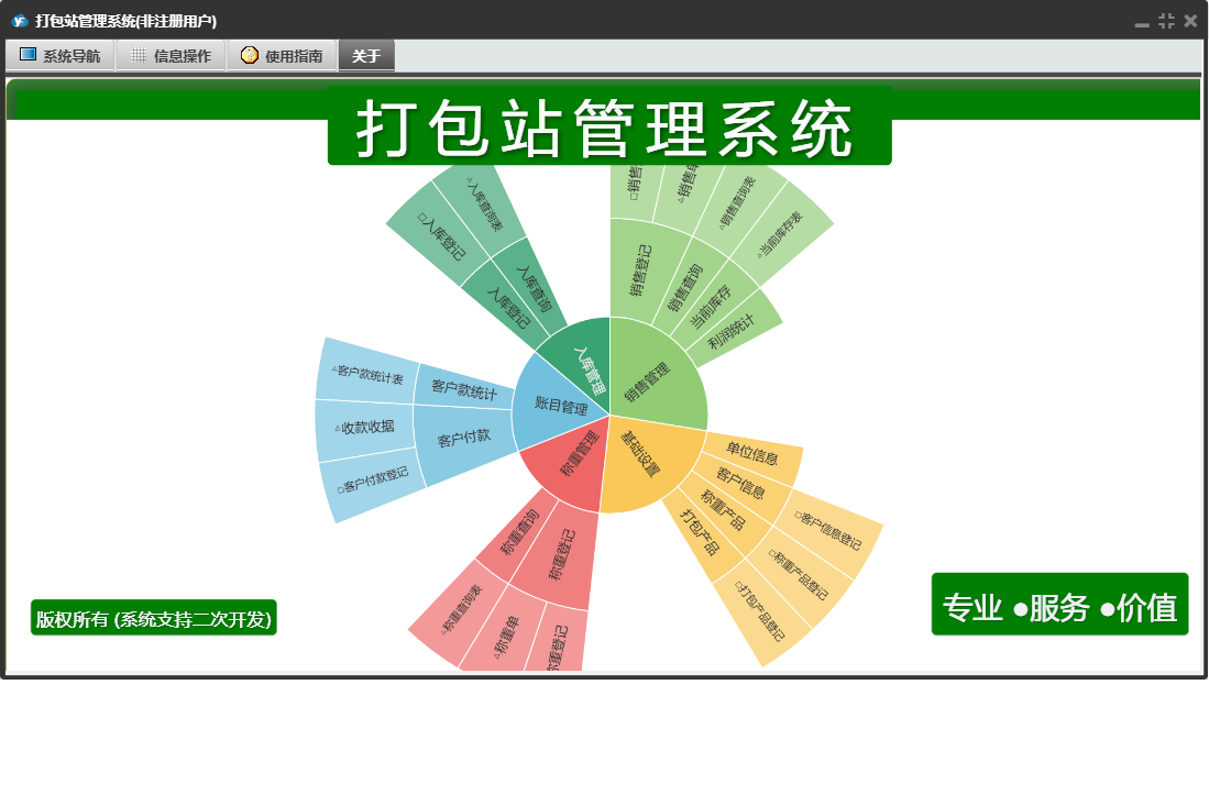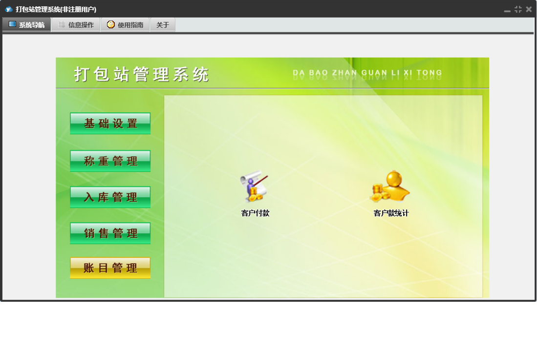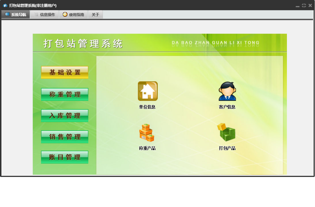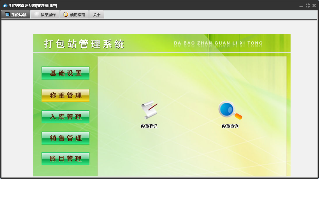 打包站管理系统包含以下功能:称重登记、称重管理、入库管理、基础设置、称重产品、销售管理、客户付款、入库登记、日志、账目管理、打包产品、关于、销售登记、权限设置、客户信息等
