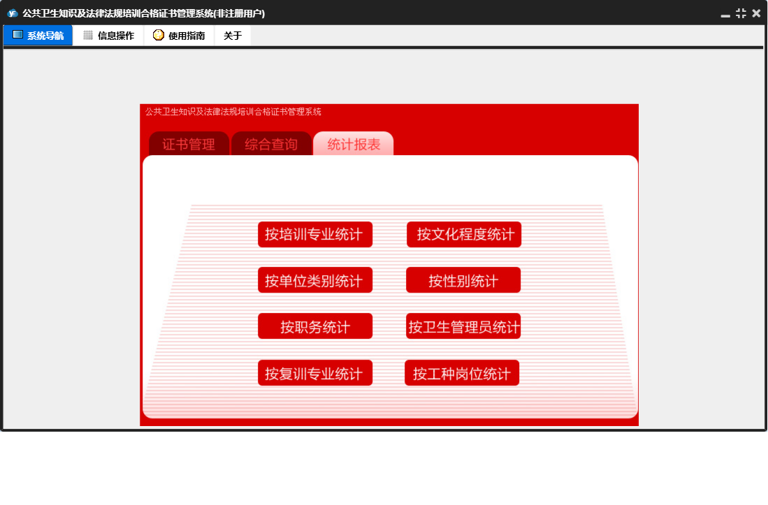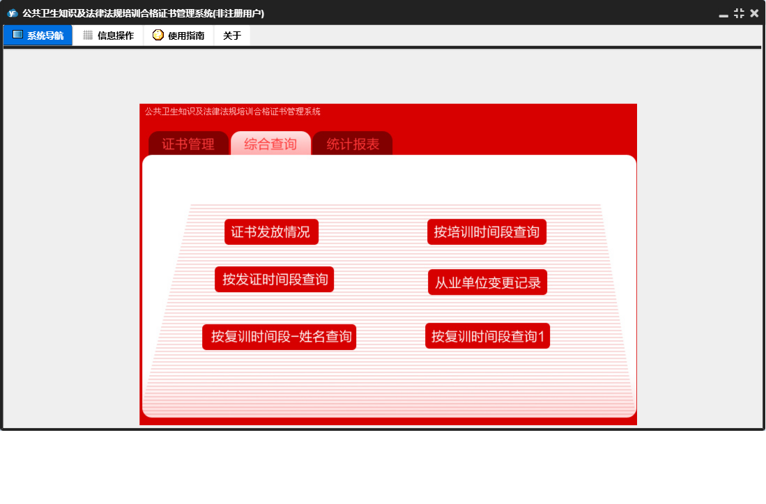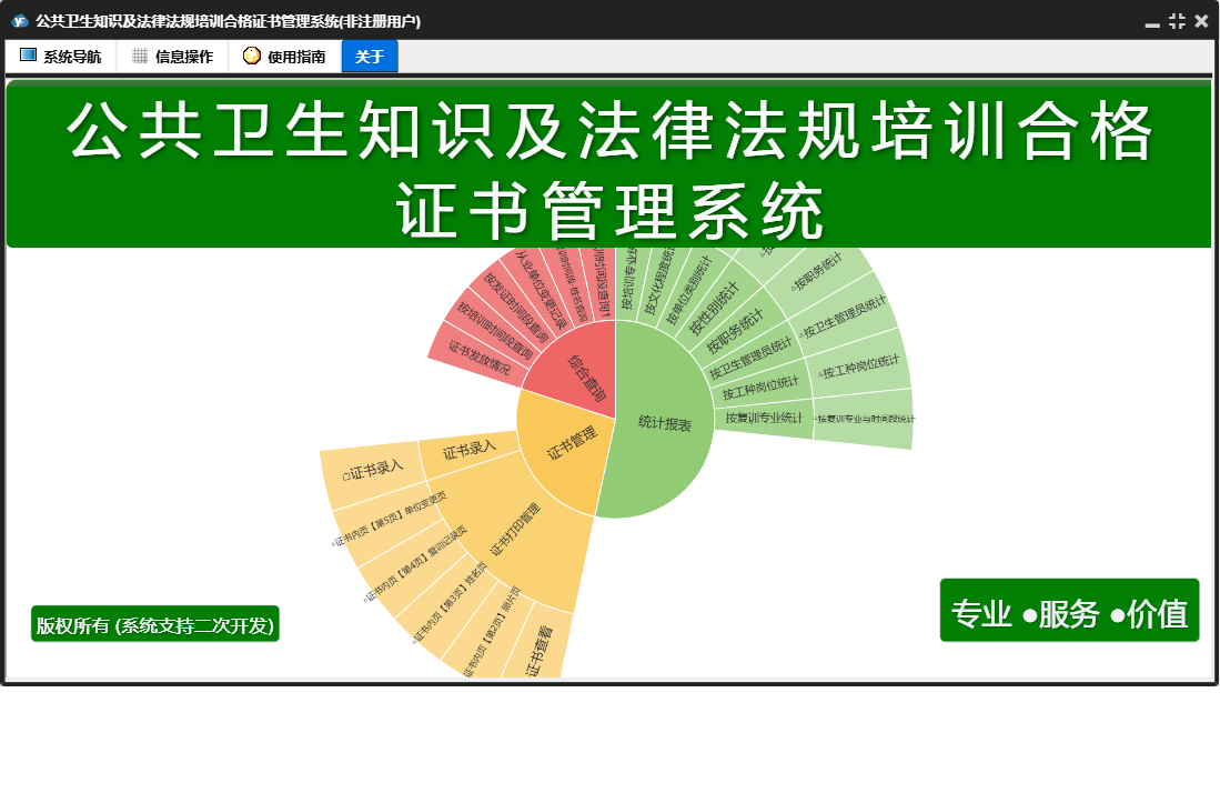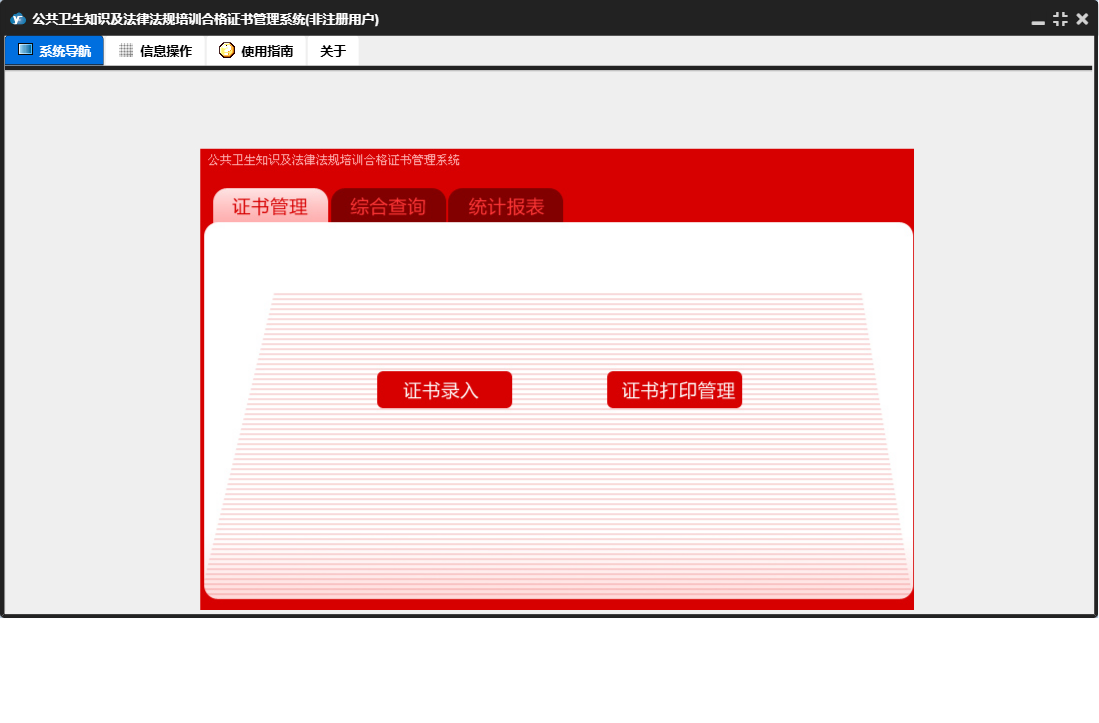公共卫生知识及法律法规培训合格证书管理系统包含以下功能:证书录入、证书管理、日志、证书打印管理、关于、权限设置、统计、综合查询等