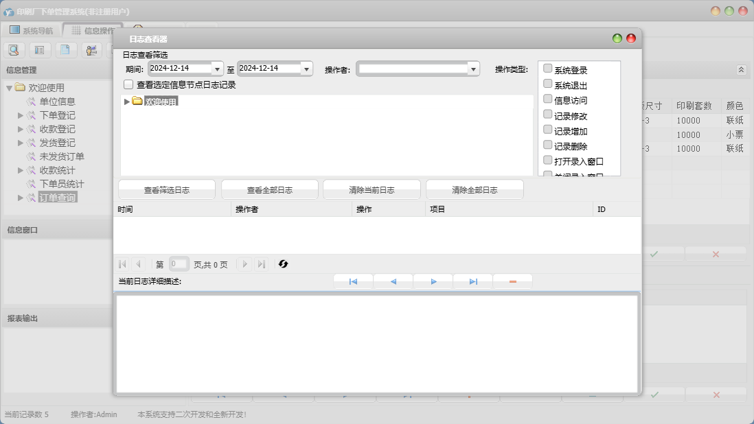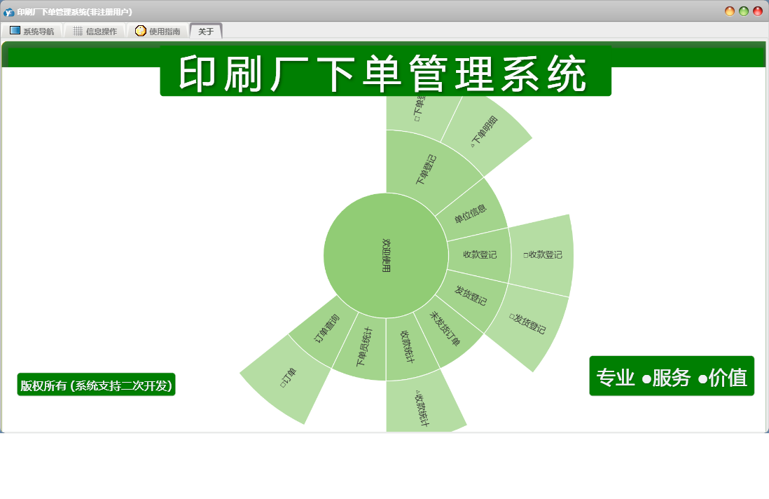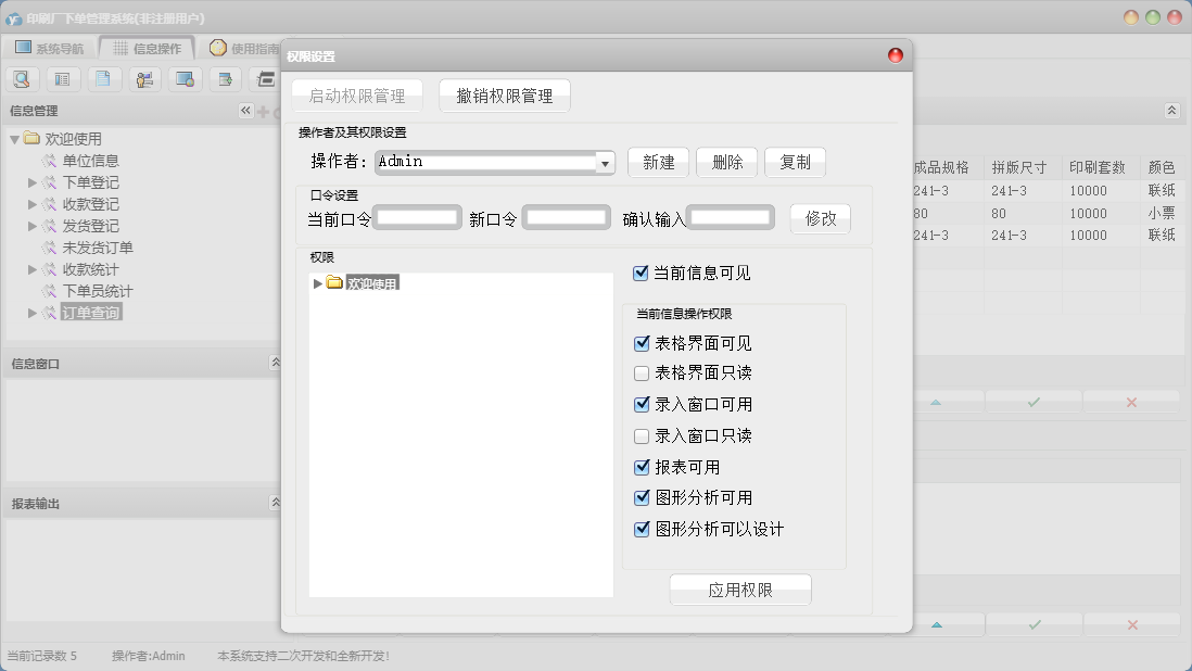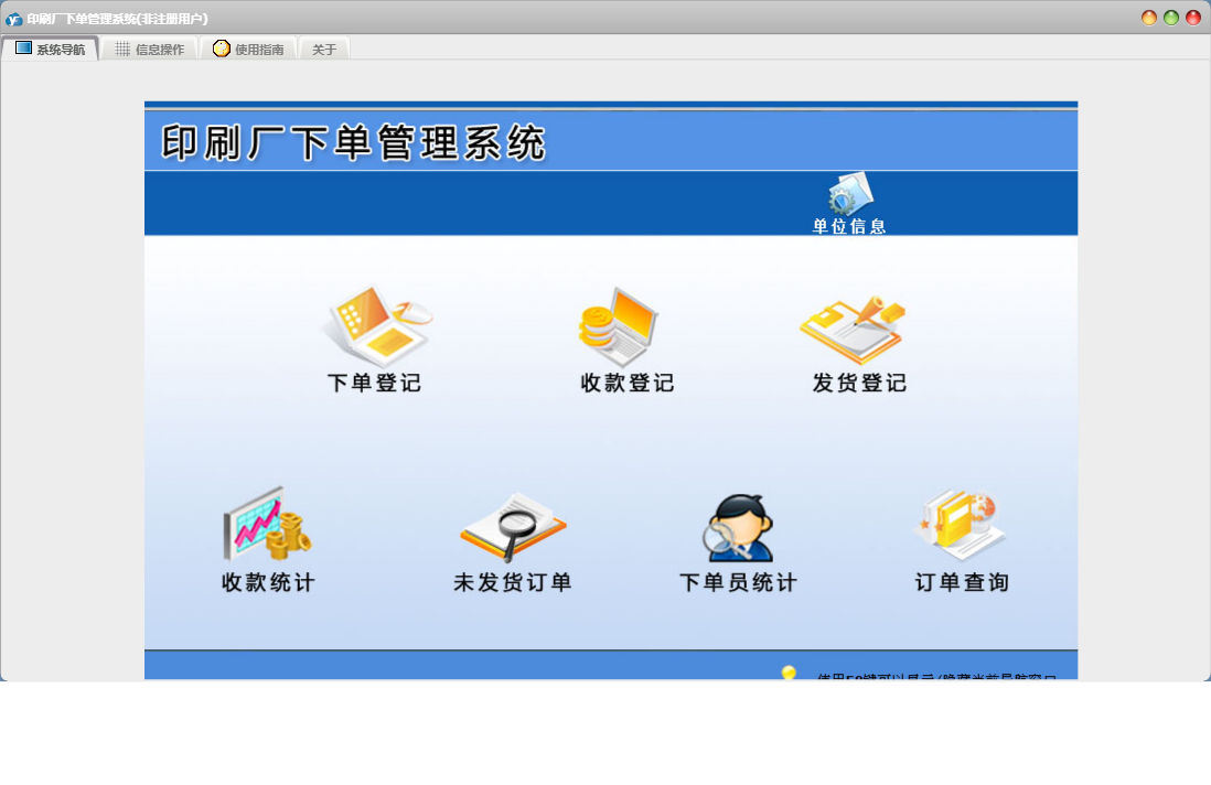 印刷厂下单管理系统包含以下功能:下单登记、订单查询、面板、日志、关于、发货登记、权限设置、收款登记等