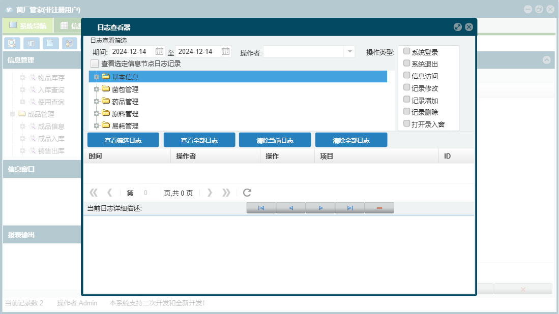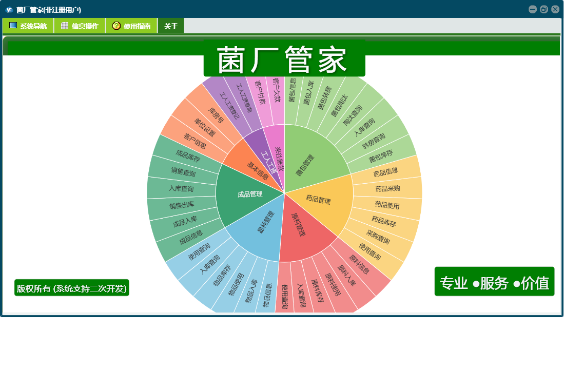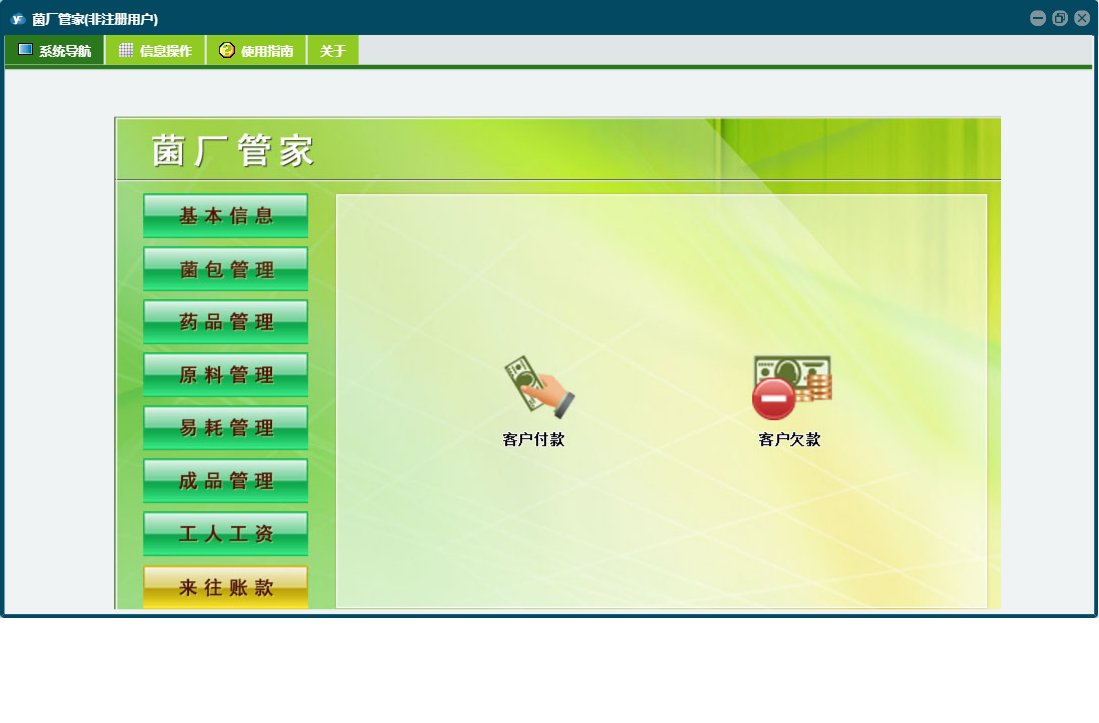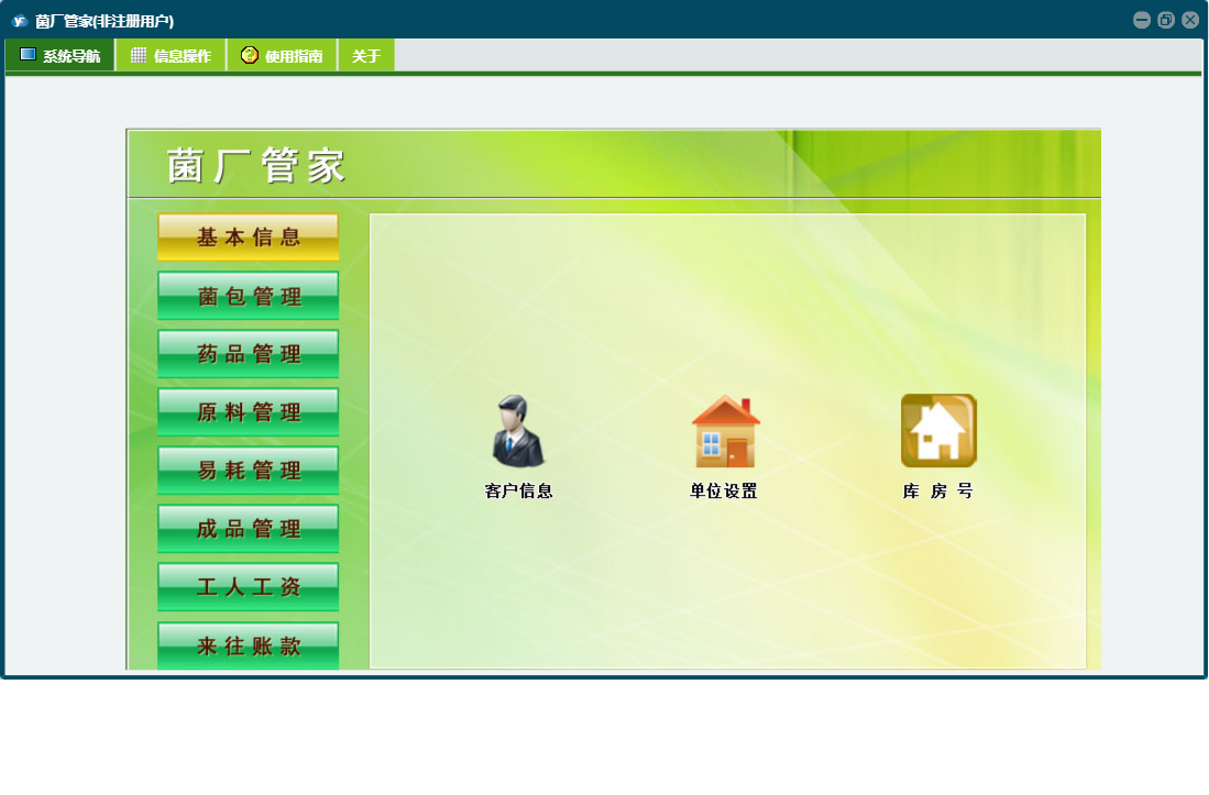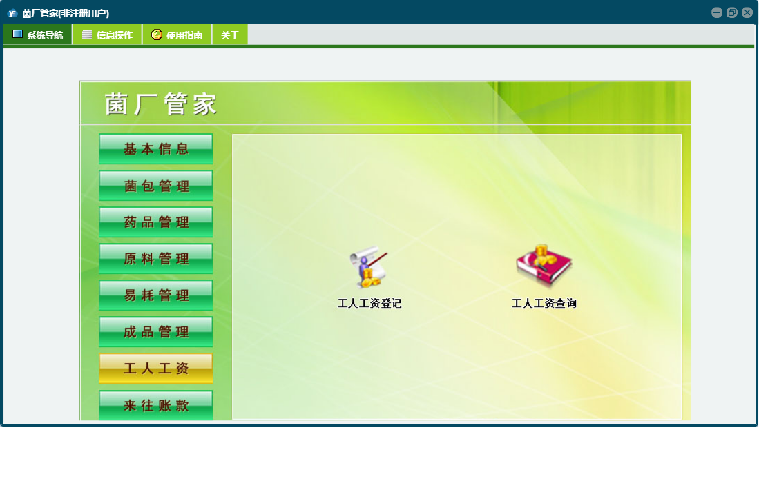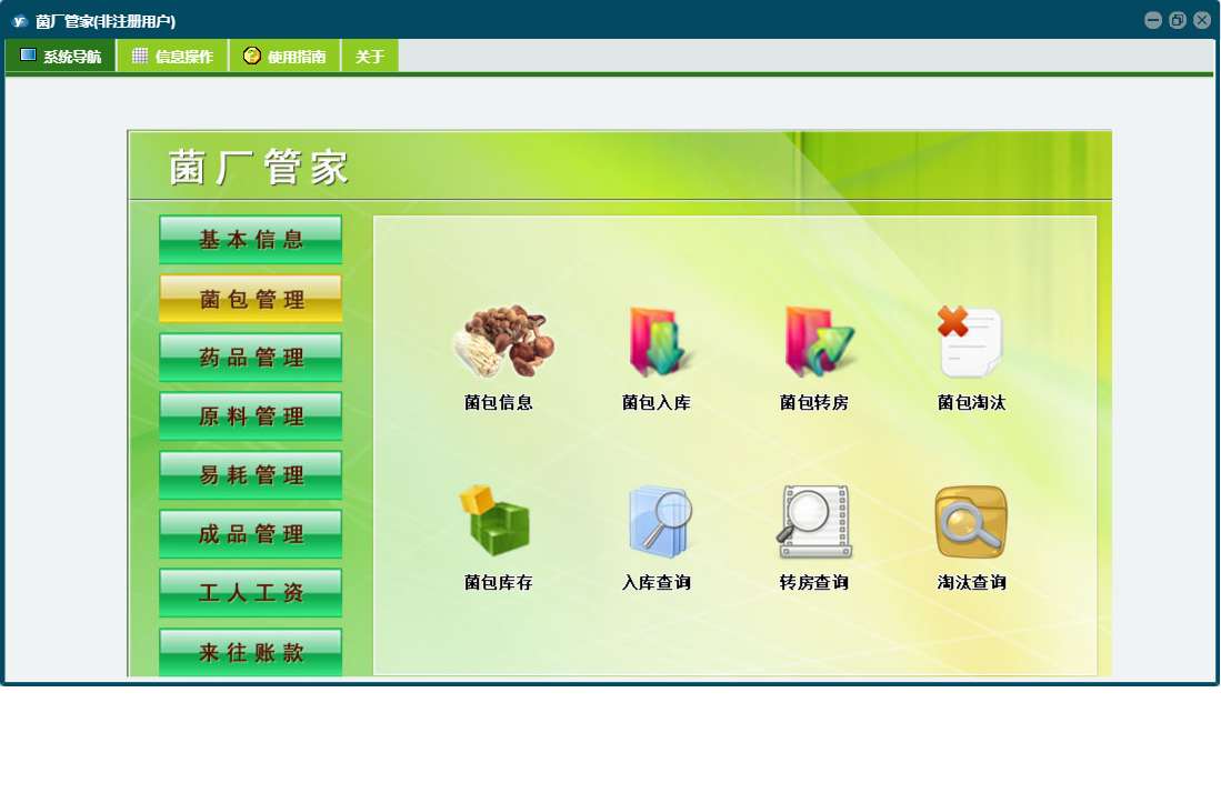 菌厂管家包含以下功能:菌包转房、工人工资登记、成品管理、药品管理、原料入库、药品使用、成品信息、成品入库、菌包入库、药品采购、菌包信息、原料使用、权限设置、销售出库、物品使用、原料管理、药品信息、原料信息、库房号、易耗管理、关于、基本信息、客户信息、物品信息、客户付款、物品入库、工人工资、菌包淘汰、日志、来往账款、菌包管理等